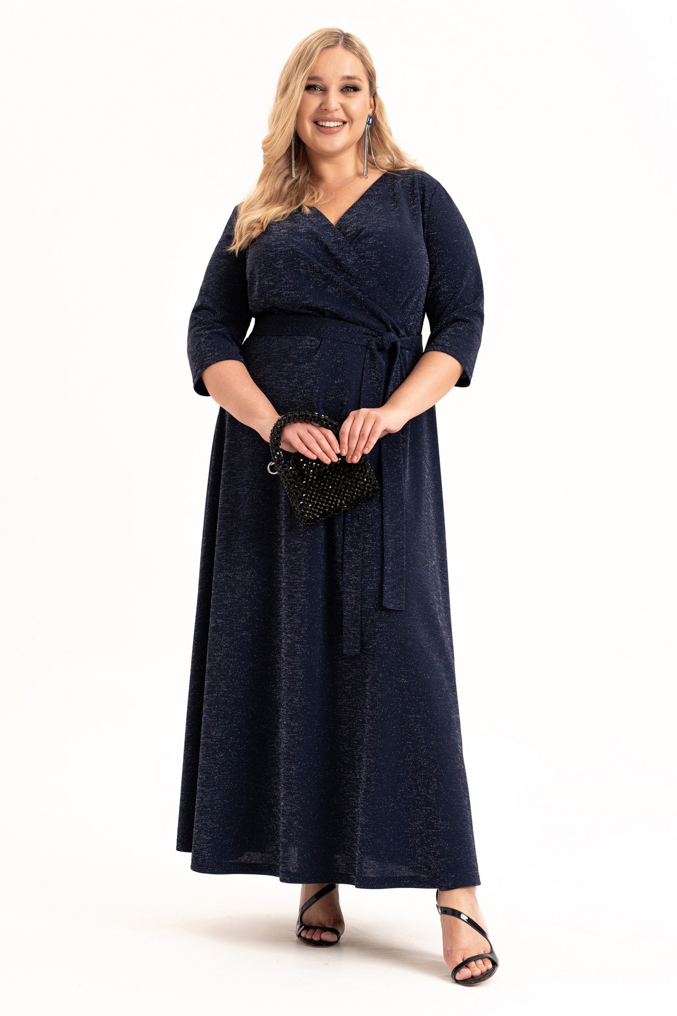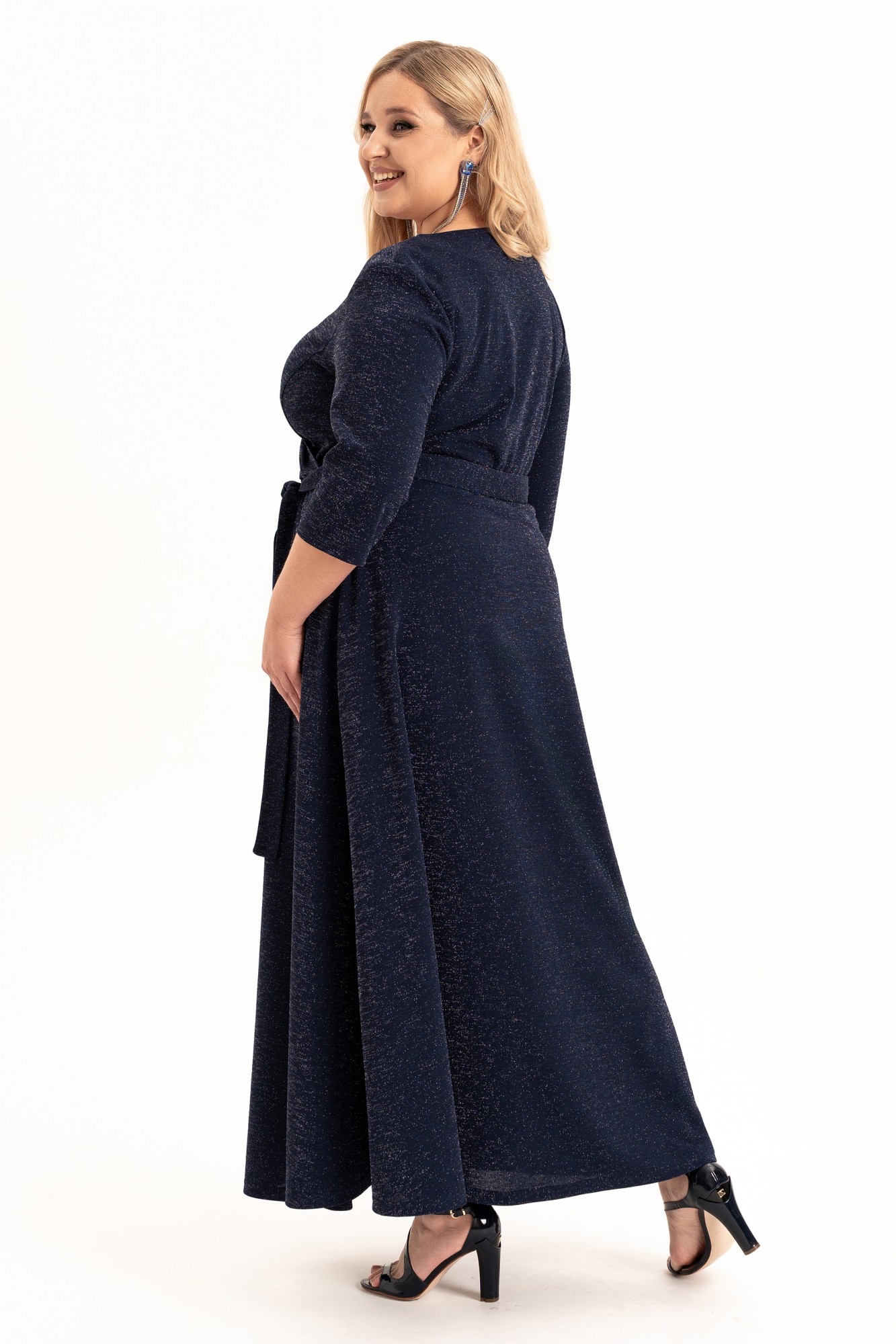 Нарядное платье на запах - это элегантный выбор для любой женщины, подростка или девушки, идеальное сочетание стиля и комфорта. Длинное вечернее платье синего цвета из стрейчевого трикотажного полотна с люрексом. Ткань мягкая, очень приятная к телу. Верхняя часть платья переда и спинки отрезные по линии талии. Лиф переда с эффектным запахом и рельефным бочком. Нижняя часть платья расширена к низу. Рукав втачной, длиной ¾. Платье со съёмным поясом. Съемный пояс и закрытые плечи выгодно подчеркивают женственность фигуры, а рукава длиной три четверти и пикантный V-образный вырез добавляют неповторимости вашему образу. Выполненное из премиальной ткани с блеском, платье представлено в различных размерах. Это универсальное платье подойдет для любого случая: будь то деловая встреча, вечерняя прогулка или особенный праздник. Тренд сезона 2025-2026года. Его можно носить в любое время года, от весны до зимы. Внимание к деталям и трендовый дизайн делают его идеальным выбором для множества мероприятий, включая свадебные фотосессии, ресторанные посиделки или корпоративные вечера. Платье нарядно, кокетливо и подходит как высоким, так и невысоким девушкам. Независимо от вашего стиля или сезона, наше платье будет идеальным выбором.