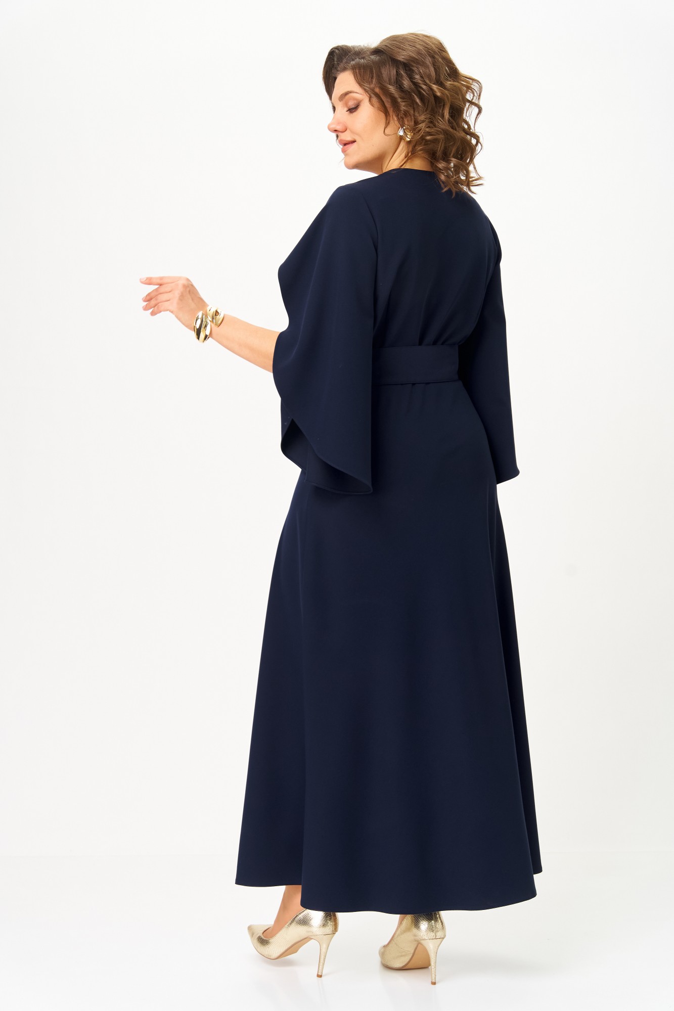 Платье отрезное по линии талии. Полочка с имитацией запаха и складками по линии талии. Горловина V-образной формы. Спинка с талиевыми вытачками. Рукав втачной, объёмный к низу, с драпировкой. Юбка полуприлегающая по бедрам, свободная и широкая по низу. По боковым швам в области талии настрочены шлевки, через которые продет пояс, крепящийся на пуговицу.