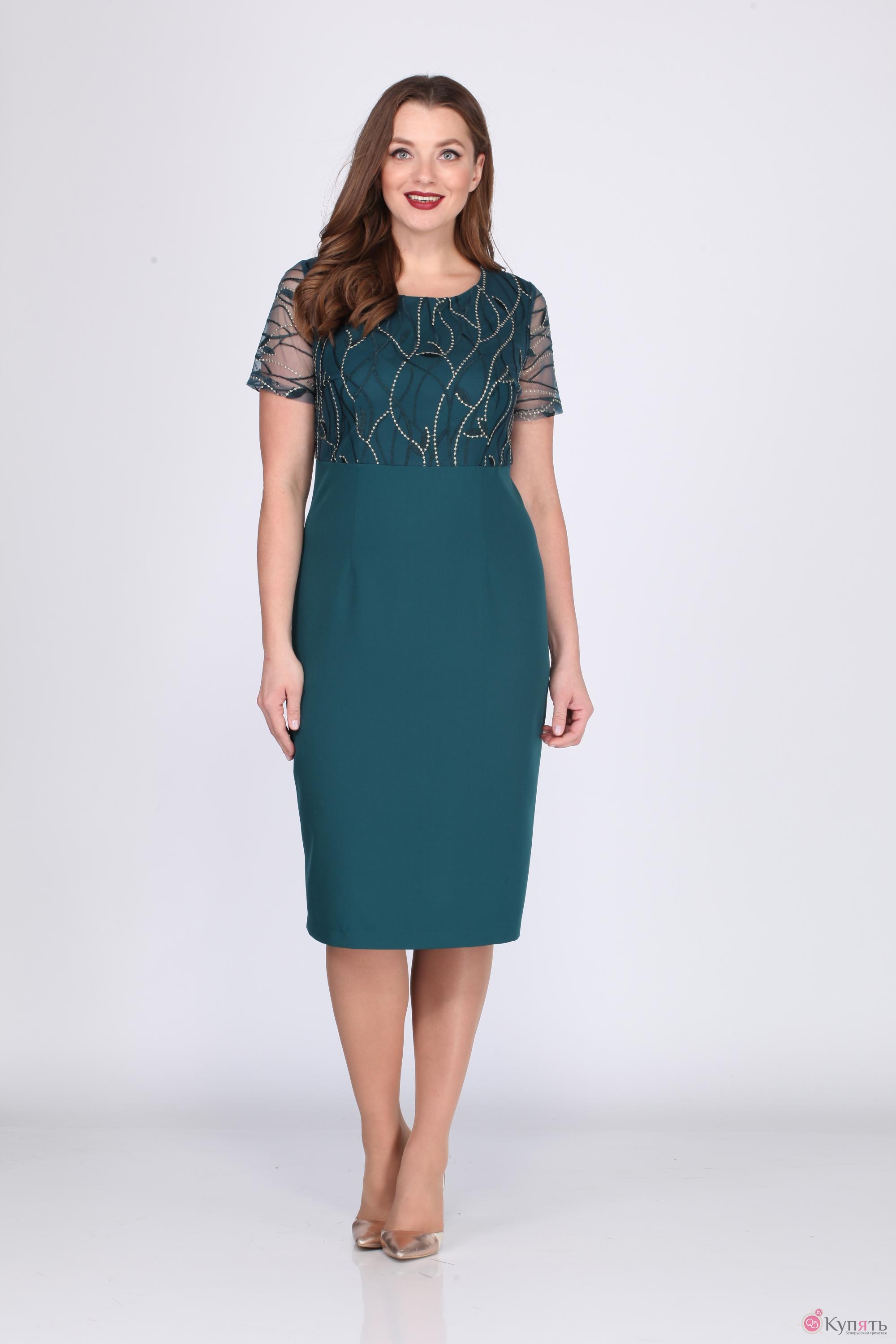 Комплект состоит из платья и накладки. Платье прилегающего силуэта, выполнено из однотонной ткани и гипюра. Накладка фантазийной формы выполнена из однотонного шифона в цвет ткани платья. Платье длиной за колено. Полочка платья с отрезным лифом и слегка завышенной линией подреза. Лиф полочки двухслойный из гипюра и основной ткани платья. Лиф с талиевыми и нагрудными вытачками. Горловина круглой формы. Нижняя часть платья по полочке с талиевыми вытачками. Спинка платья со средним швом, в верхней части которого обработана потайная молния, в нижней части разрез и с талиевыми вытачками. Рукав из гипюра втачной, одношовный, короткий. Платье заужено к низу. Накладка с круглой горловиной, спереди крепящейся на пряжку. На продолжении плечевого шва, в области локтя по руке, обработано овальное отверстие с левой и правой сторон. Накладка полукруглой формы, свободно ниспадающая фалдами по низу.