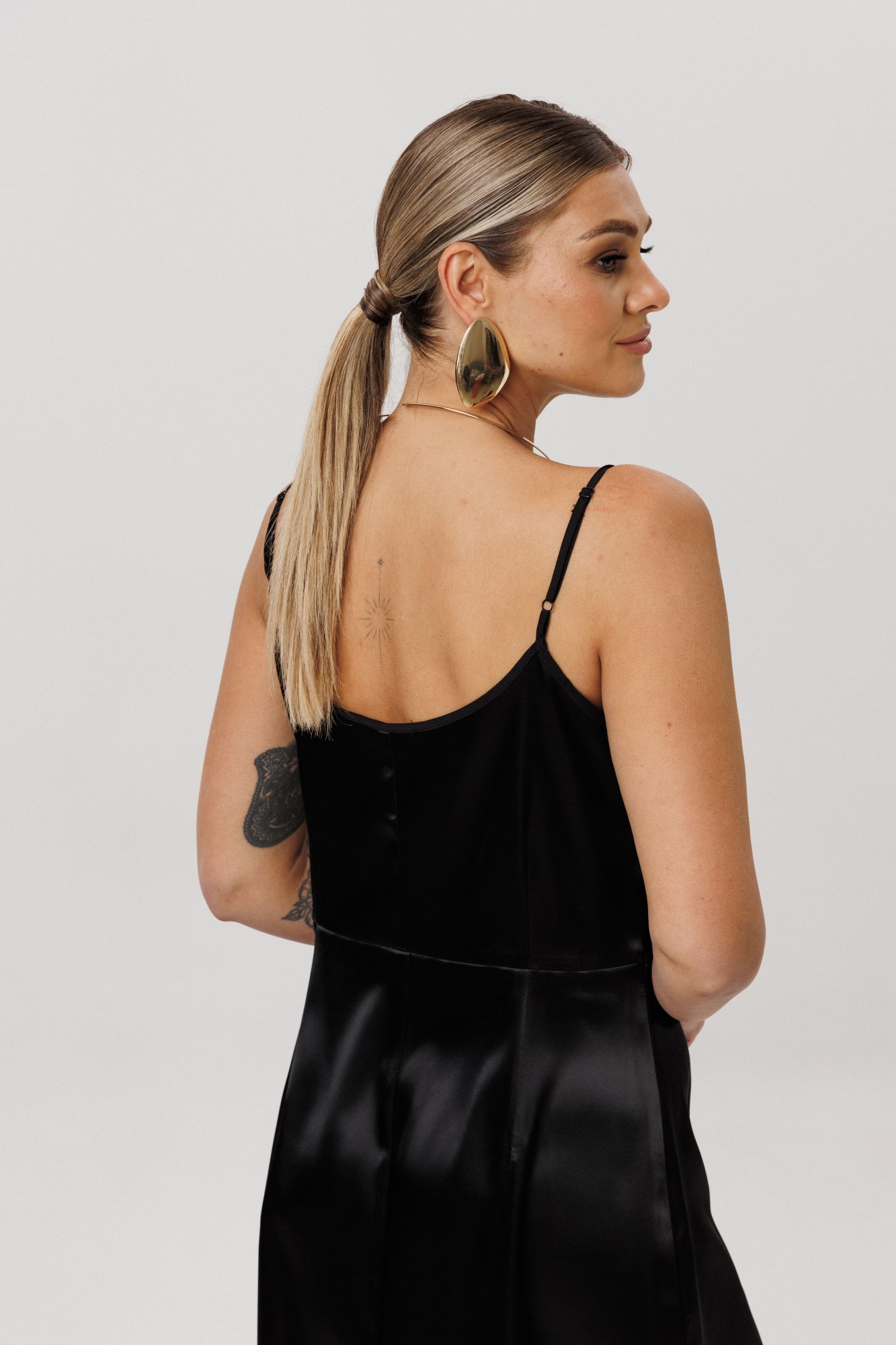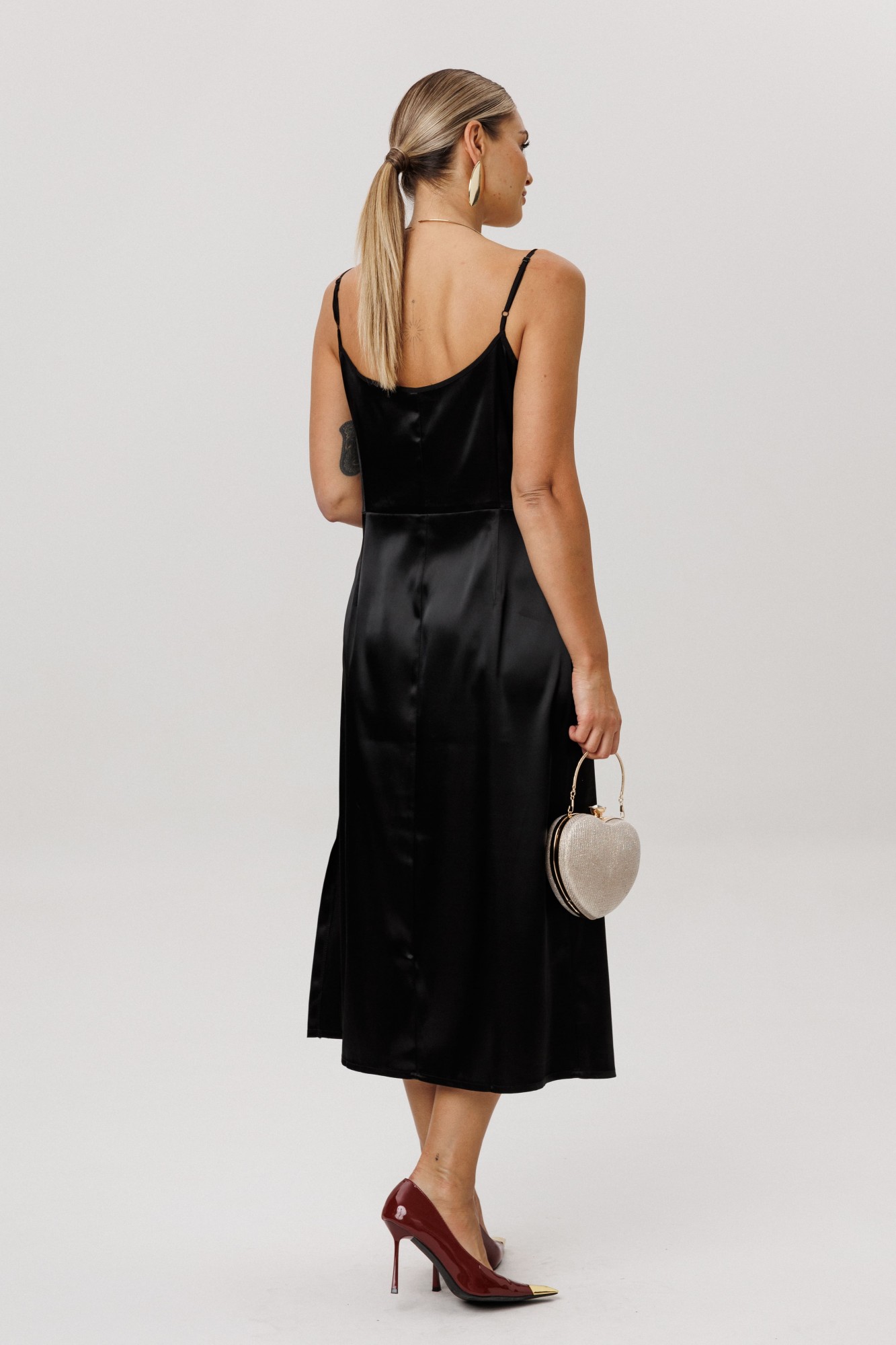 Платье актуальной во все времена длины миди с игривым разрезом изящно струится во время движения, приковывая взгляды. В правом боковом шве спрятана потайная молния. Вырез платья-качели нежно ниспадает, подчеркивая декольте и делая образ соблазнительным.