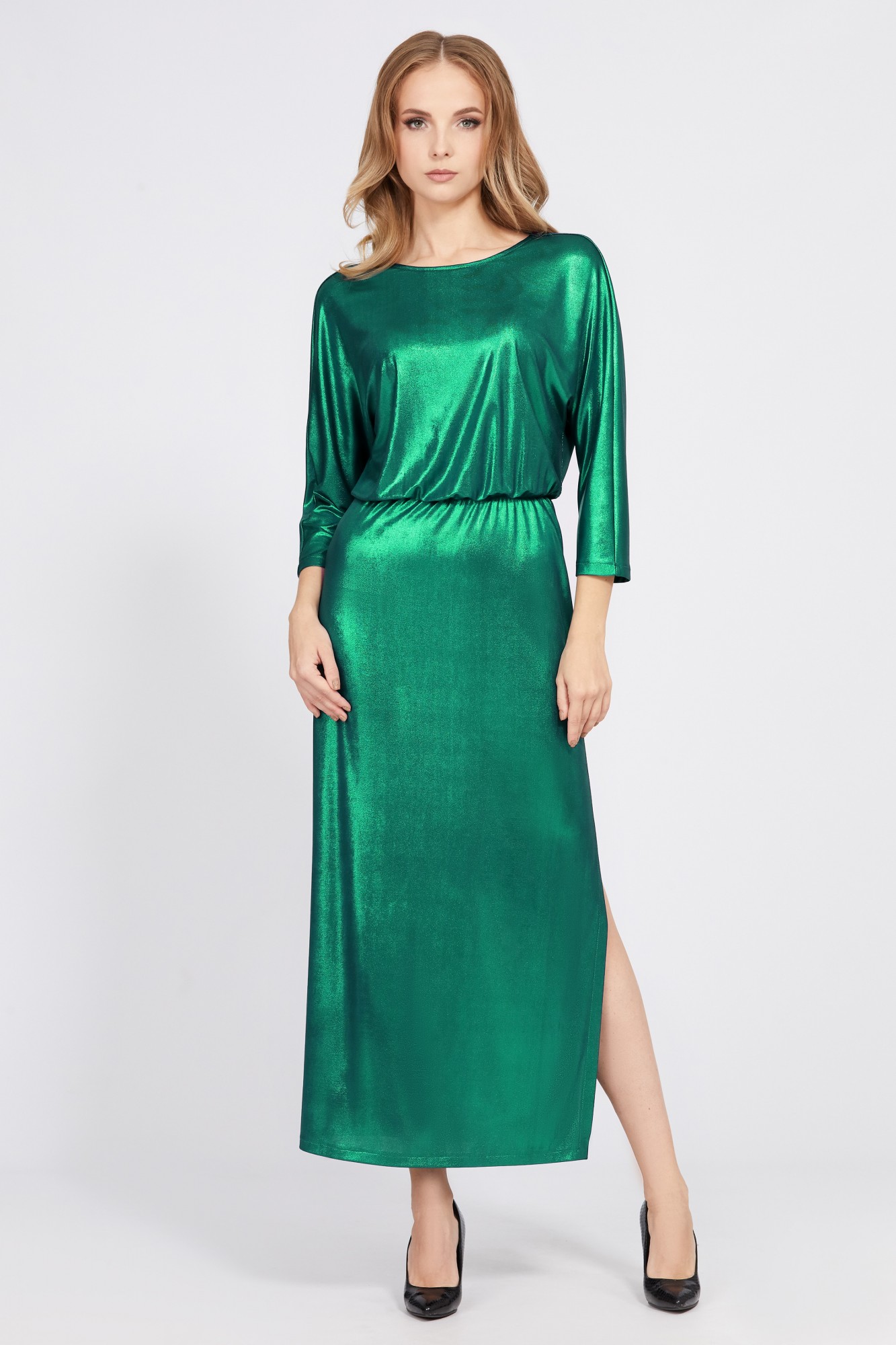 Шикарное макси-платье со свободным кроем лифа с цельнокроеными укороченными рукавами и юбкой с разрезом сбоку, предающим нотку гламура общему дизайну, а также обеспечивающим лёгкость движения. Модель выполнили из приятного мерцающего трикотажа. Для удобства в эксплуатации в среднем шве лифа обработали застёжку на навесную петлю и пуговицу, а талия на резинке добавляет комфорта и обеспечивает посадку на фигуре. Это платье излучает элегантность и изысканность, что делает его идеальным для торжественных случаев или особых мероприятий.