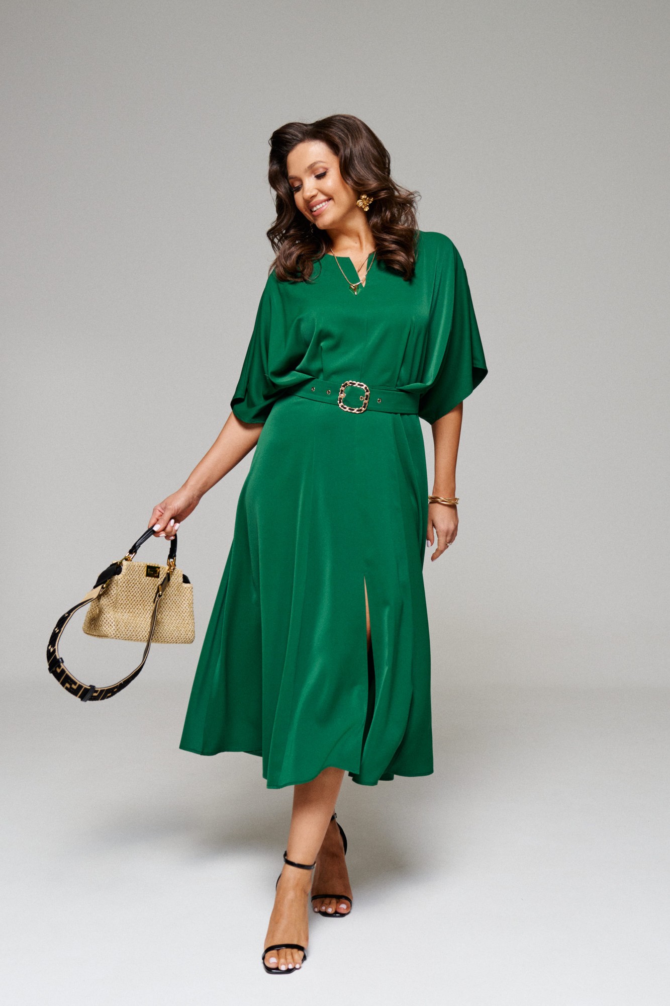 Мы представляем вашему вниманию легкое, нарядное, элегантное платье. Данная модель будет уместна для деловой встречи, а также для неформальных мероприятий разного рода. Платье женское, в нарядно-романтическом стиле; отрезное по линии талии; выполнено из лёгкого, струящегося, костюмно-смесового полотна. Передняя, верхняя часть платья разрезная по среднему шву, в верхней части которого расположен небольшой треугольный разрез. Спинка разрезная по среднему шву, в который вставлена длинная, потайная молния. Конструкция верхней части платья выполнена в свободном стиле со спущенной линией плеча и глубокими складками на линии талии. Нижняя, передняя часть платья свободного кроя, состоит из 4-х клиньев с разрезом спереди. Задняя, нижняя часть состоит из 2-х частей. Горловина округлой формы. Рукав цельнокроеный, объёмный, со спущенной линией плеча. В комплекте к платью прилагается широкий пояс на пряжке. Обратите Внимание ! Пряжка на платье как на дополнительном фото !
