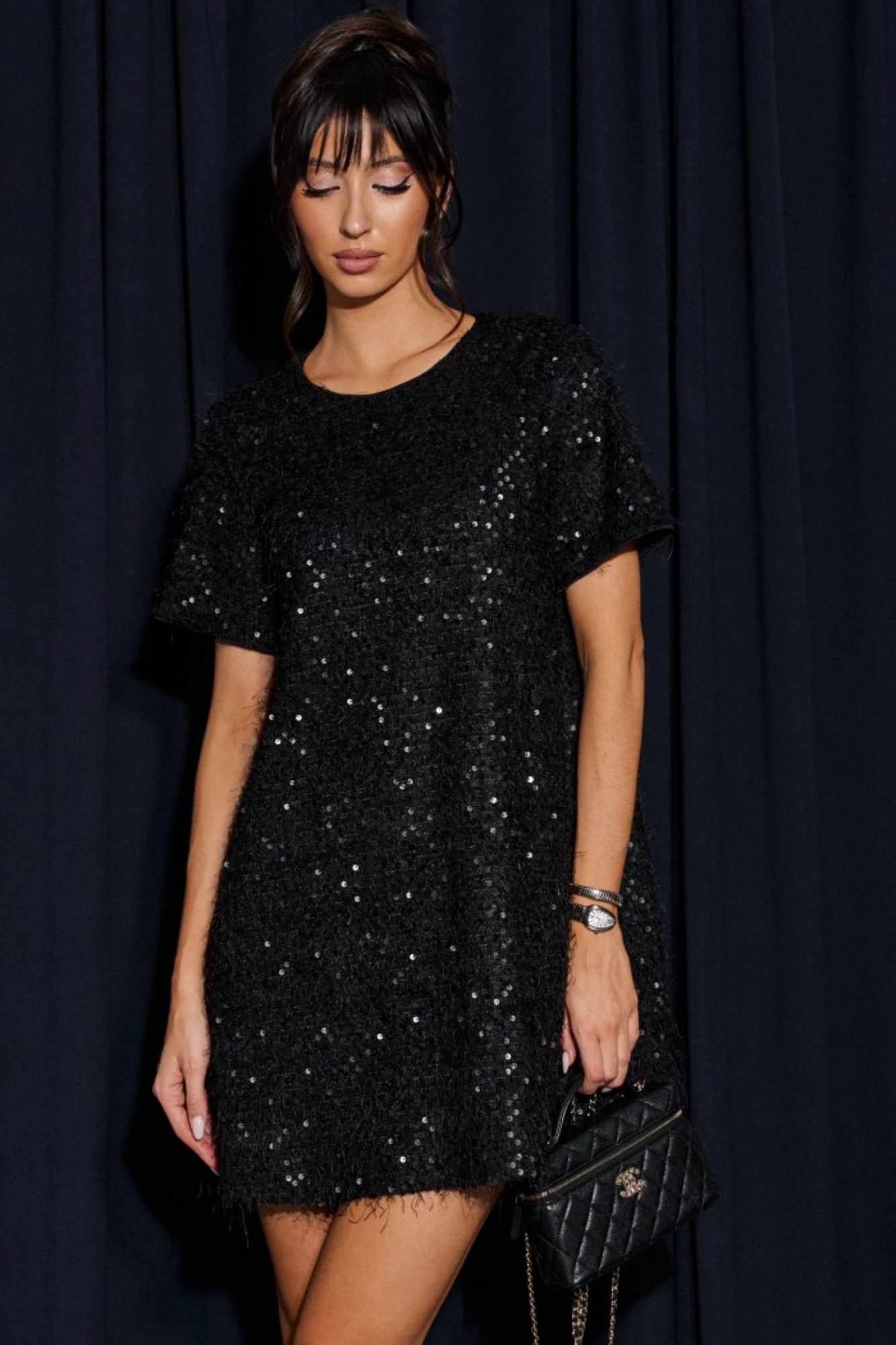 Платье свободного силуэта. Выполнено из фактурного ворсистого полотна с пайетками в черном цвете. Горловина овальная, рукав втачной, застежка на петлю пуговичку на спинке, рукав втачной, есть подкладка.