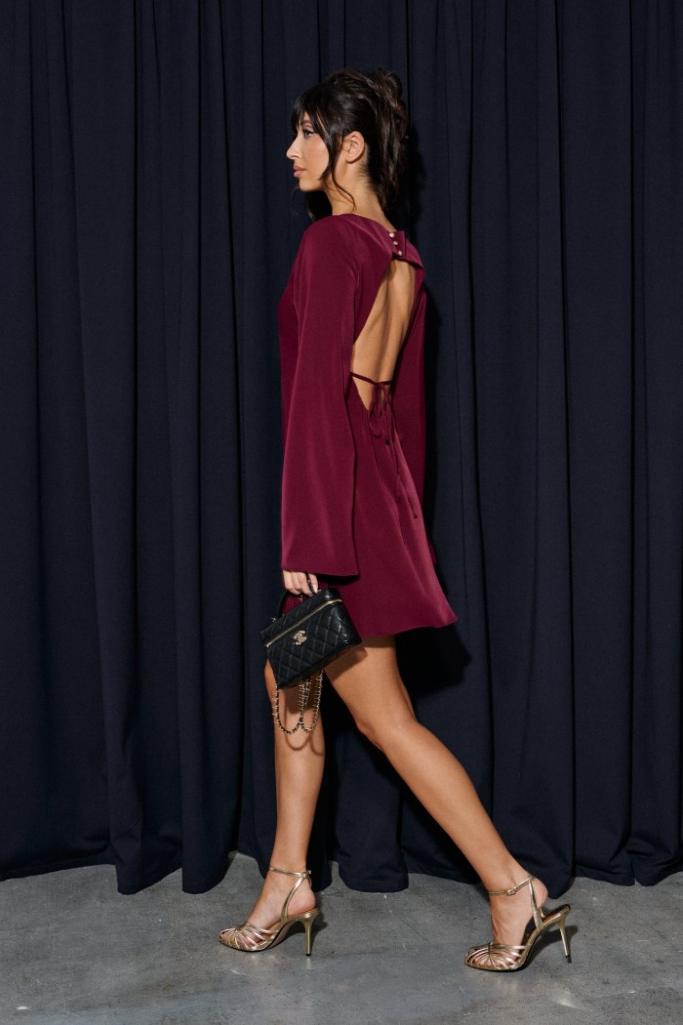 Платье полуприлегающего силуэта выполнено из плательной струящейся ткани бордового цвета. Характеристики: полуприлегающий силуэт, овальная горловина, рукав втачной расклешенный, тонкий подклад. Спинка открытая, с декоративным элементом завязок, сверху застежка на петли пуговицы.