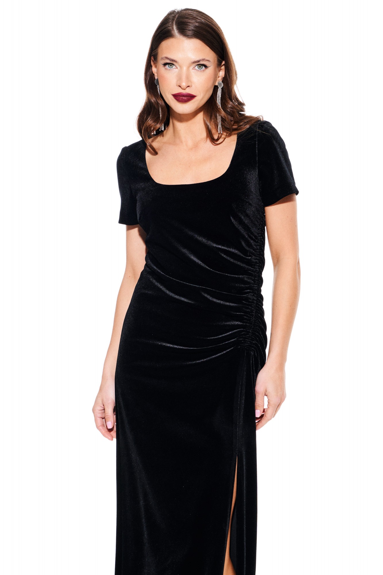 Платье из бархата на трикотажной основе, полуприлегающего силуэта, с фигурным вырезом горловины. По переду нагрудные вытачки, рельеф со сборкой на резинку и разрез. Спинка цельная. Рукав втачной, короткий. Длина платья до щиколотки.