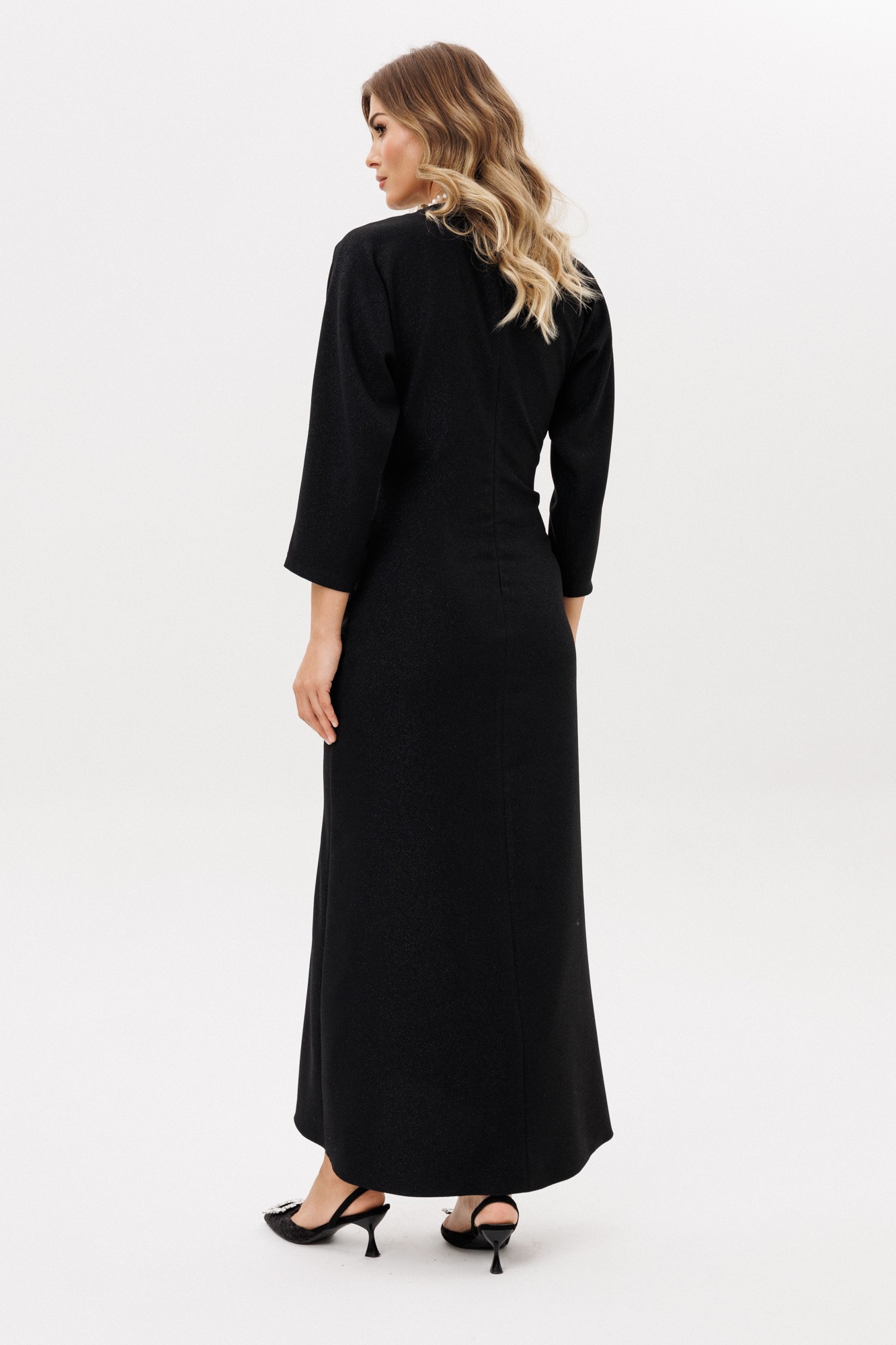 Платье выполнено из костюмно-плательной ткани с блеском. Платье Х-образного силуэта длиной миди. Спереди по нижней части средний шов и драпировка. Застежка на потайную молнию сзади в среднем шве спинки. Горловина округлой формы. Рукав цельнокроеный, покроя "кимоно", двухшовный, длиной 3/4. Низ платья фигурной формы, по спинке длинее переда. Платье без подкладки.
