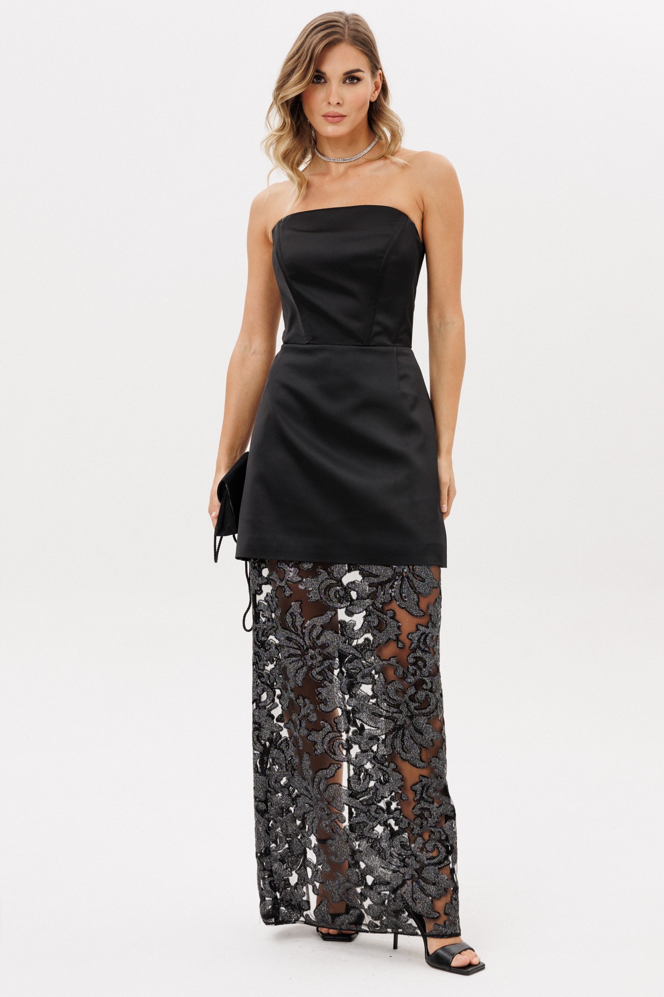 Платье выполнено из плотного атласа. Платье приталенного силуэта, отрезное по линии талии, длиной выше линии колена. Лиф выполнен в виде корсета, в рельефы вставлен регилин. Застежка на потайную молнию сзади в среднем шве спинки и юбки. Юбка прямого силуэта. Платье на притачной по низу подкладке.