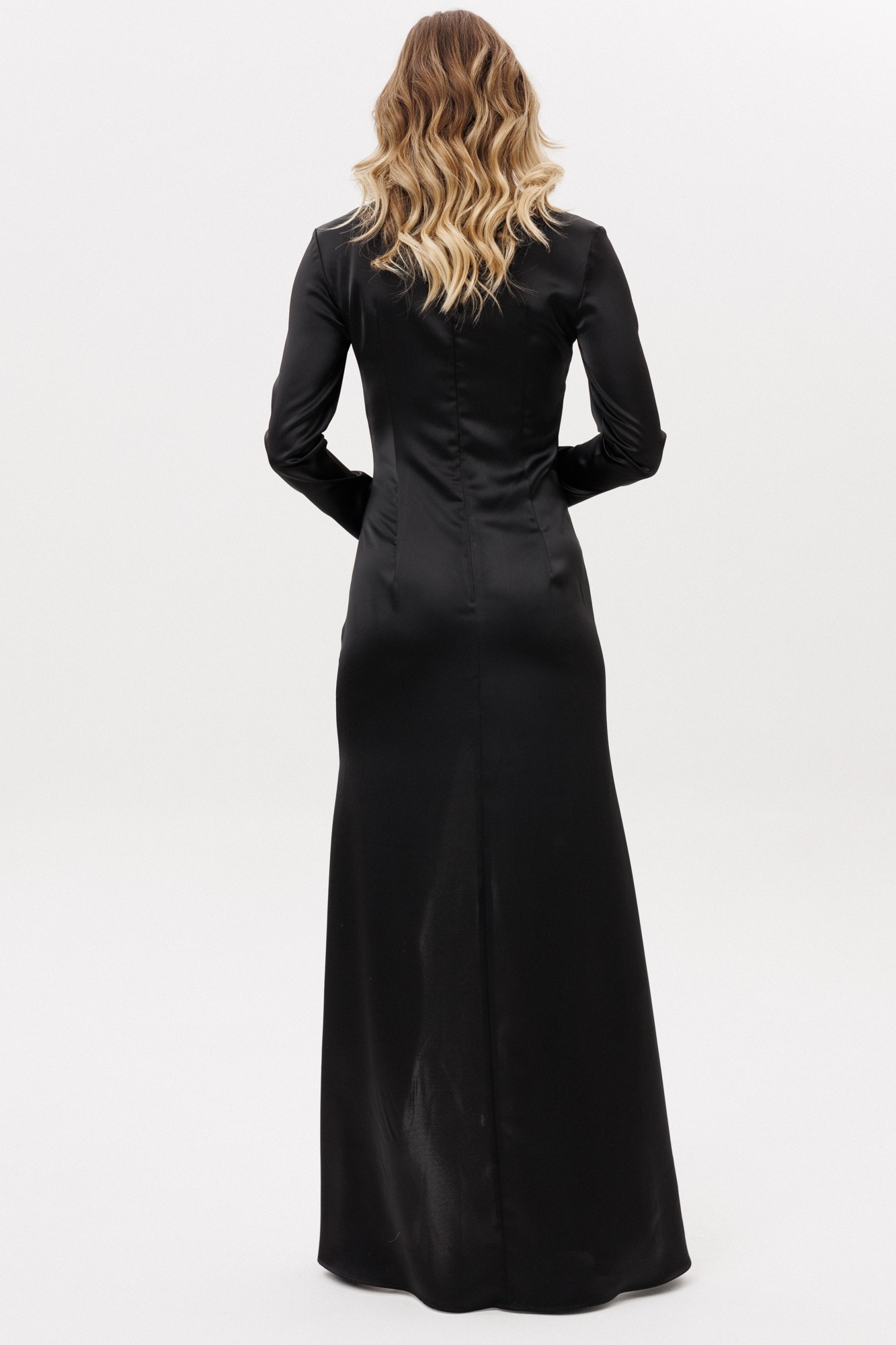 Платье выполнено из плотного атласа. Платье полуприлегающего силуэта длиной в пол. Застежка на потайную молнию сзади в среднем шве спинки, горловина округлой формы. Рукав втачного покроя, одношовный. Спереди разрез V-образной формы, декорированный пайетками.