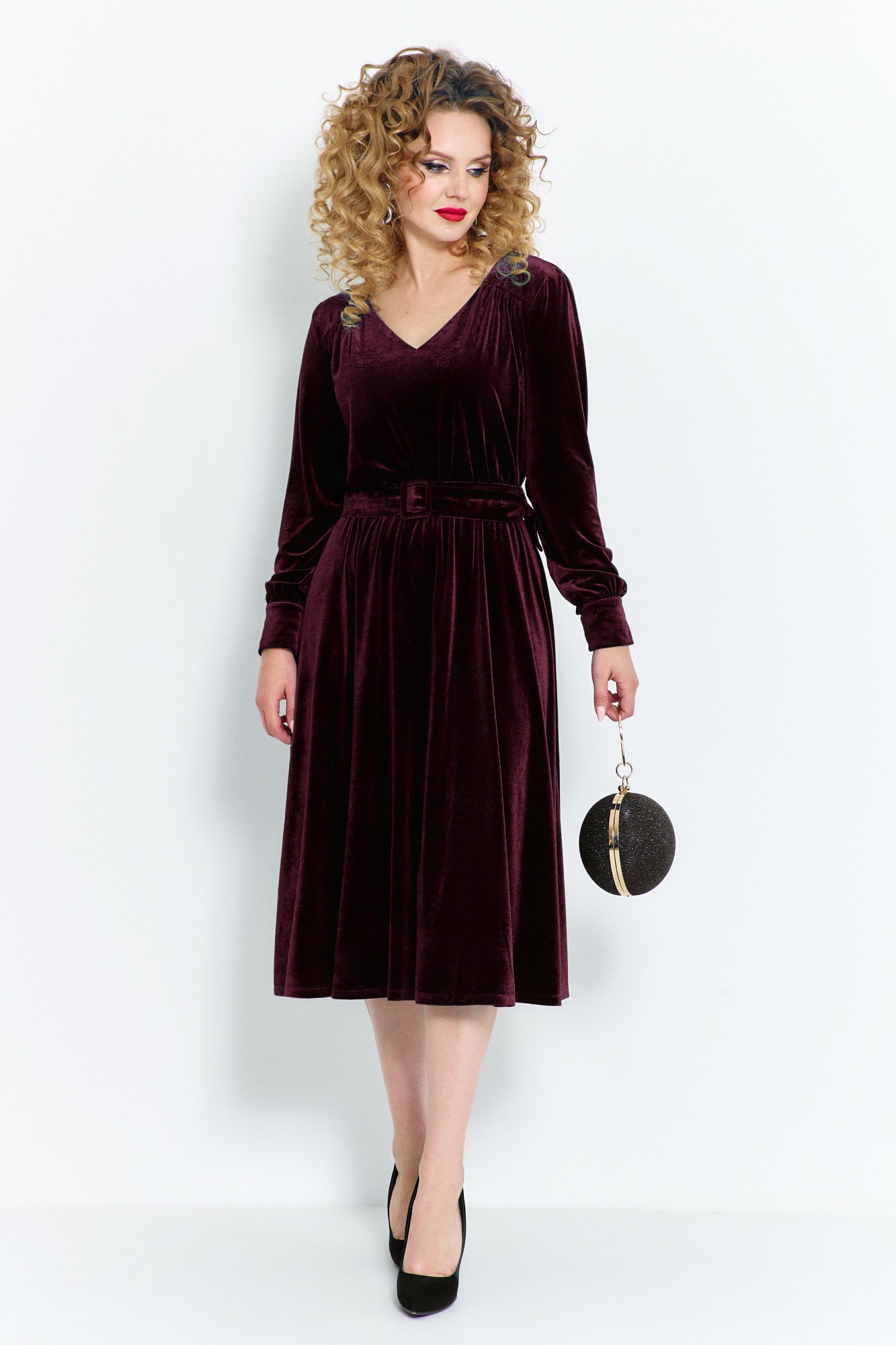 Платье женское выполнено из Велюра в романтическом стиле, изделие отрезное по линии талии. Лиф платья с отрезными кокетками по плечам и V-образным вырезом. Рукав длинный на широкой манжете по низу (застёжка пуговицы с навесными петельками). Юбка изделия А-Образного кроя. В таллиевом шве расположена резинка. В комплект входит пояс.