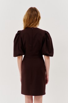 Платье приталенного силуэта с декоративными брошками по переду. Характеристики: выполнено из плательной ткани в цвете горький шоколад, воротник рубашечного типа с планкой на петли и пуговицы, рукав двухшовный.