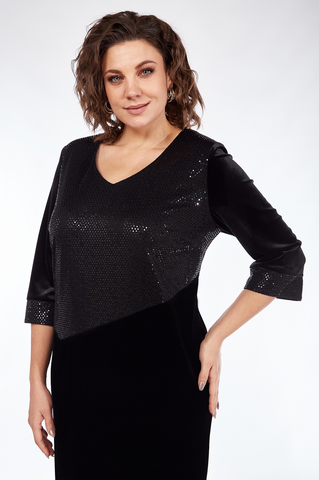 Платье женское, прямого силуэта, слегка зауженное к низу. Изготовлено из велюра и отделочной ткани с пайетками. Горловина фигурной формы. По переду обработаны нагрудные вытачки. Платье отрезное по талии. По лифу платья, низу изделия и низу рукавов — отделочная ткань. По спинке средний шов и разрез внизу. Рукава втачные, длиной 3/4.