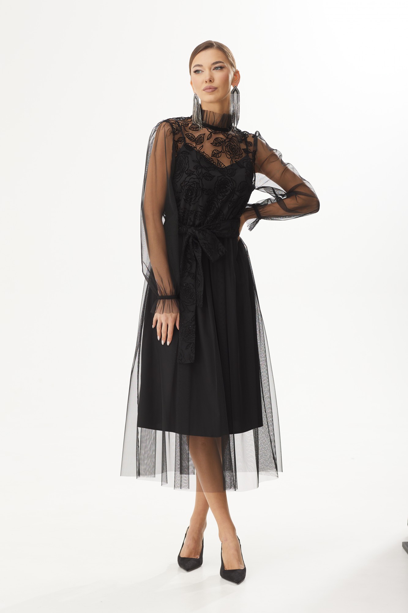 Платье двухслойное полуприлегающего силуэта, отрезное по линии талии. Верхний лиф выполнен из фатина с флоком. Перед и спинка цельнокроеные. В области горловины обработана застежка-капелька на навесную петельку и пуговицу. Нижняя юбка прямая, верхняя юбка собрана по линии талии. Рукав длинный, втачной, по низу оборка, на запястье просборен на резинку. Горловина округлой формы, декорирована тесьмой. В комплекте съемный пояс. Платье двухслойное полуприлегающего силуэта, отрезное по линии талии. Верхний лиф выполнен из фатина с флоком. Перед и спинка цельнокроеные. В области горловины обработана застежка-капелька на навесную петельку и пуговицу. Нижняя юбка прямая, верхняя юбка собрана по линии талии. Рукав длинный, втачной, по низу оборка, на запястье присборен на резинку. Горловина округлой формы, декорирована тесьмой. В комплекте съемный пояс.