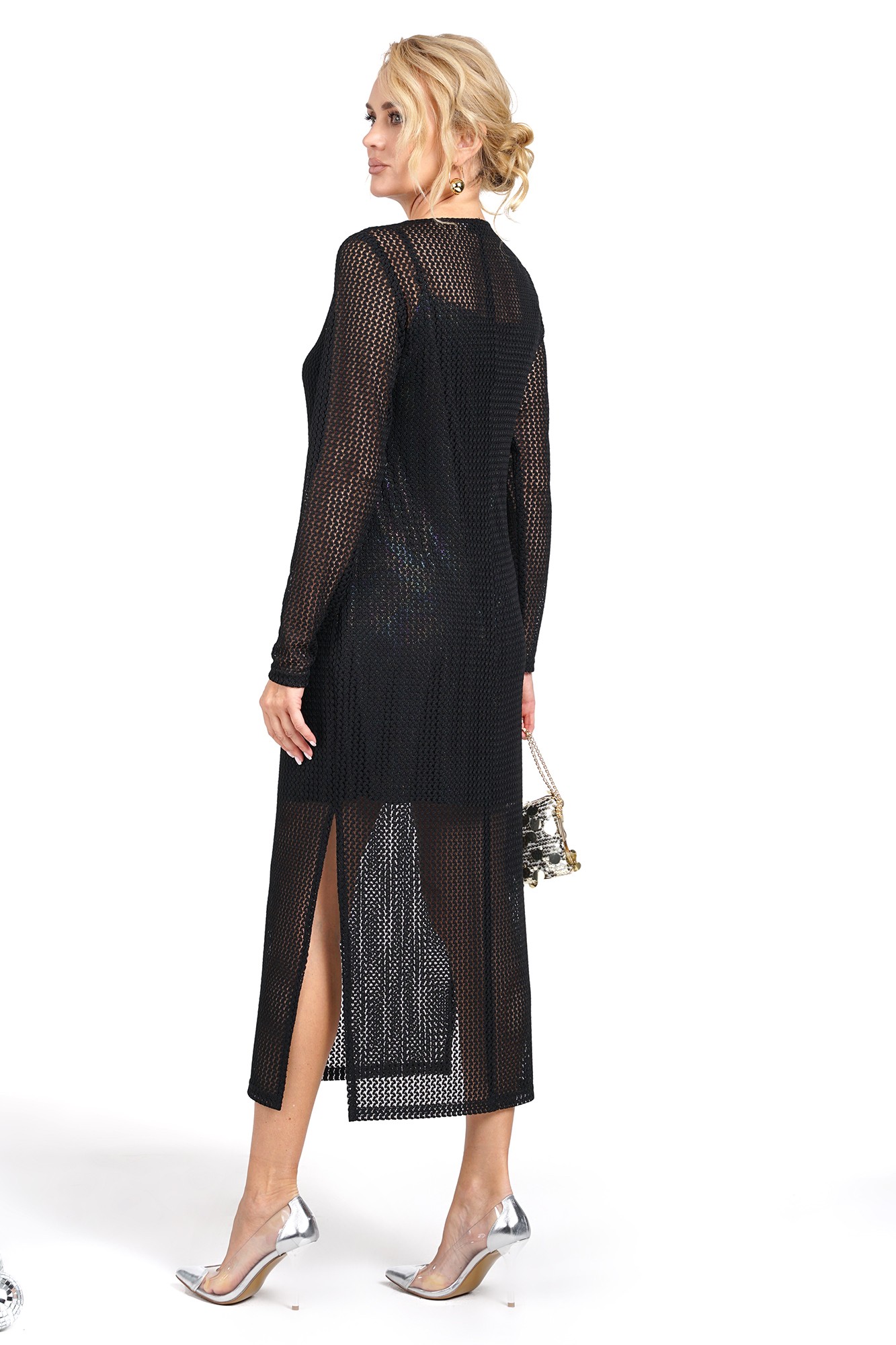 Верхнее платье полуприлегающего силуэта, с разрезами по боковым швам. Рукава втачные, одношовные, длинные. Нижнее полуприлегающего силуэта, на узких бретелях, фиксируемая длина бретелей. Перед с нагрудными выточками.
