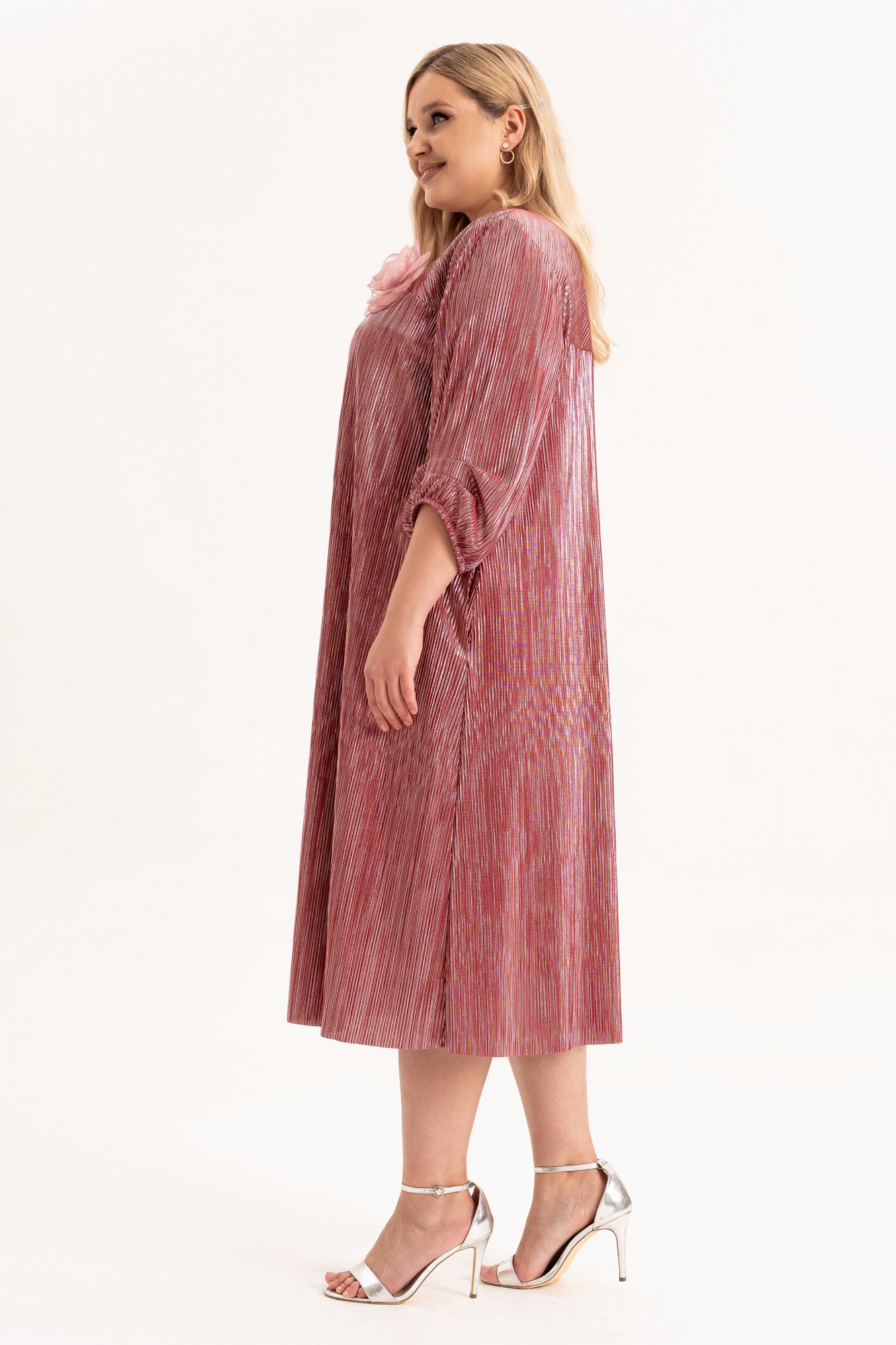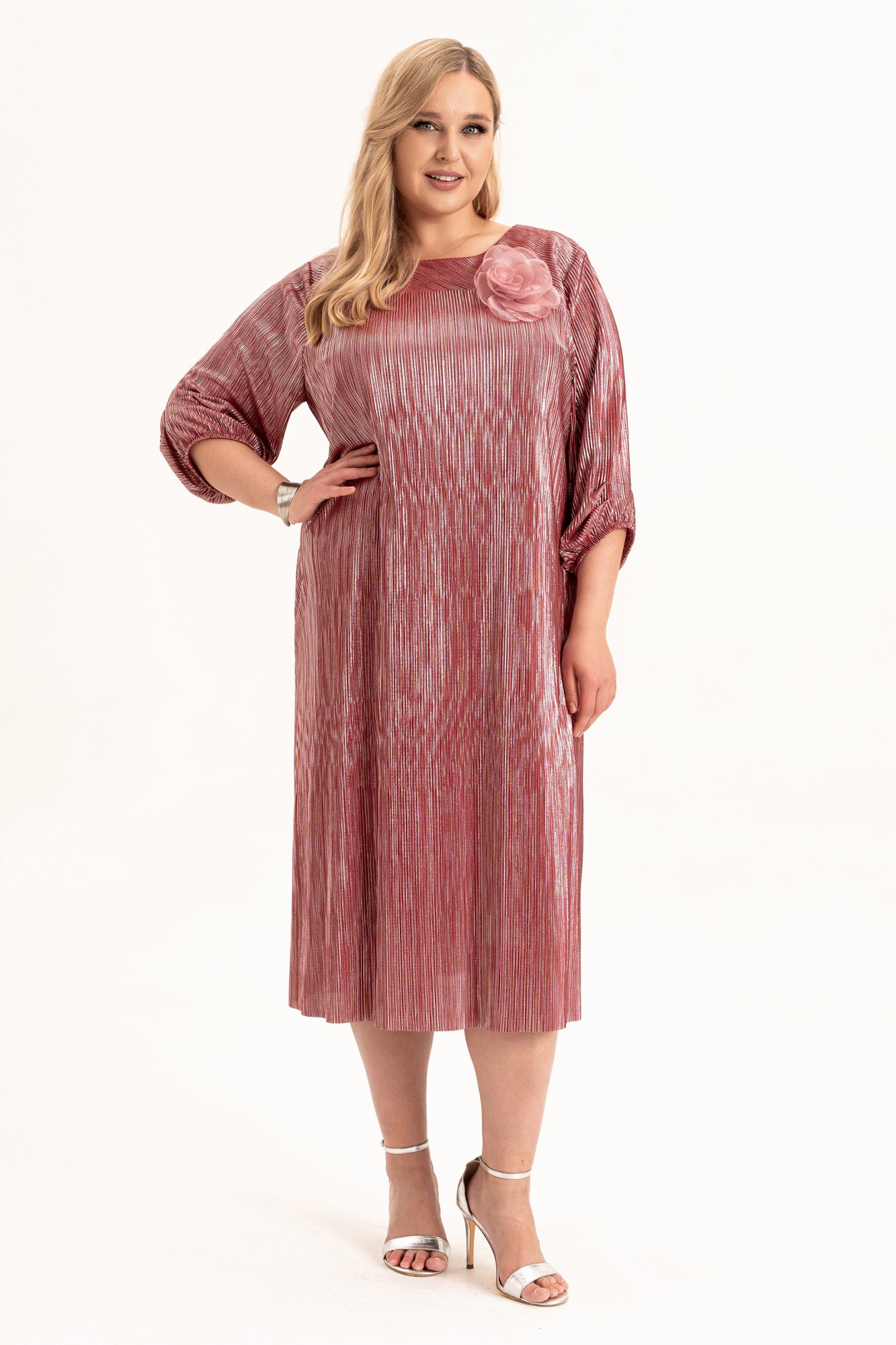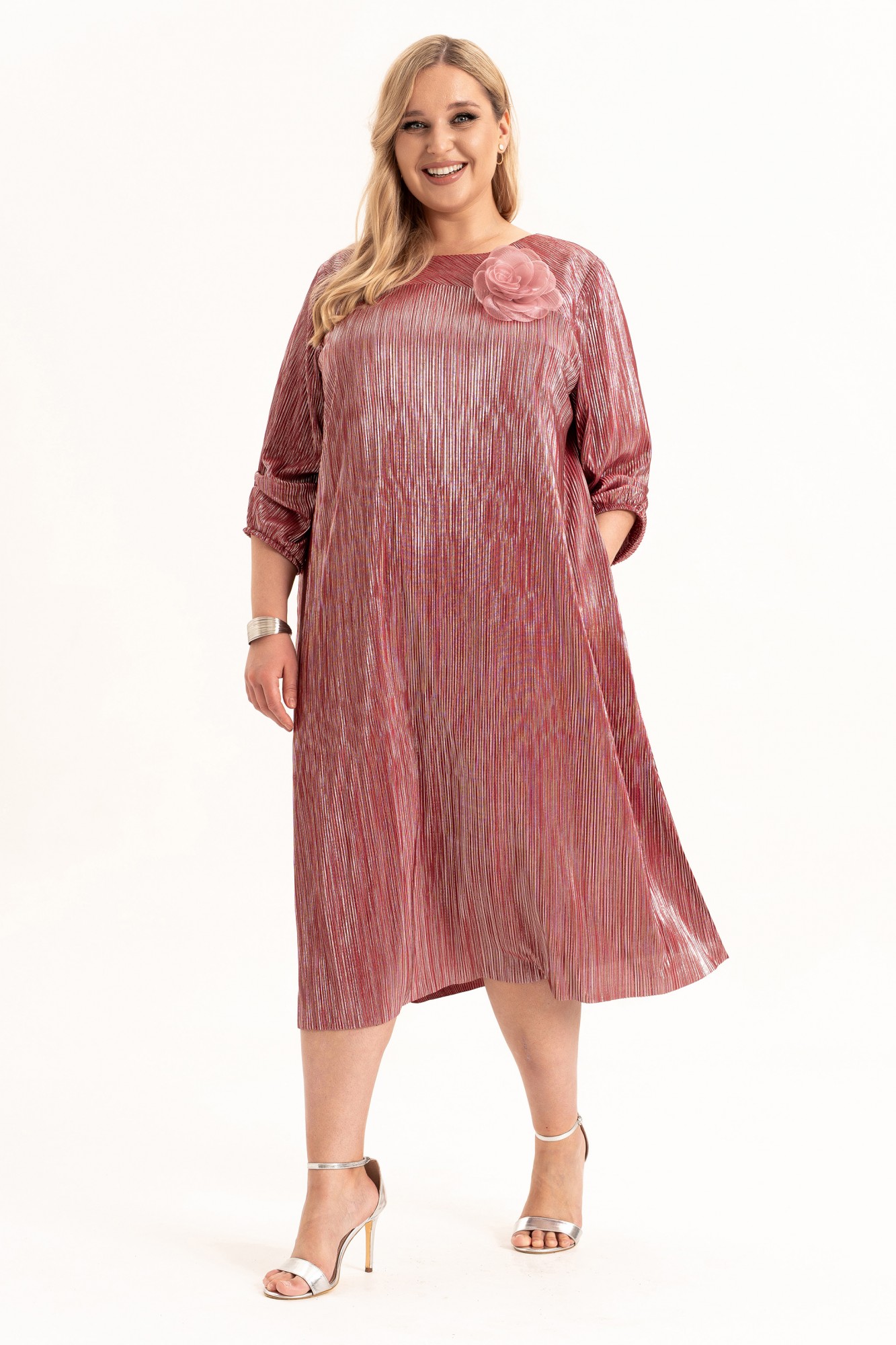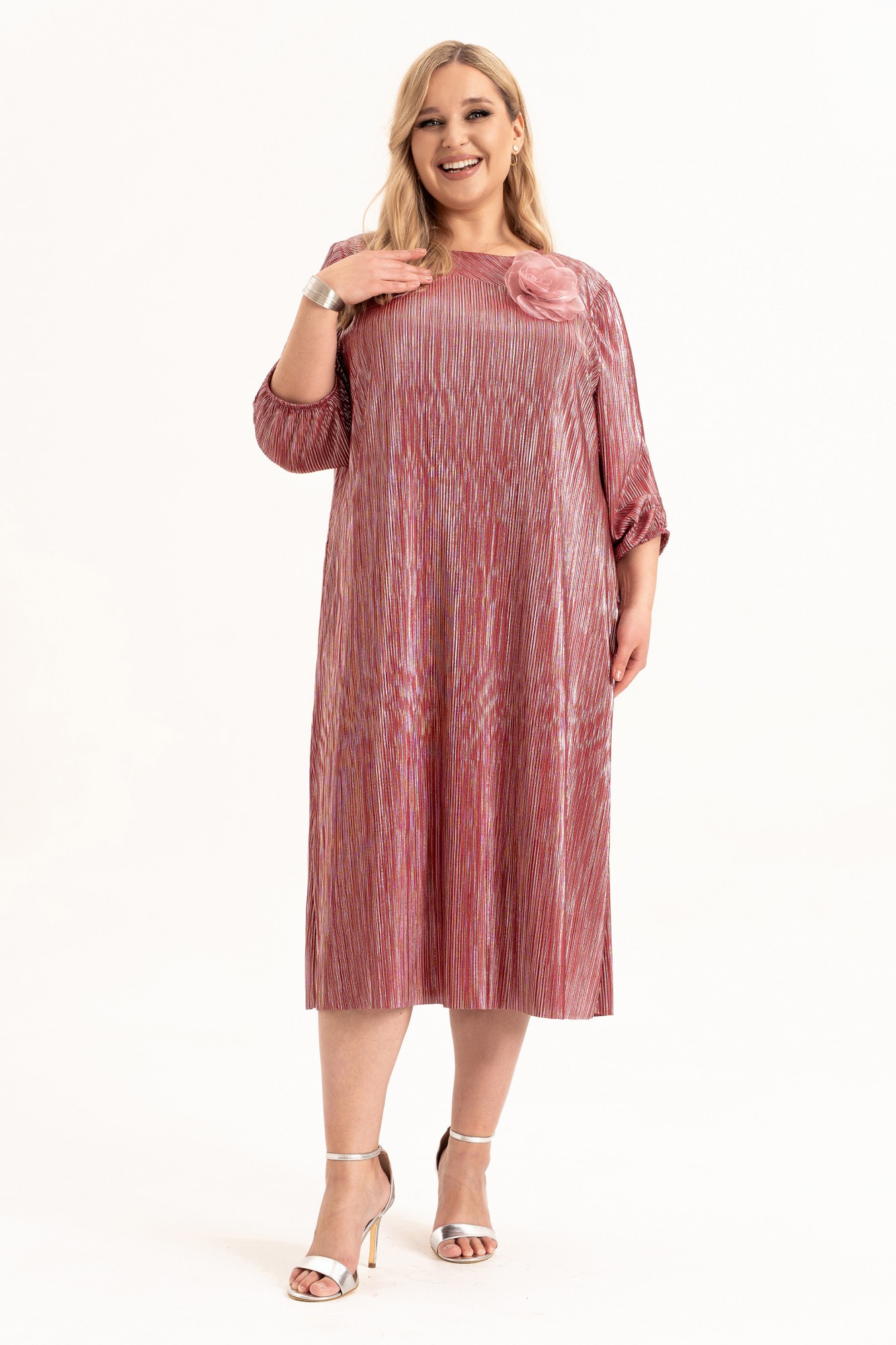Расклешенное платье гофре - это тренд для торжественных случаев. Модное изделие длины ниже колена представлено в широком размерном ряде, в том числе и больших размеров для полных плюс сайз, и подходит для взрослых женщин, девушек и девочек - подростков высокого (длина миди) и невысокого роста (длина макси). Необычная готическая винтажная вещь свободного кроя на подкладке. Элегантный вырез лодочка и клеш от груди - идеальное платье. На полочке и спинке обработаны кокетки , которые выполненны косым кроем и капелька на спинке на петлю и пуговицу. В боковых швах обработаны карманы для удобства. Трендовое платье с рукавами длиной ¾ по низу на резинке и тканью гофре незаменимо для ношения в демисезон и на выход в летние и весенние дни. В комплект входит съемный цветок. Такая эстетичная современная строгая классика из легкой ткани станет украшением гардероба каждой красотки.