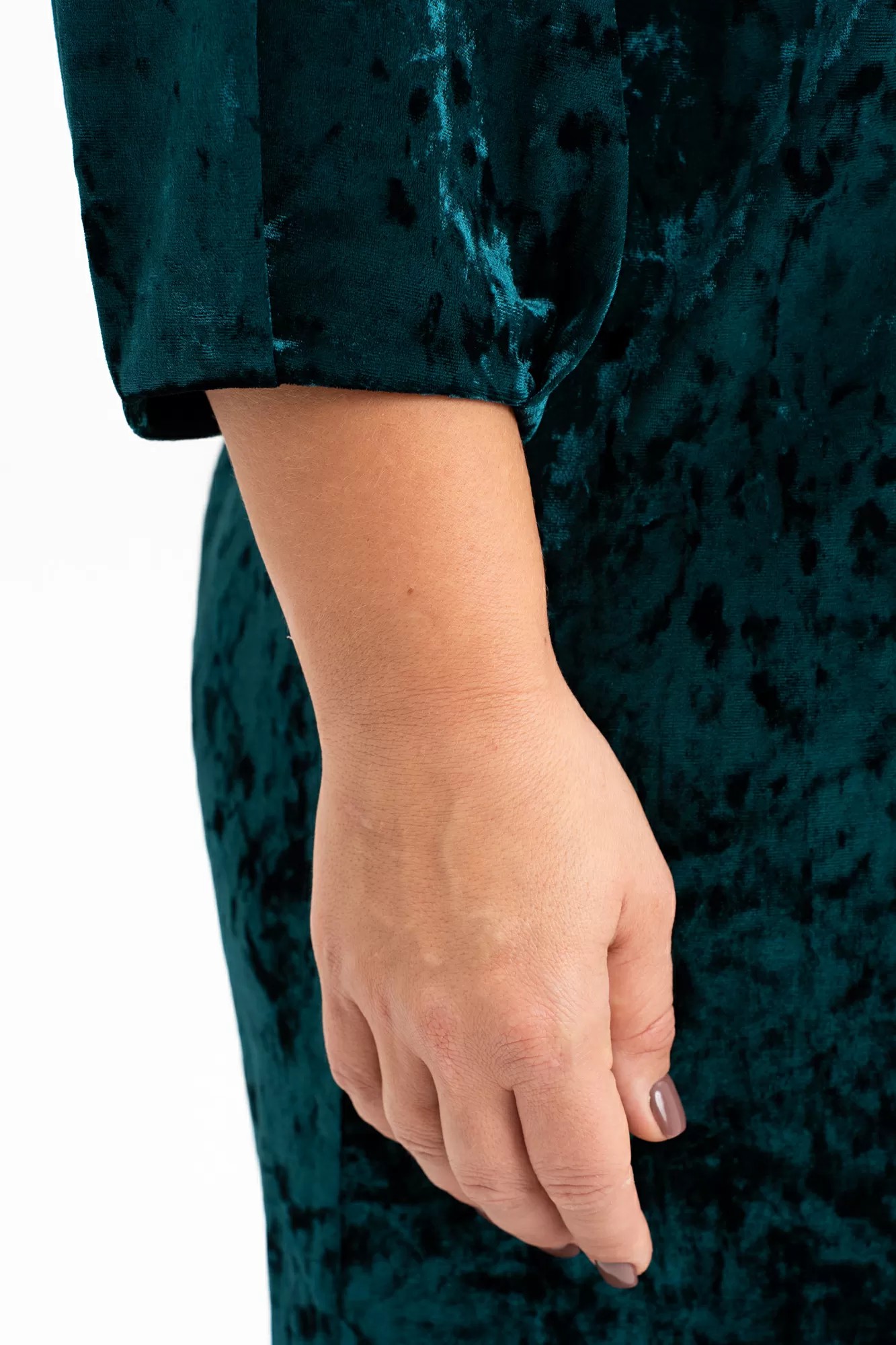 Элегантное нарядное платье классической длины , ниже колена выполнено из мягкого эластичного бархата. Прямой силуэт деликатно подчеркивает женственные формы. Классический вырез-лодочка горловины безупречной глубины эффектно преподносит зону декольте. Воздушный втачной рукав длиной 3/4, по низу которого есть складки усиливает ощущение хрупкости и женственности. По спинке обработана застежка на петли и пуговицы, и съемный бант из контрастной ткани. Стильное поддерживает трендовые тенденции у молодежи современное, такие вещи выделяют утонченный, изысканный вкус и элегантность у девушки модели.