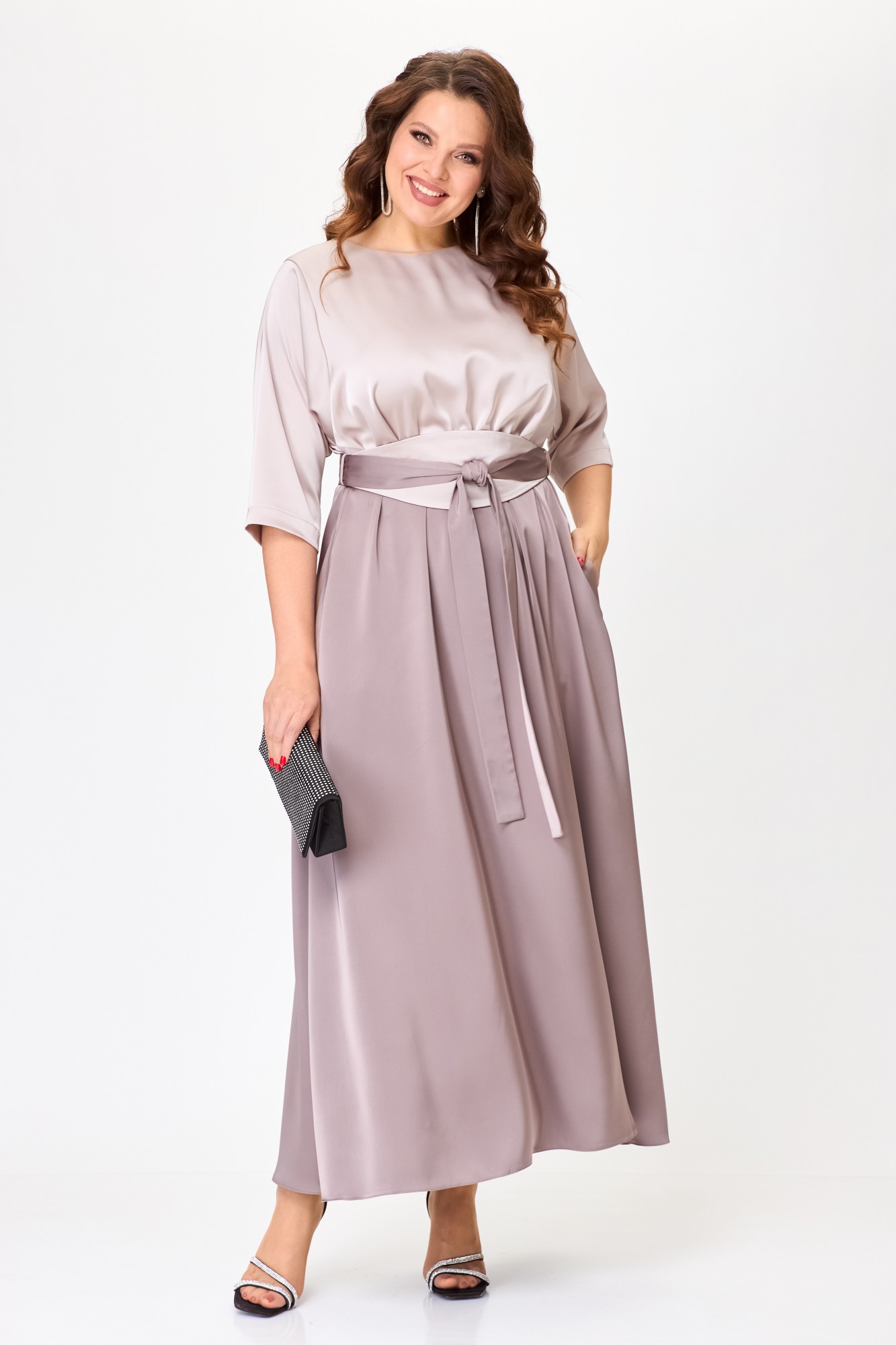 Платье выполнено из однотонной ткани с атласным эффектом в сочетании двух цветов. Платье длинной макси с акцентом в области талии в виде съемного пояса кушак. Платье отрезное по линии талии. Полочка с горловиной овальной формы. Спинка со средним швом, в верхней части которого обработана капля-разрез с застежкой на навесную петлю и пуговицу. Рукав одношовный длиной 3/4. Юбка формы колокол. В боковых швах юбки обработаны карманы. По талии платье с эластичной тесьмой. В боковых швах лифа обработаны шлёвки, через которые продевается пояс-кушак. Без подкладки.