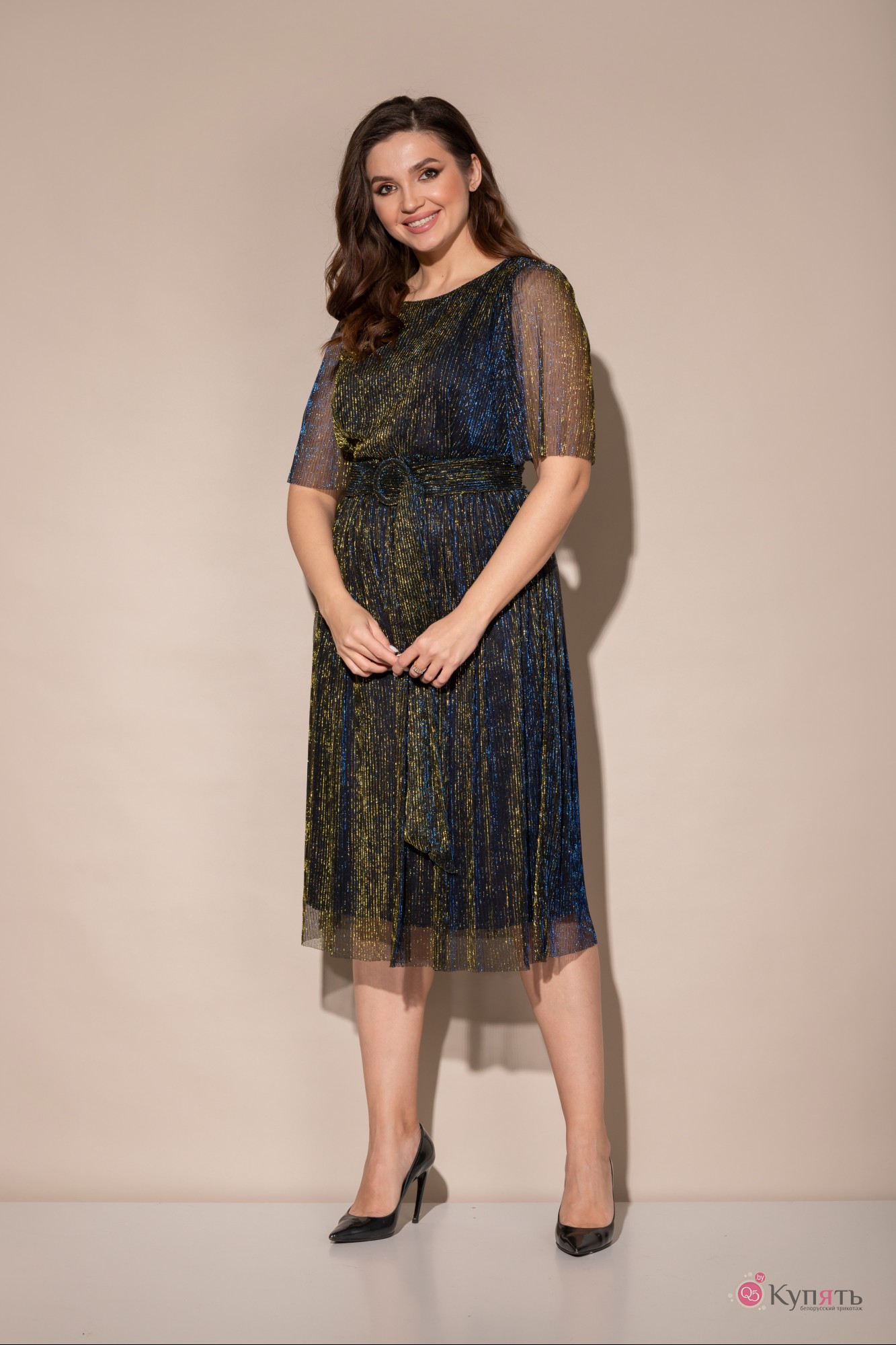 Платье женское полуприлегающего силуэта отрезное по линии талии. По переду лифа талевые вытачки. Юбка со сборкой по талии на эластичной тесьме. Горловина круглая, по спинке V- образная на завязке. Рукава втачные одно шовные. Изделие на тонкой трикотажной подкладке. Дополняет платье пояс с пряжкой.