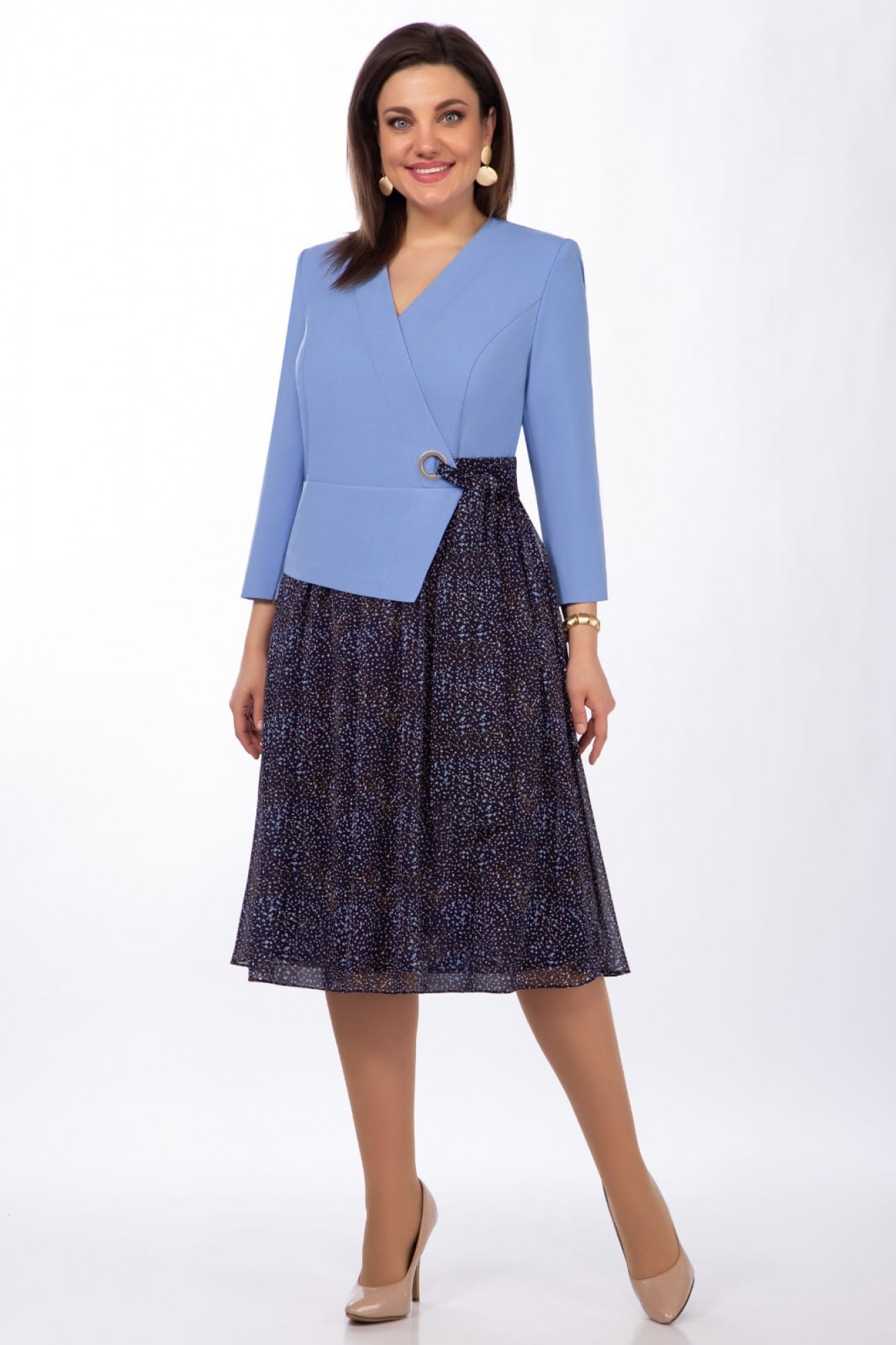 Платье женское расклешённое из двух тканей: костюмно-плательной и шифоновой, низ на подкладке. Горловина V-образная, имитация запаха, через люверс протянут шифоновый пояс. По переду и спинке рельефы из пройм. По талии отрезная фигурная баска. Рукава втачные двухшовные, с разрезами по переднему шву.