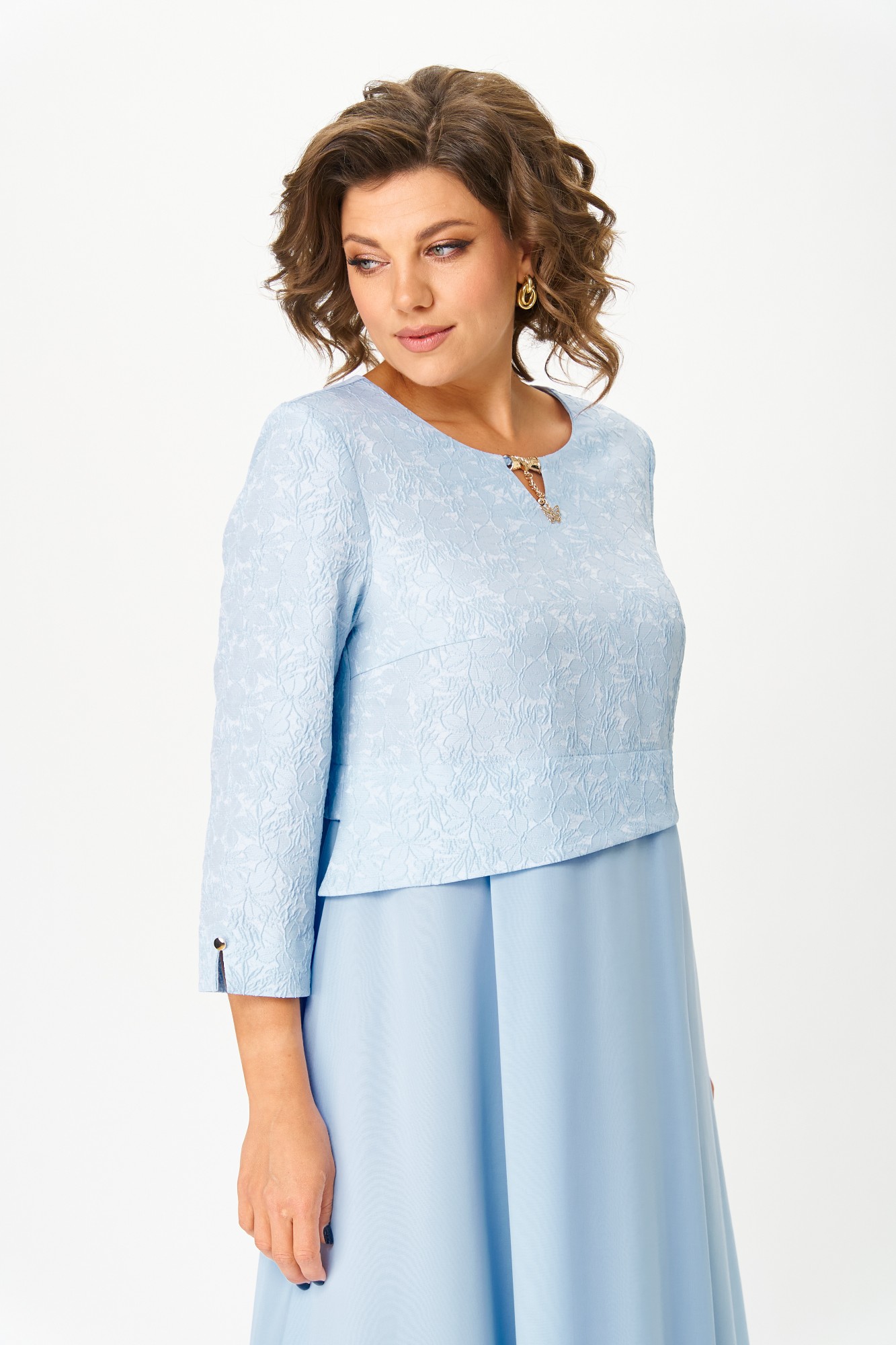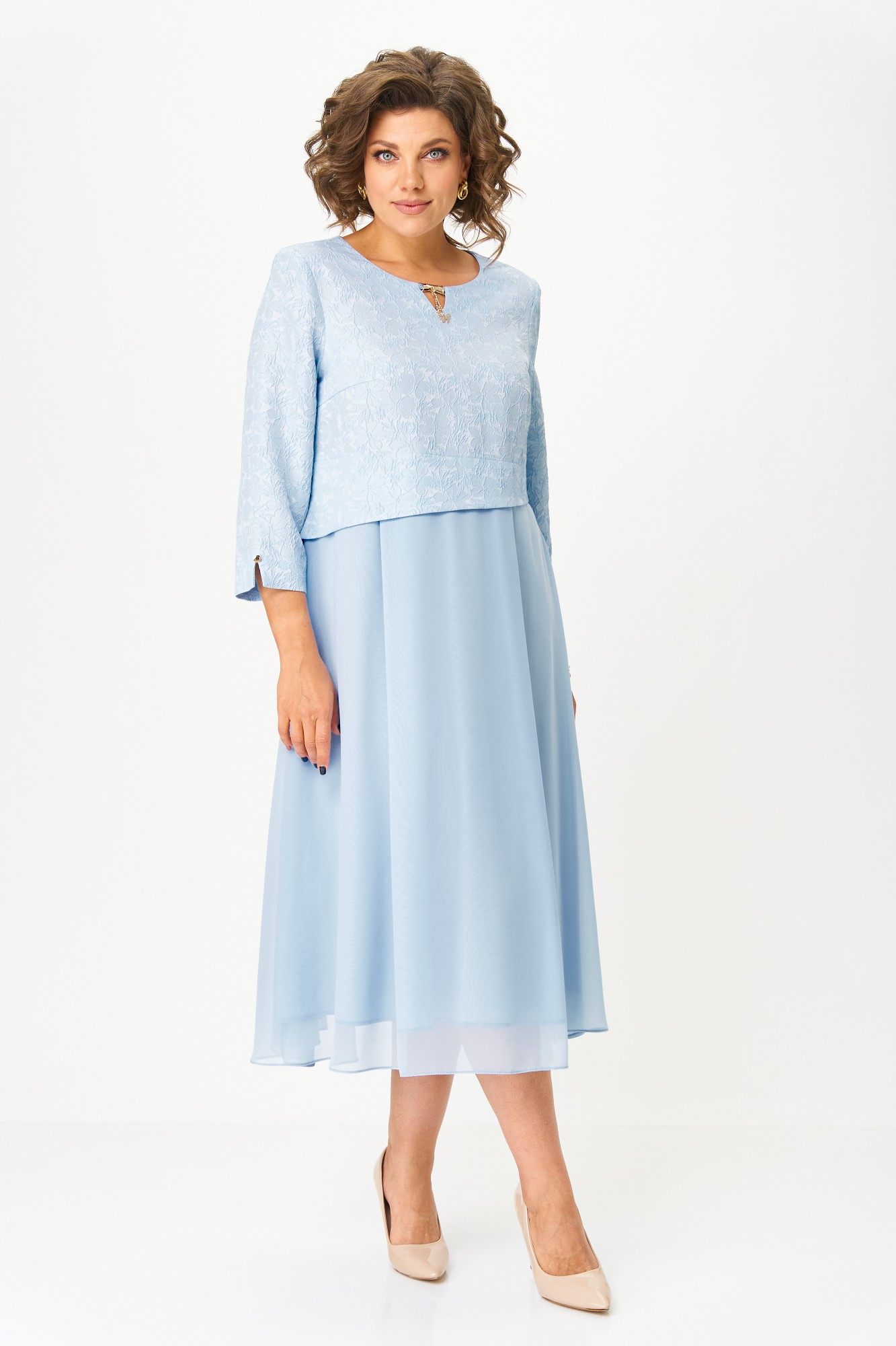 Элегантное женское платье, выполнено из жаккарда и шифона. Лиф из жаккарда, горловина круглая с декоративным элементом по центру, по низу лифа ответная складка, по переду низ асимметричный, рукава втачные, по низу декоративный элемент с пуговицей. Юбка платья из шифона, расширенная со складками, на подкладке.