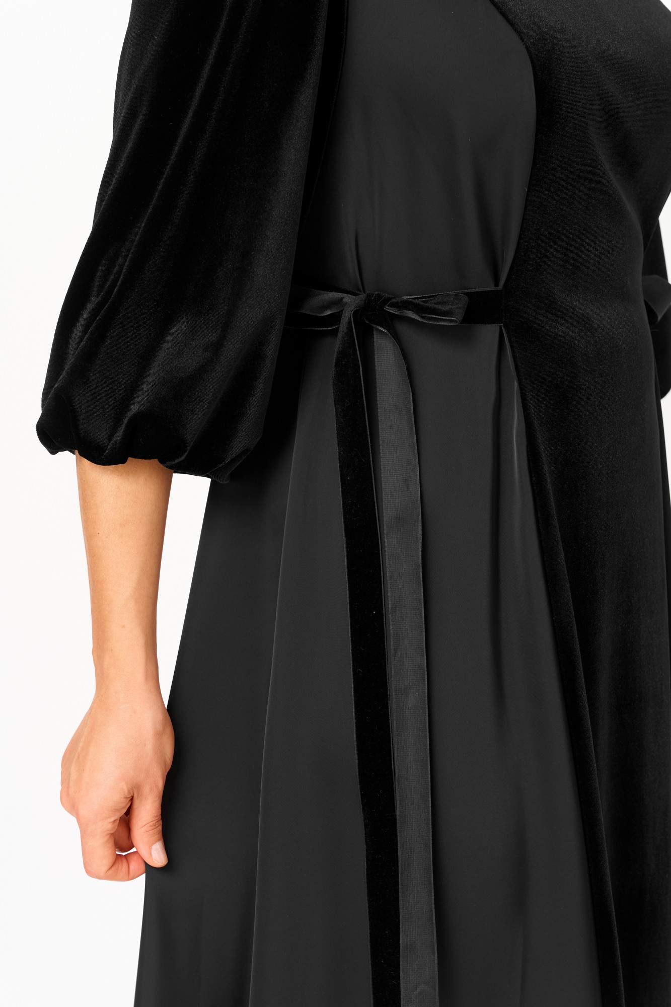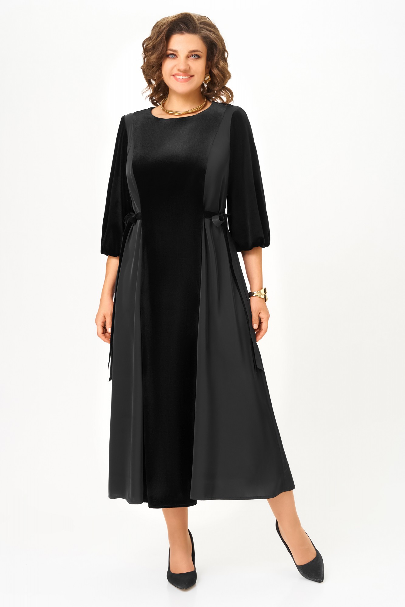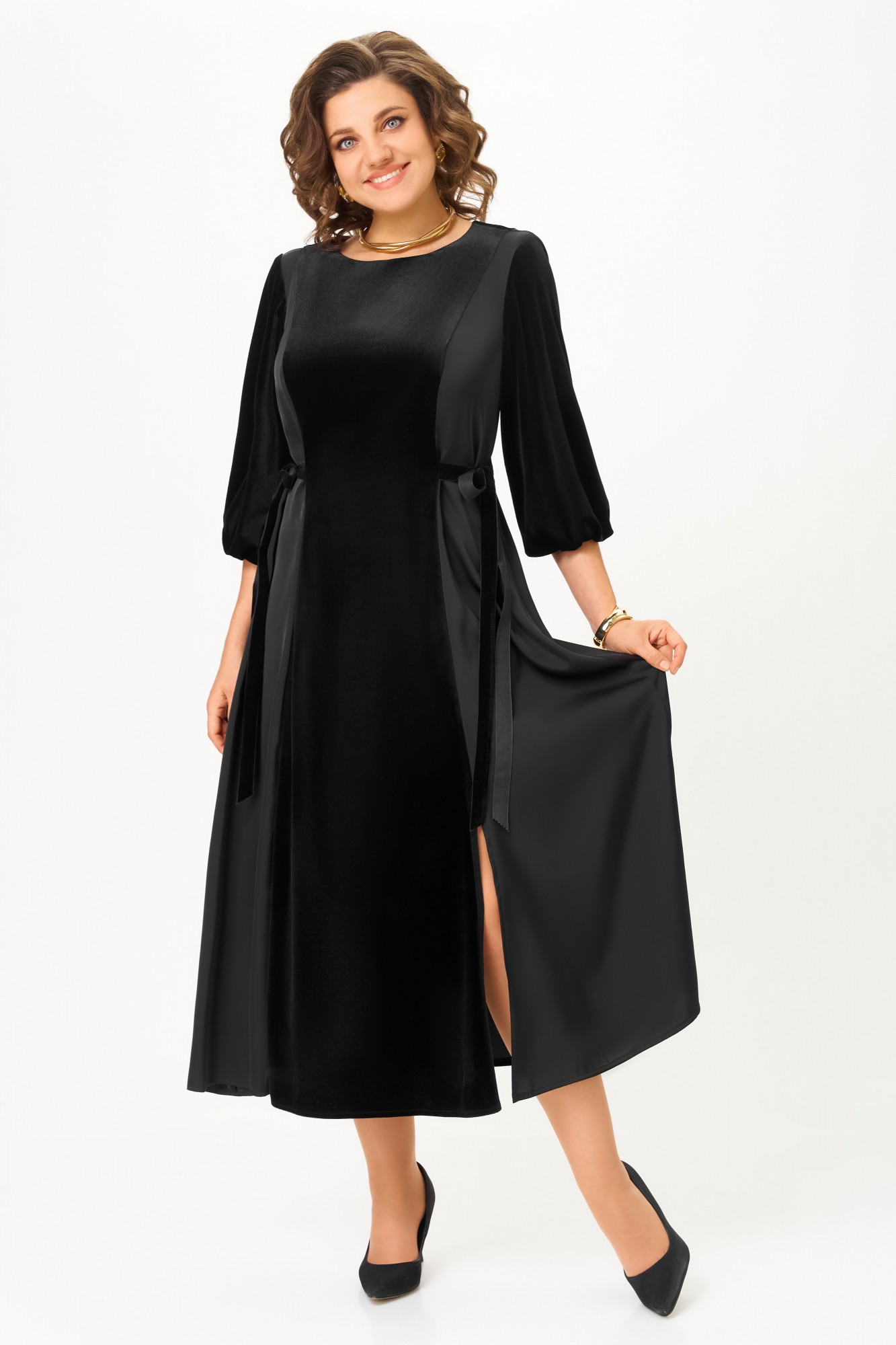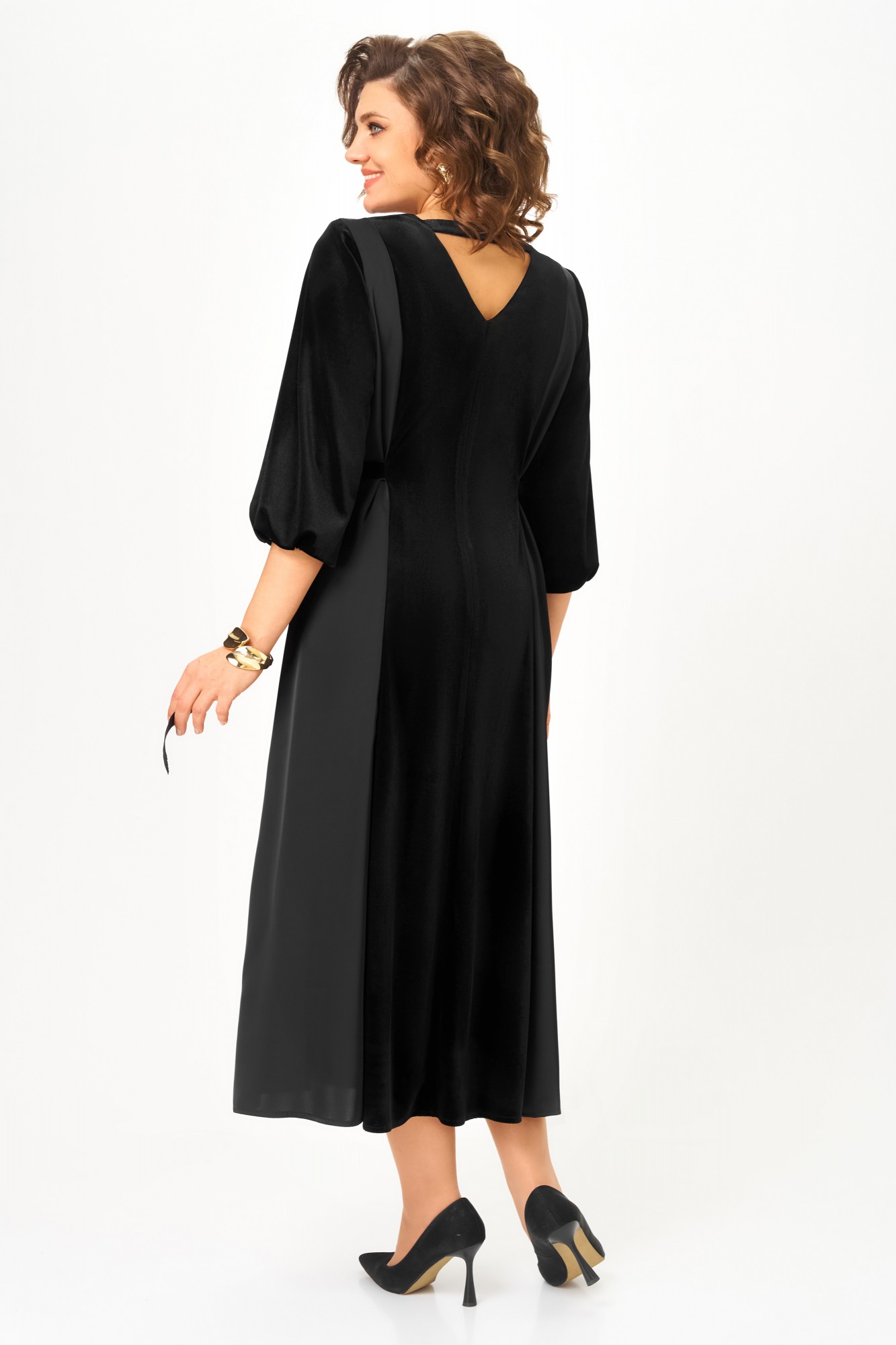 Платье женское, полуприлегающего силуэта, расширенное к низу. Состоит из двух видов ткани: трикотажа (велюр) и атласа. Линия плеча слегка расширена. Рельефы спереди и по спинке подчёркивают мягкие силуэтные линии. Немного завышена линия талии, которую подчеркивают декоративные ленты выполняющие роль пояса. Горловина спереди в форме «лодочки», со стороны спинки V-образный вырез горловины с поперечной планкой. По низу платья спереди обработан разрез. Рукава втачные, объём создают складки по низу. Изделие украшает декоративная тесьма по рукаву. Низ изделия обработан подгибом.