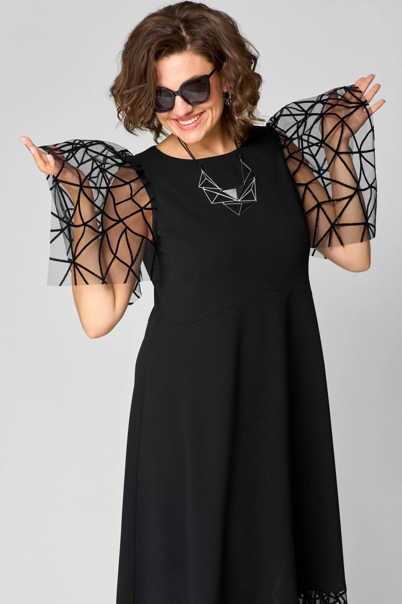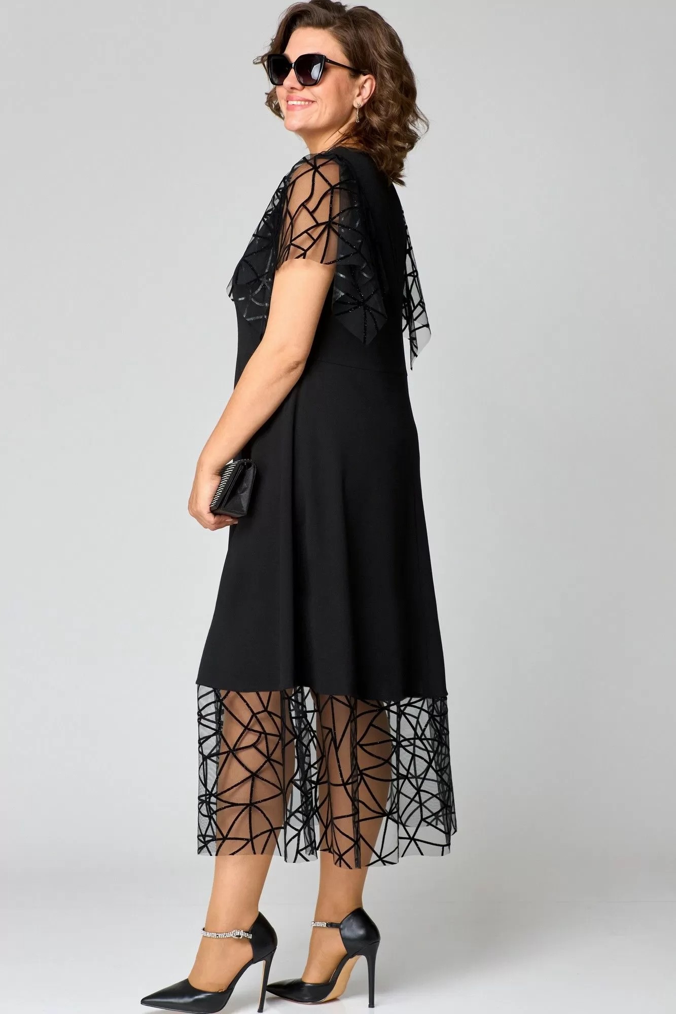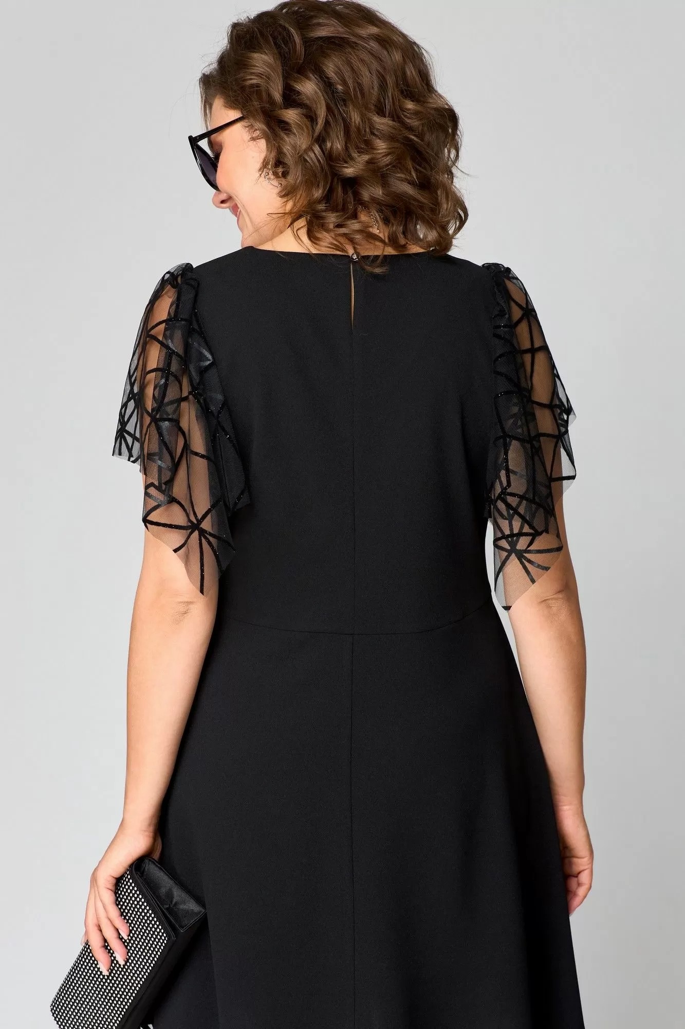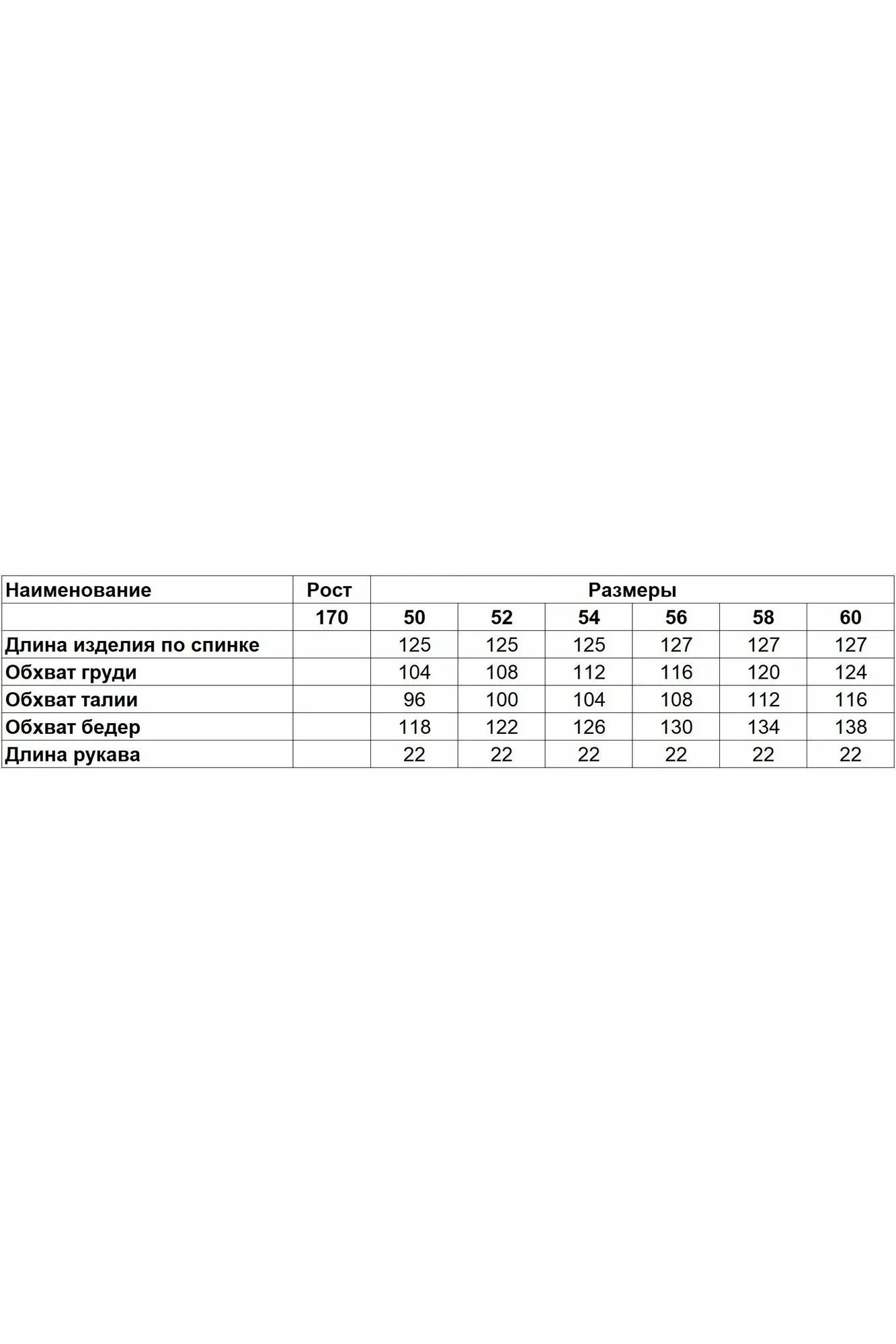 Платье женское нарядное полуприлегающего силуэта расширенное к низу, выполнено из плательного крепа в сочетании с отделкой из флока с набивным рисунком. Вырез горловины круглый на обтачке, по спинке застежка на одну навесную петлю и пуговицу. Проймы обработан обтачкой, рукав фэнтези по окату со сборкой. Платье с фигурным подрезом по полочке. По низу платья волан из отделочной ткани. Декором служит дизайн отделочной ткани.