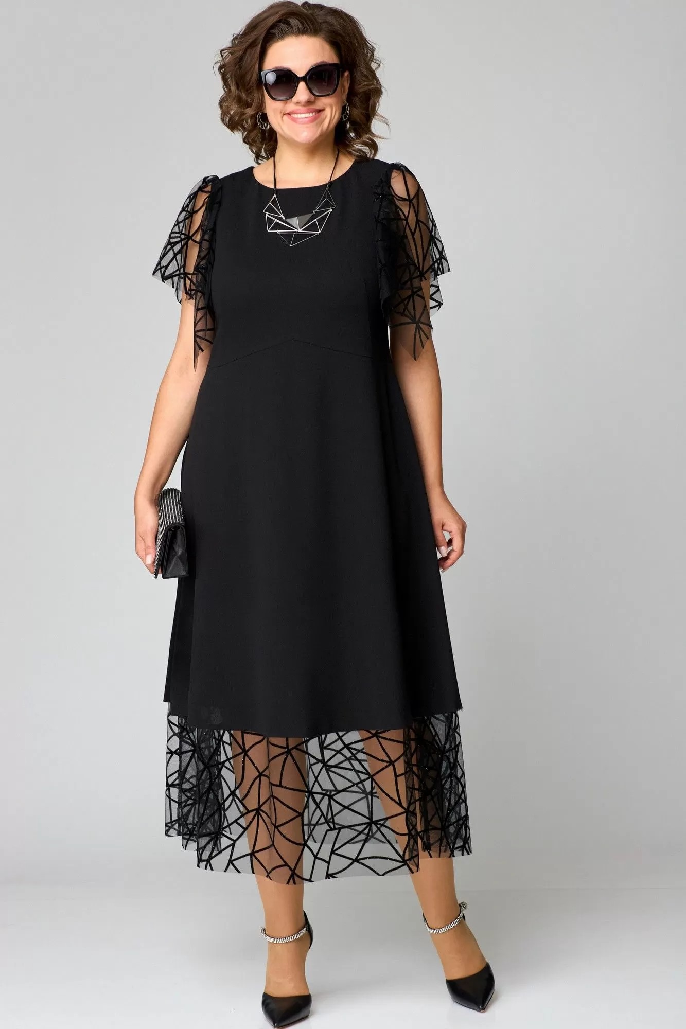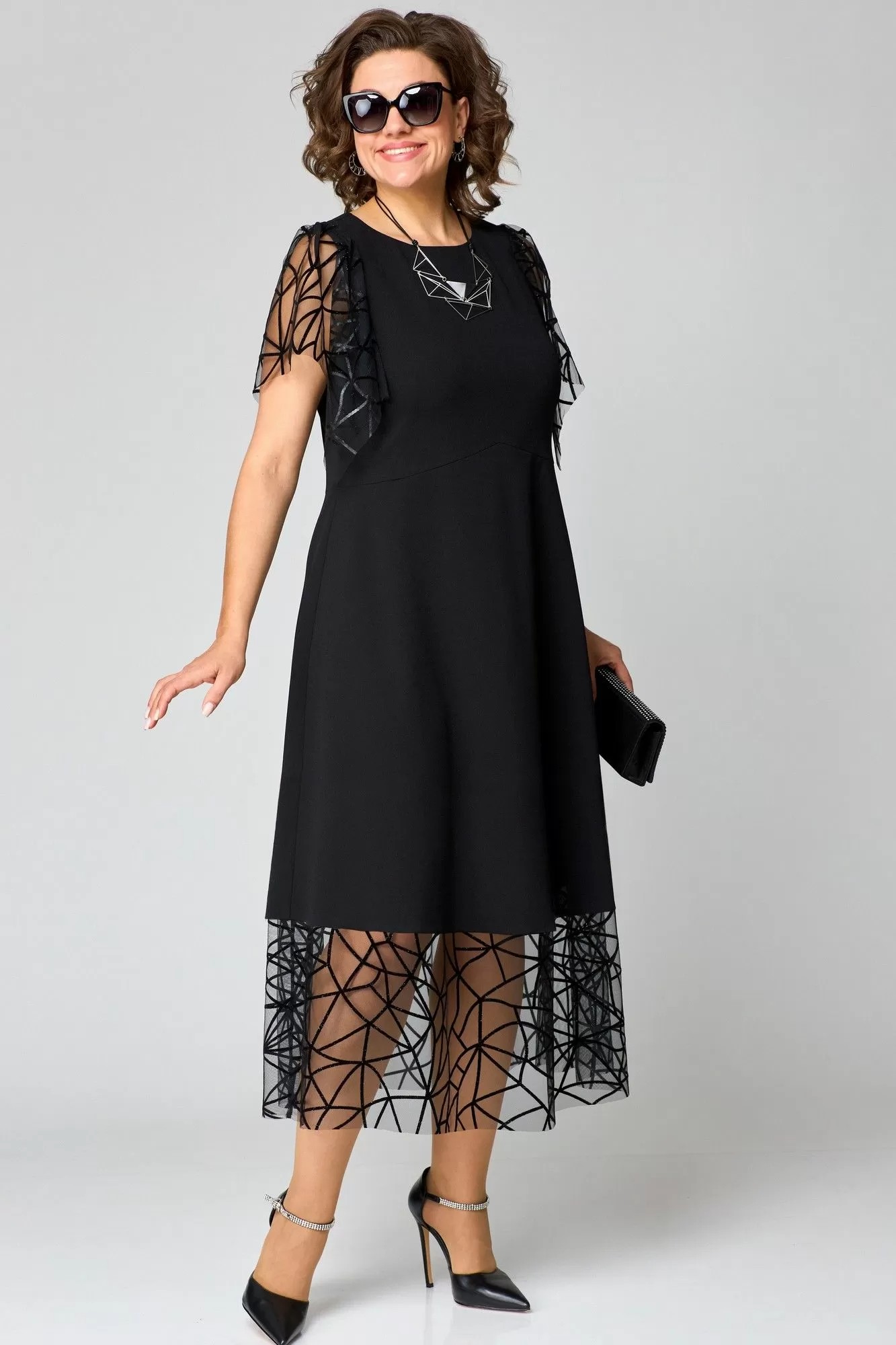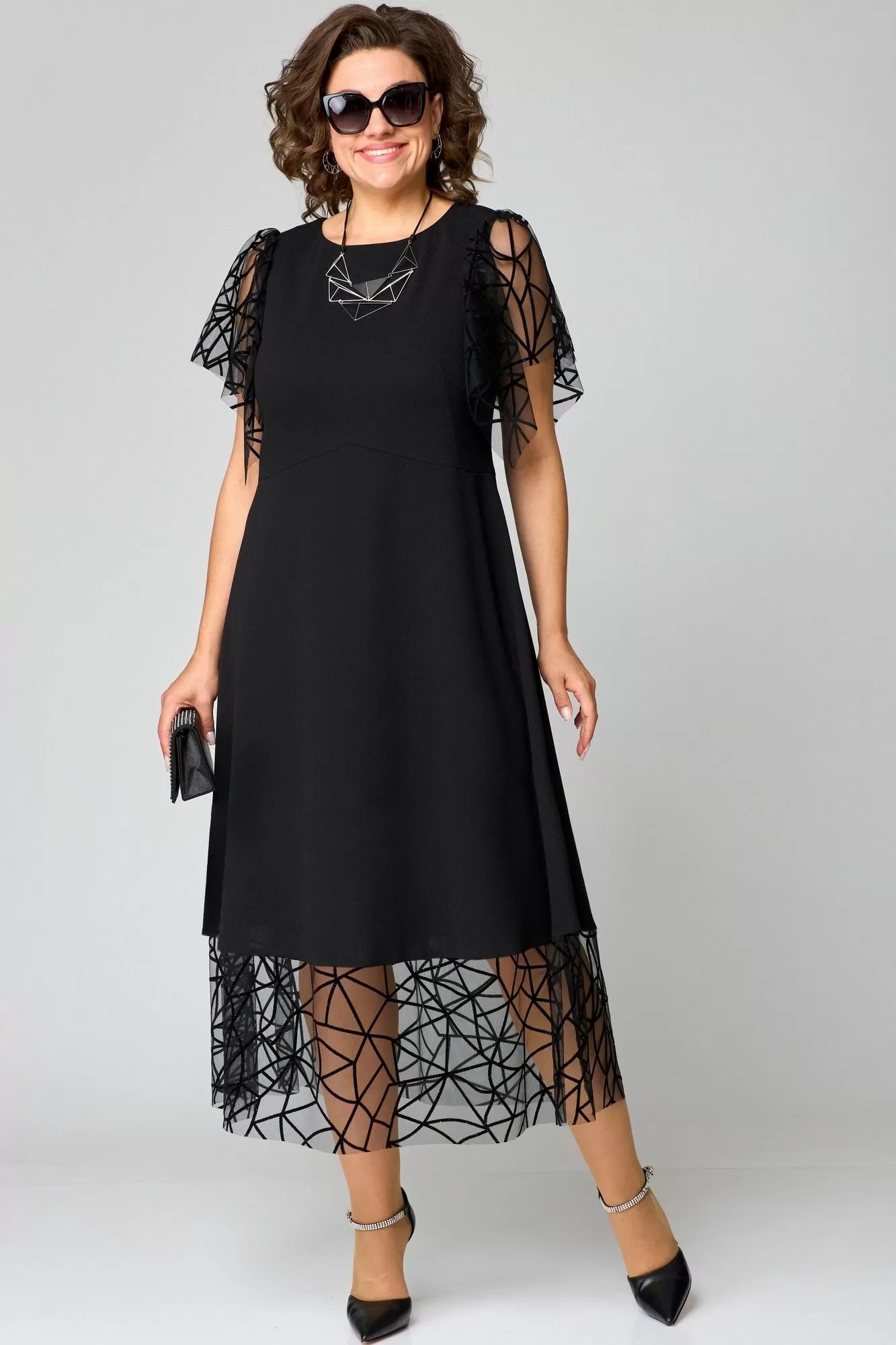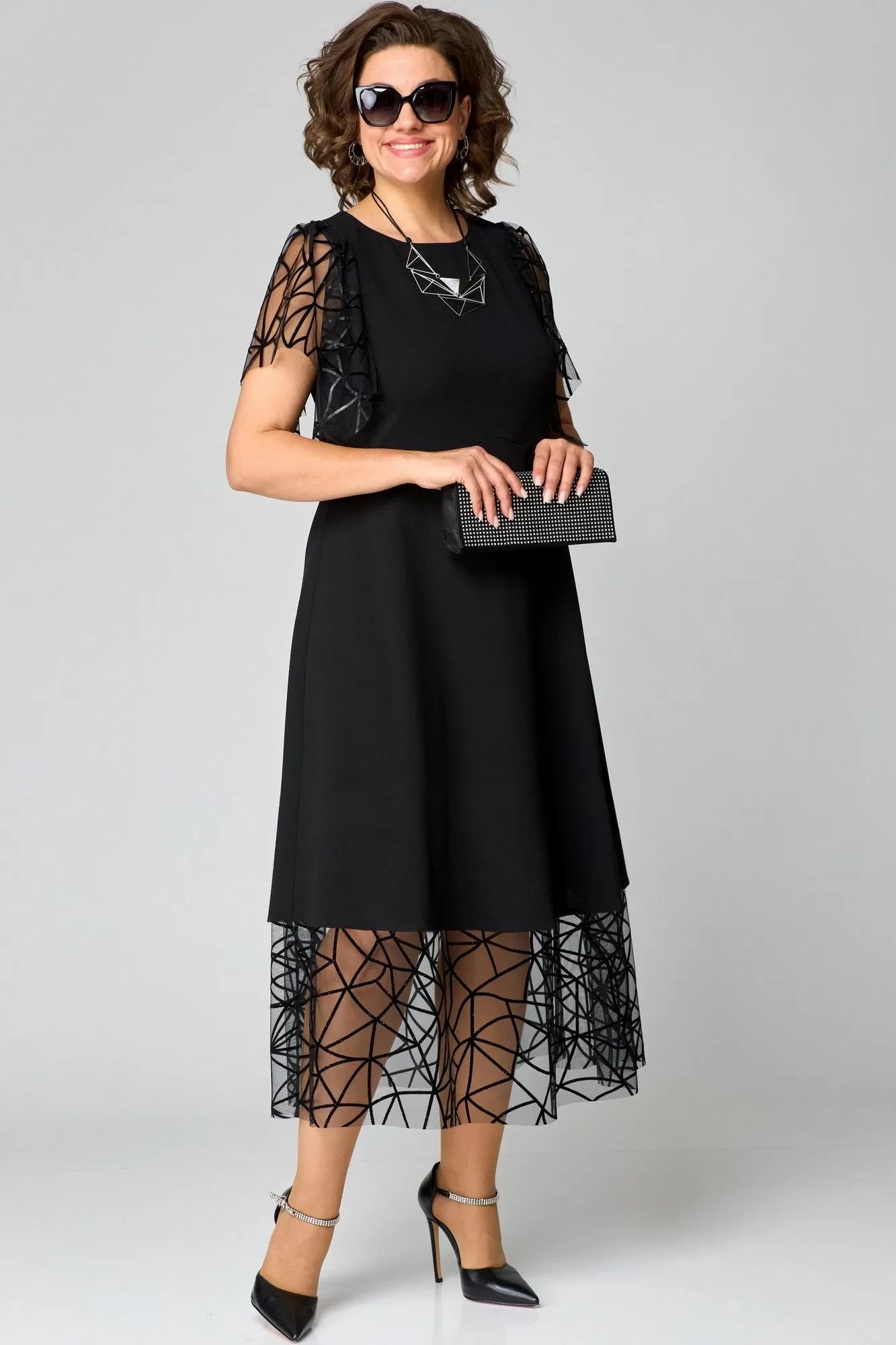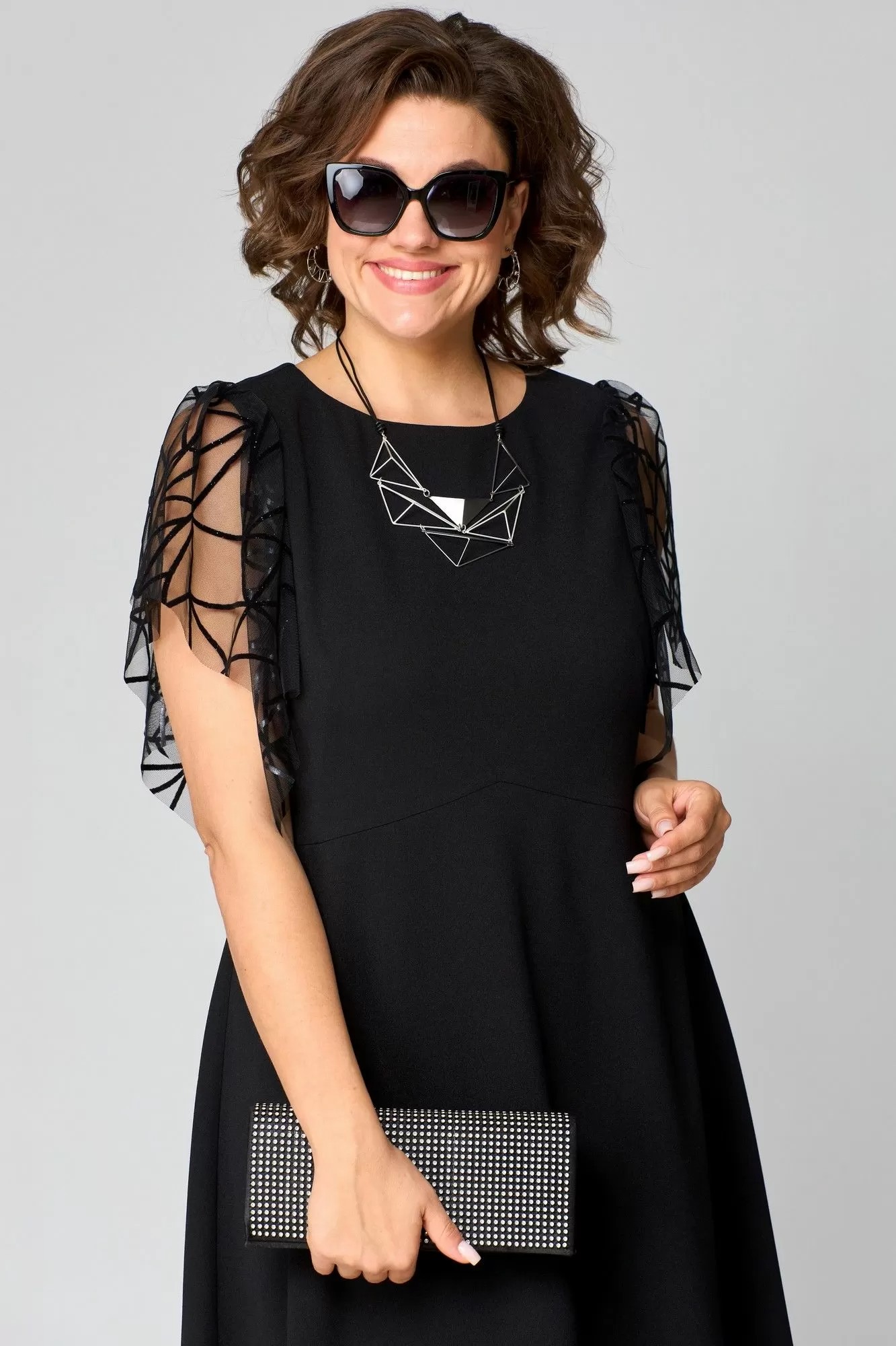 Платье женское нарядное полуприлегающего силуэта расширенное к низу, выполнено из плательного крепа в сочетании с отделкой из флока с набивным рисунком. Вырез горловины круглый на обтачке, по спинке застежка на одну навесную петлю и пуговицу. Проймы обработан обтачкой, рукав фэнтези по окату со сборкой. Платье с фигурным подрезом по полочке. По низу платья волан из отделочной ткани. Декором служит дизайн отделочной ткани.