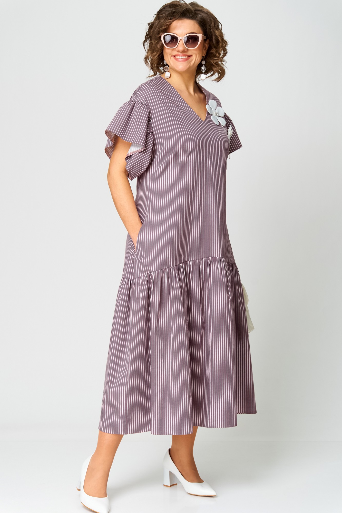 Платье женское нарядно-повседневное полуприлегающего силуэта расширенное к низу за счет волана со сборкой. Выполнено из хлопка. Вырез горловины V-образный, рукав втачной спущенный к низу с притачным воланом со сборкой. В боковых швах обработаны карманы. Декором платья служит съемный цветок.