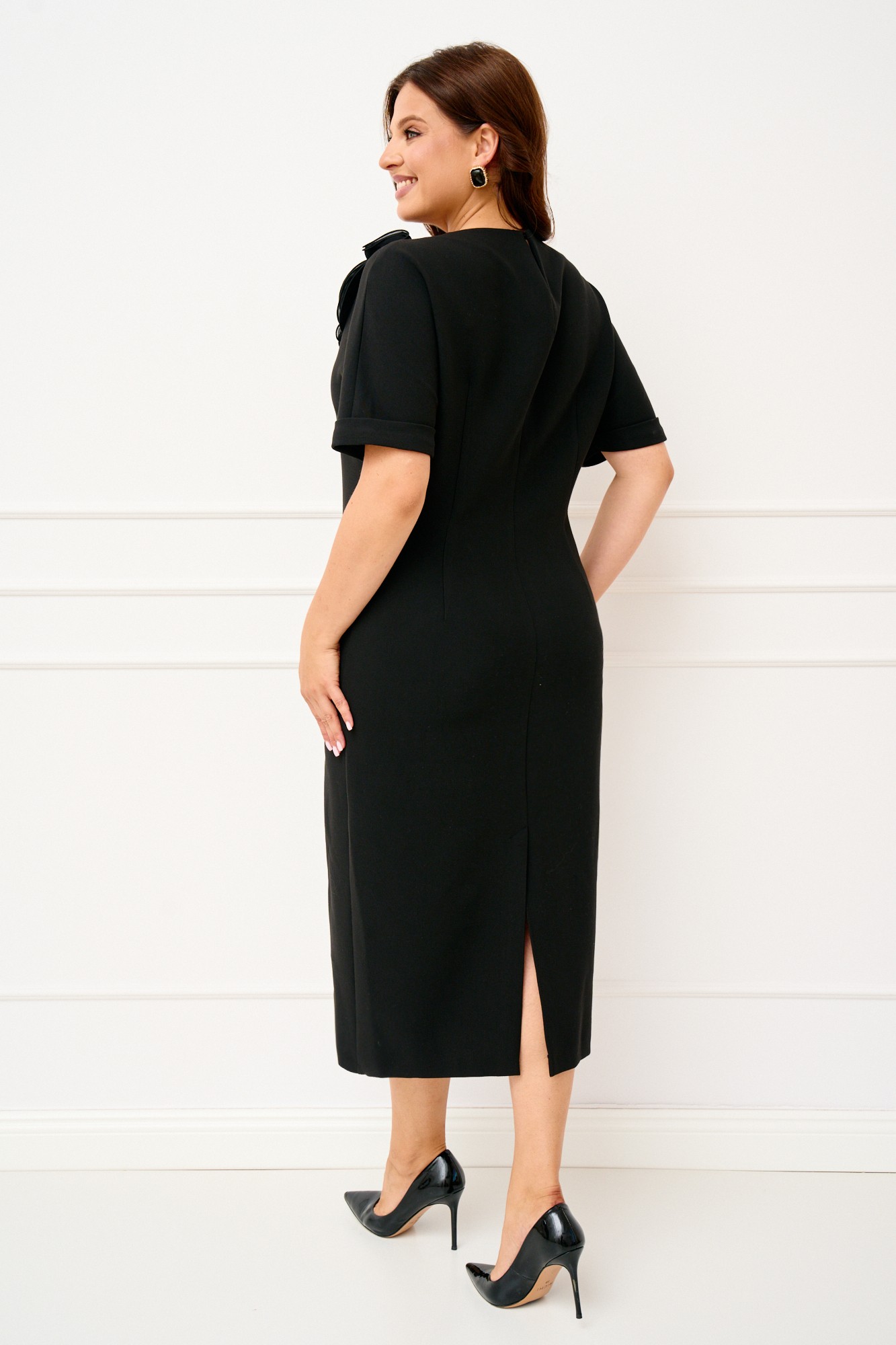 Женское платье полуприлегающего силуэта выполнено из плательной ткани со втачными рукавами и декоративным несъемным цветком; по спинке вырез в виде капельки, который застегивается на петлю и пуговицу; по низу - шлица. Платье полностью соответствует заявленному размеру.