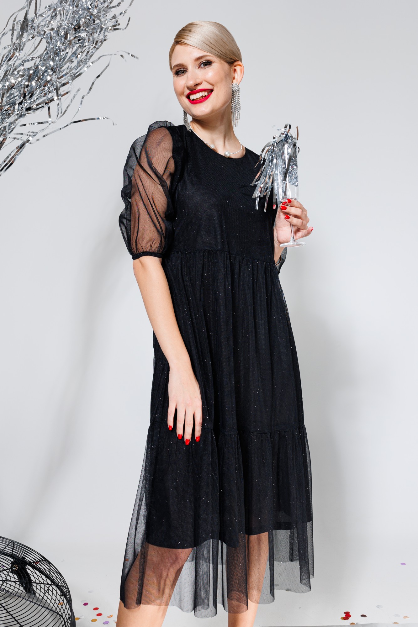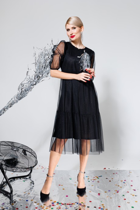 Платье миди в мерцающую сетку. Платье ярусами со сборкой. Застежка сзади на пуговицу. Платье на подкладке. Стильное платье которое сделает ваш образ женсвенным. Если вы не любите яркие и вызывающие вещи, то это платье для вас. Базовое черное платье это основа любого гардероба.