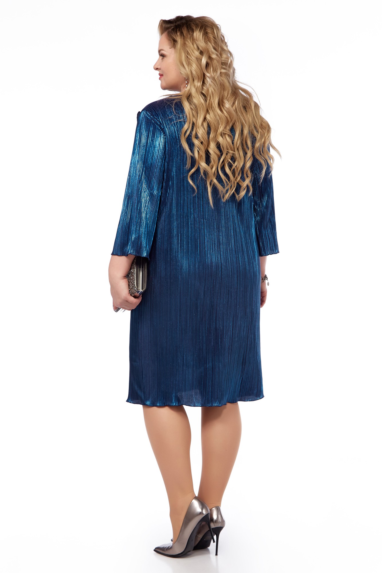 Нарядное платье прямого силуэта выполнено из ткани «плиссе» с эффектным блеском. Впереди отлетная деталь наискосок, рукав ¾. Съемный цветок из той же ткани - модное веяние нынешнего сезона. Платье на трикотажной подкладке.