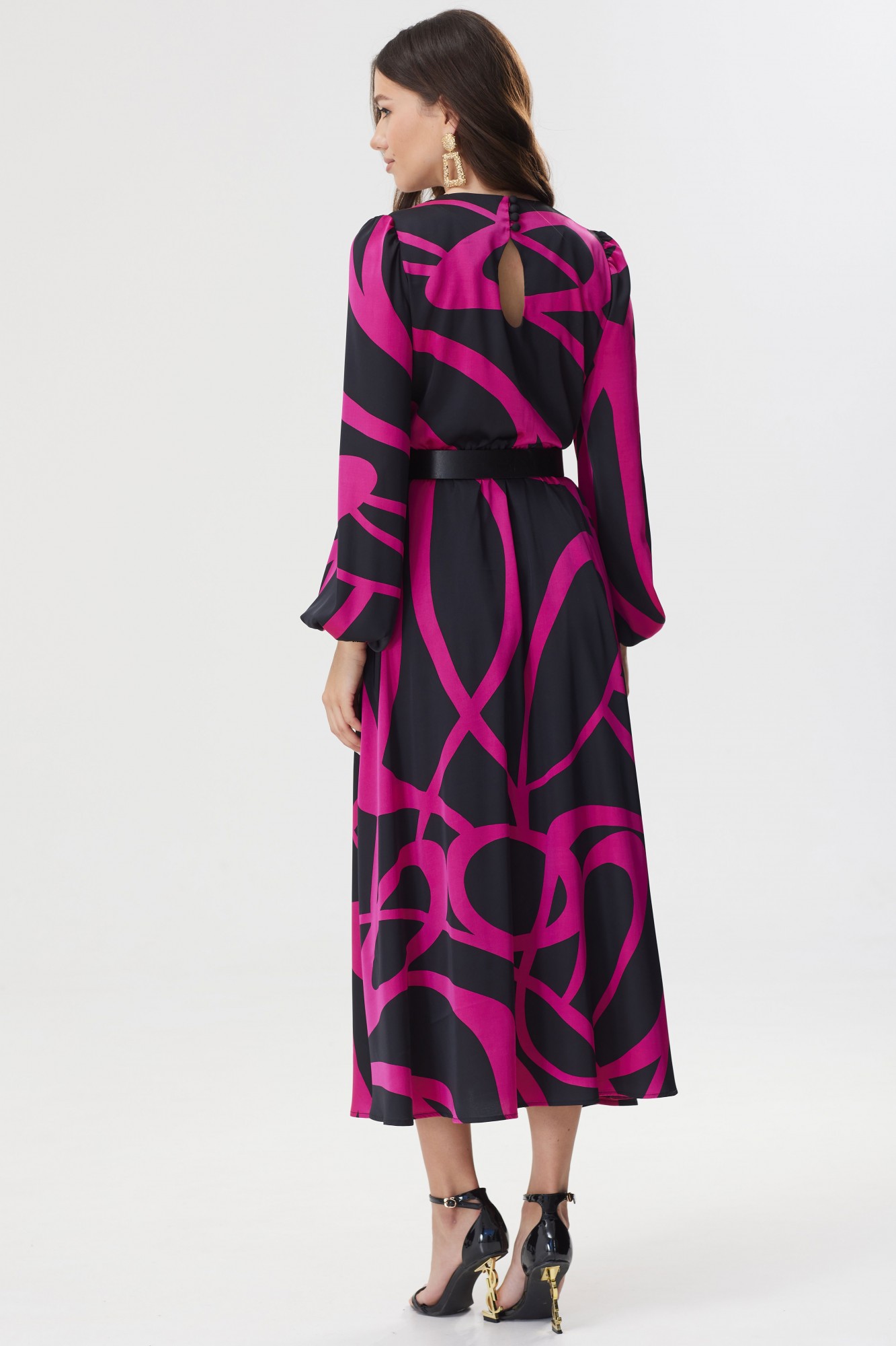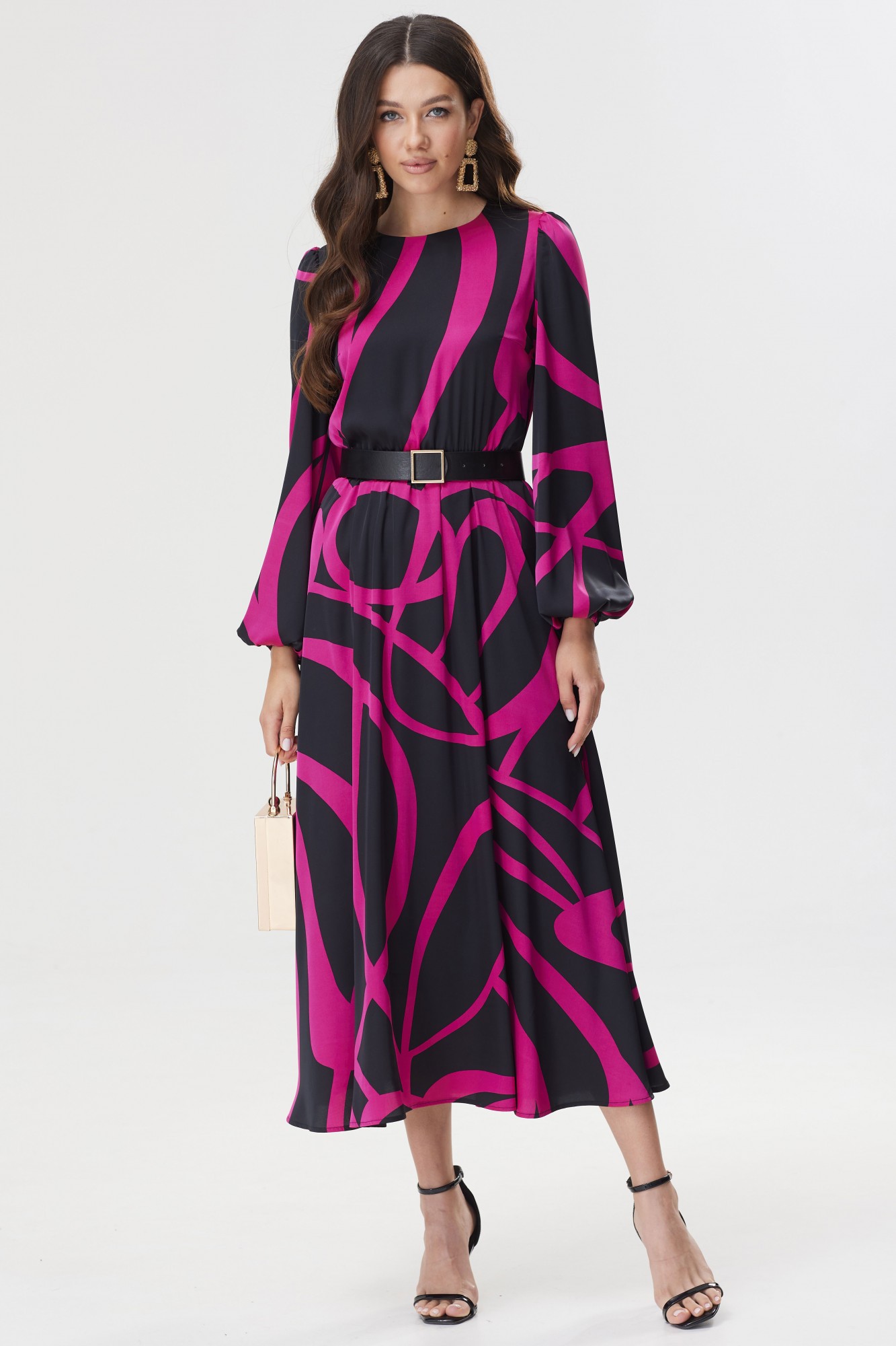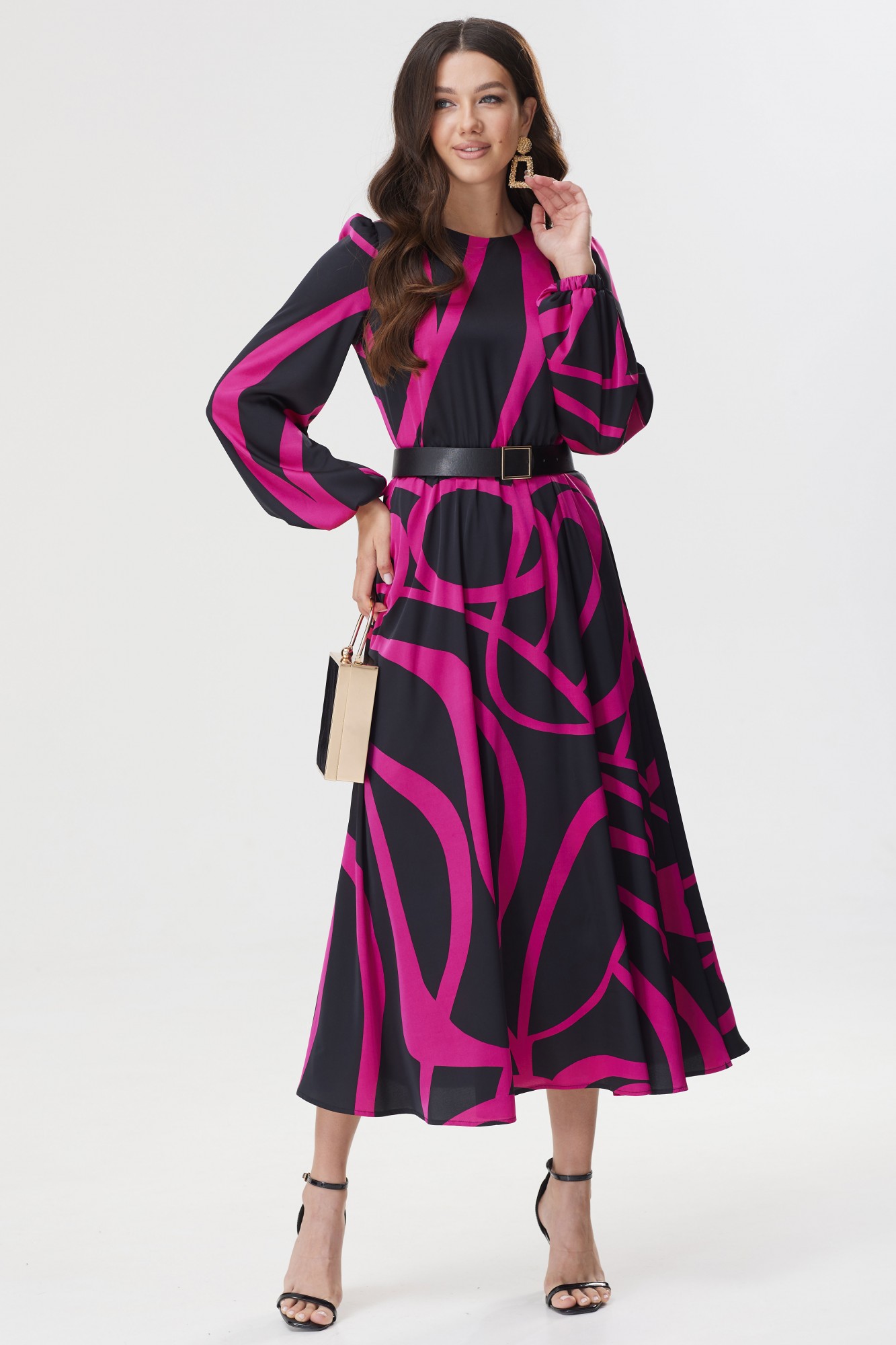 Стильное платье полуприлегающего силуэта из плательной ткани с принтом. Горловина округлая. На спинке декоративный вырез с застежкой на петли и пуговицы. Рукав втачной, по окату сборка, по низу манжета на резинке. Платье отрезное по линии талии, в подрез вставлена резинка. В комплект входит съемный пояс. Обращаем ваше внимание, что фурнитура может незначительно отличаться от фото.