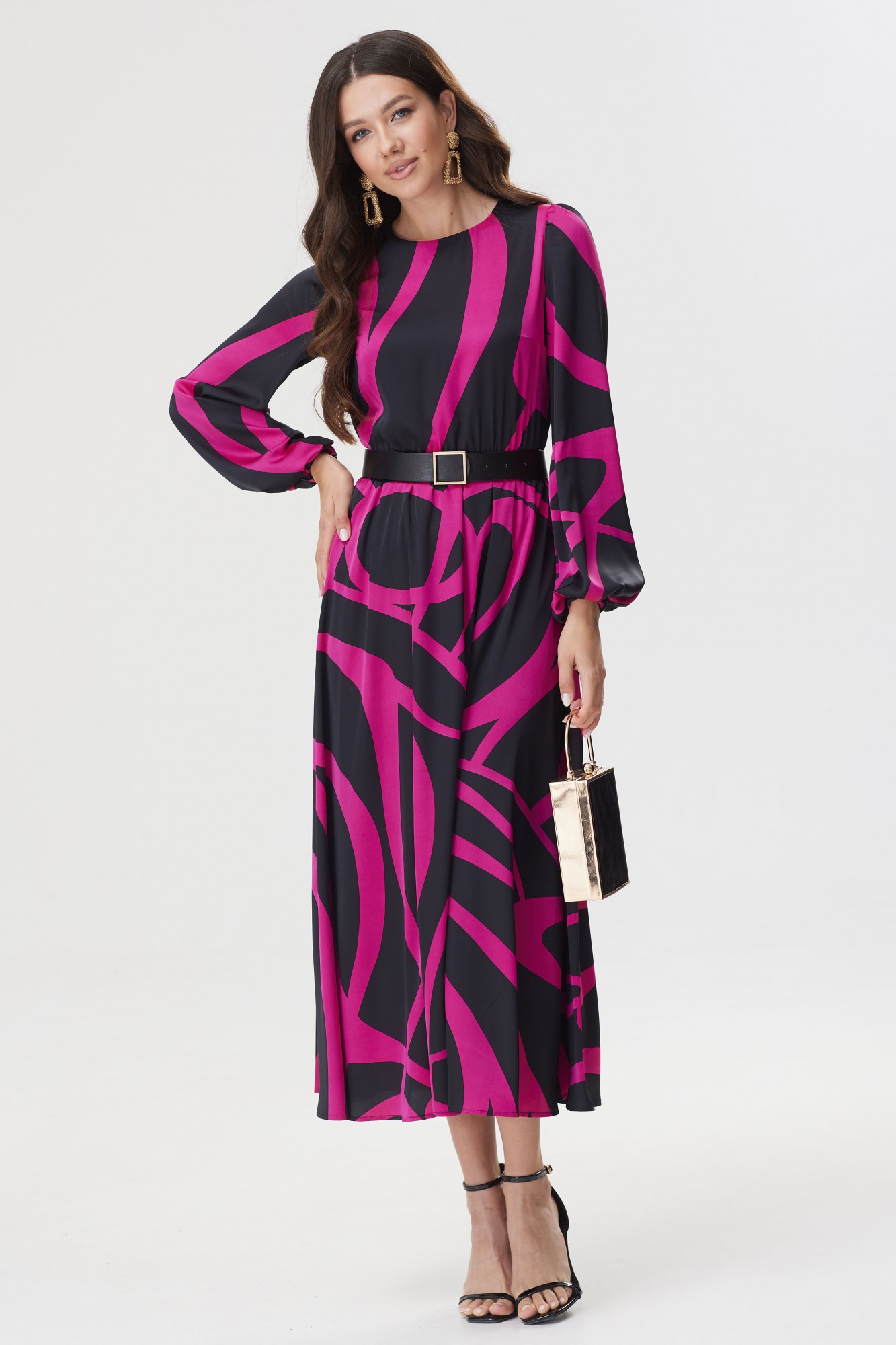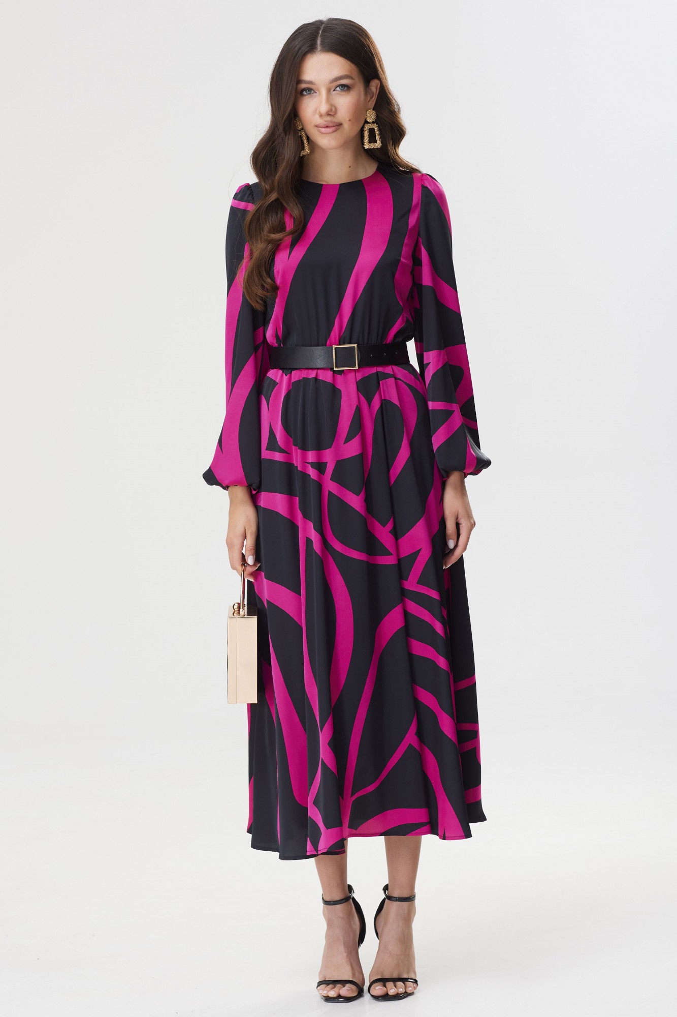 Стильное платье полуприлегающего силуэта из плательной ткани с принтом. Горловина округлая. На спинке декоративный вырез с застежкой на петли и пуговицы. Рукав втачной, по окату сборка, по низу манжета на резинке. Платье отрезное по линии талии, в подрез вставлена резинка. В комплект входит съемный пояс. Обращаем ваше внимание, что фурнитура может незначительно отличаться от фото.
