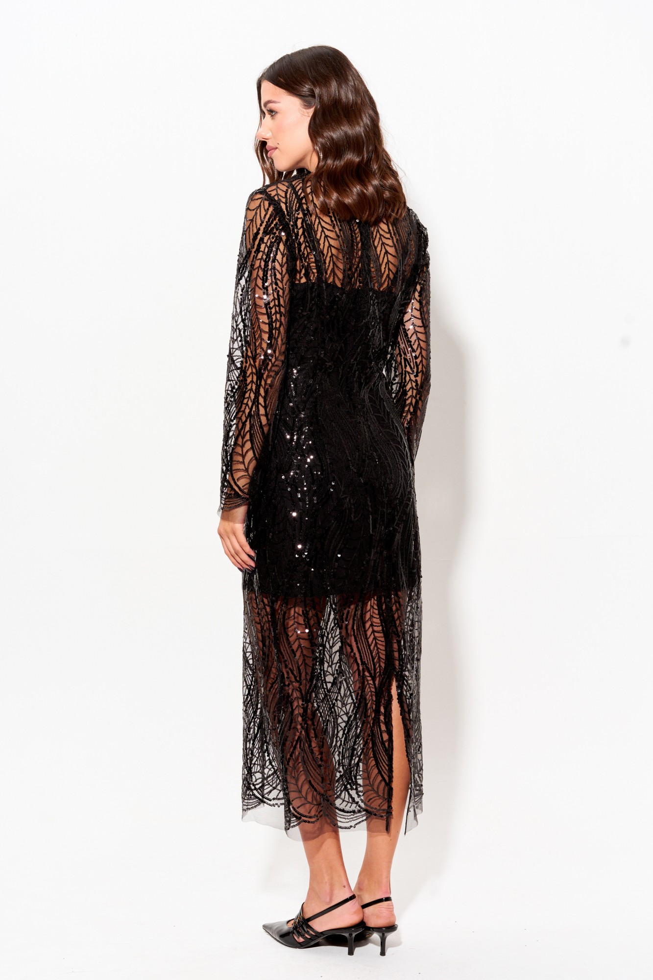 Платье полуприлегающего силуэта из эффектной ткани с пайетками . Горловина округлая. Рукав втачной длинный. На спинке в центральном шве застежка на потайную молнию, по низу платья разрез. В комплект входит нижнее платье на бретельках из эластичного трикотажного полотна.