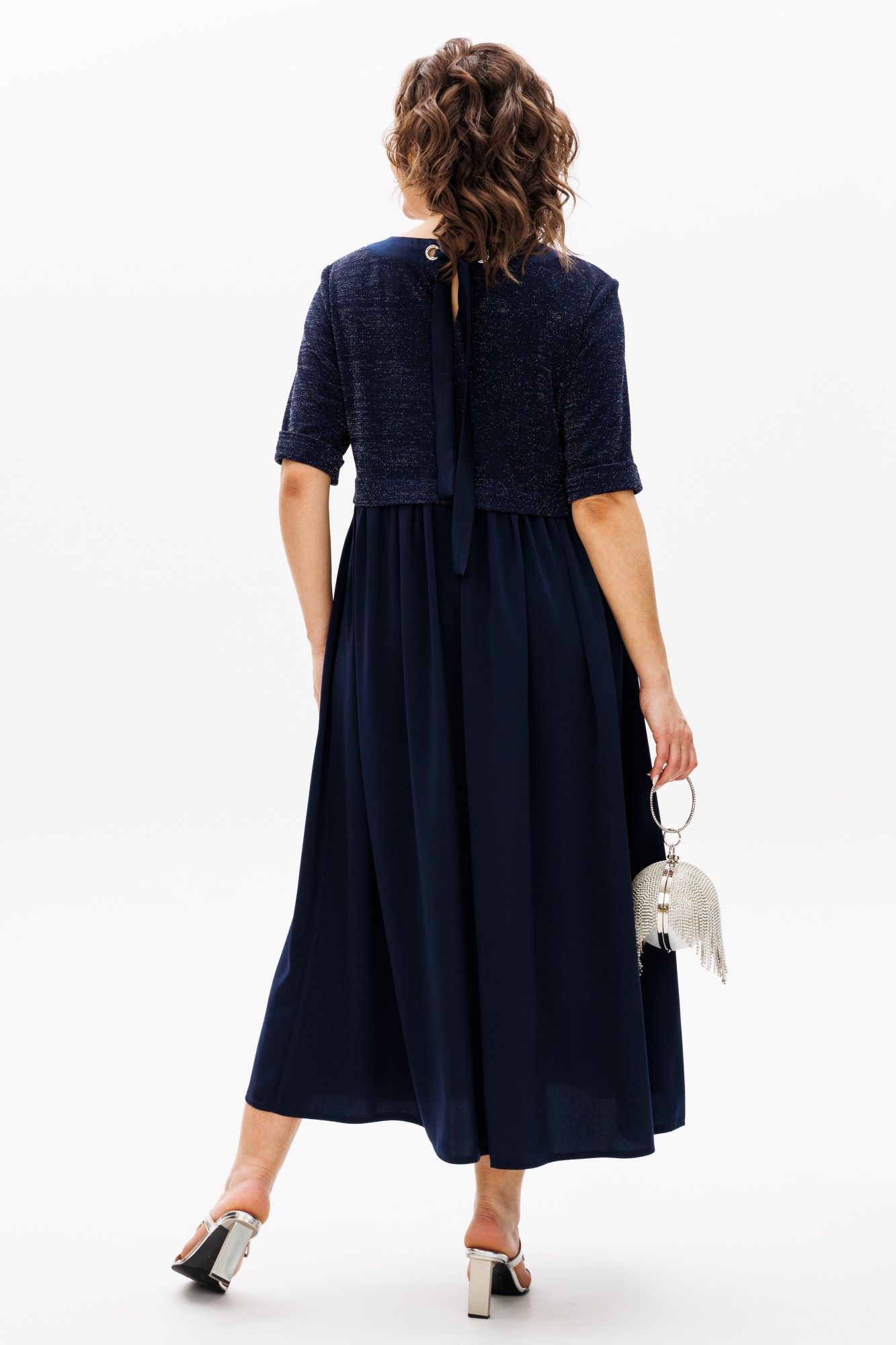 Универсальное и комфортное платье на любой случай вашей жизни. Верхняя часть платья выполнена из фактурного трикотажа с добавлением люрекса; нижняя — из струящейся легкой вискозной ткани с эффектом «атласа». Изделие прекрасно вольется в ваш гардероб. Верх платья с завышенной талией и округлой горловиной с отделочной широкой планкой, спинка с центральным швом и завязкой по горловине. Втачной рукав длиной 3/4. Низ платья — длинная свободная летящая юбка со сборкой из-под верхней части платья, которая обеспечит легкость движений и комфорт. Данный фасон дает возможность создания стильного образа как для повседневной носки, так и для праздника. Эта одежда будет уместна как осенью и зимой, так и весной.