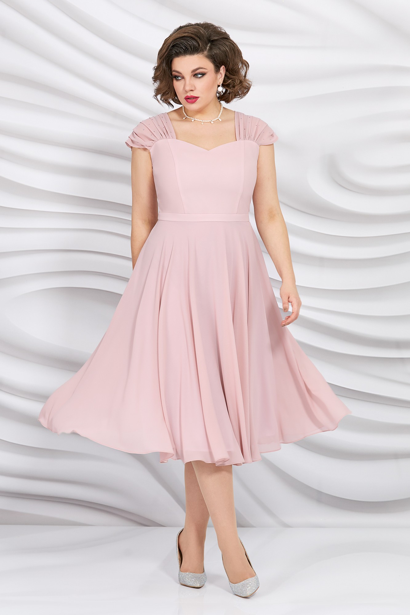 Нарядное женское платье полу-прилегающего силуэта, выполнено из шифона с блеском. Лиф платья отрезной по линии талии, из шифона на подкладке, с рельефами и втачным поясом. Горловина фигурная, кокетка платья присборена по плечевому и плавно переходит в небольшой рукав, кокетка декорирована стразами. Юбка платья расклешенная, средней длины, спинка идентична полочке, лиф отрезной по линии талии, со средним швом и рельефами, в среднем шве потайная молния. Нарядное платье с роскошной юбкой и эффектным декором прекрасно подойдет для торжественных случаев!