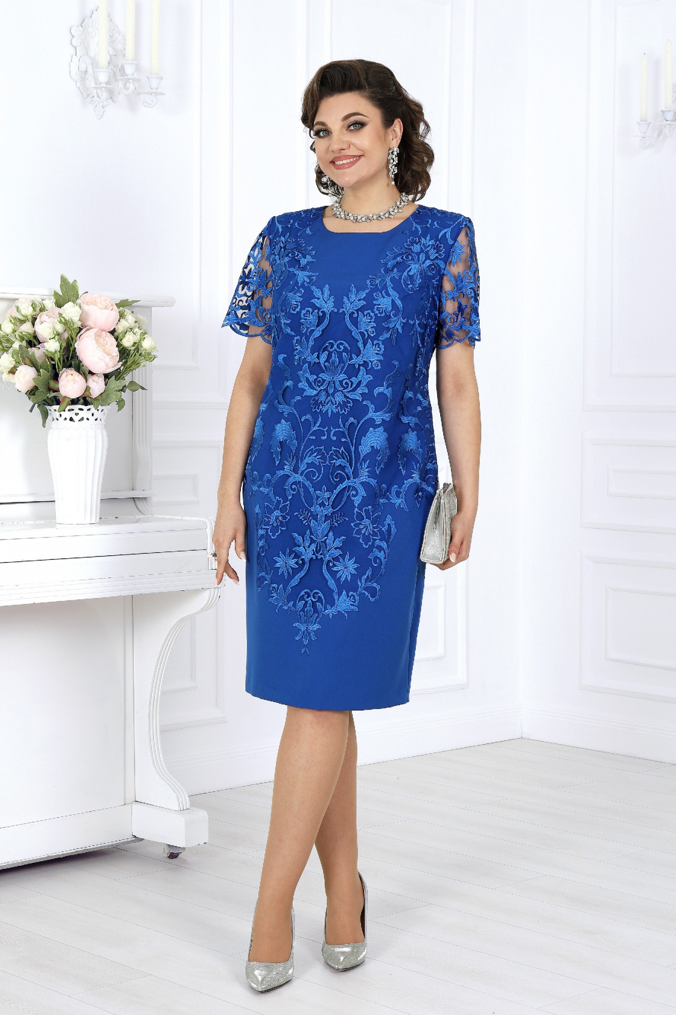 Представляем вашему вниманию изысканное нарядное платье футляр, которое станет идеальным выбором для особых событий и вечерних мероприятий. Это платье не только выглядит прекрасно, но и формирует правильный силуэт фигуры. Кружево акцентирует внимание на нужных местах, создавая эффектное и женственное очертание фигуры. Платье женское, полуприлегающего силуэта, зауженное к низу, выполнено из костюмно- плательной ткани и гипюра, длина по среднему шву спинки 48-52 размер - 102 см; 54-62 размер - 104 см. Перед и спинка платья с настроченным гипюром, с фигурным низом, направленным от бокового шва вниз к центру. Перед с нагрудными вытачками из проймы. Спинка с таллиевыми вытачками и средним швом, в котором обработана шлица. Застёжка на потайную тесьму -молнию расположена в левом боковом шве. Вырез горловины переда и спинки округлой формы, по переду углубленный. Рукава втачные, одношовные из гипюра. Низ рукава оформлен фестонами. Длина рукава 48-52 размер - 26 см; 54-62 размер - 33 см. Платье с плечевыми накладками.