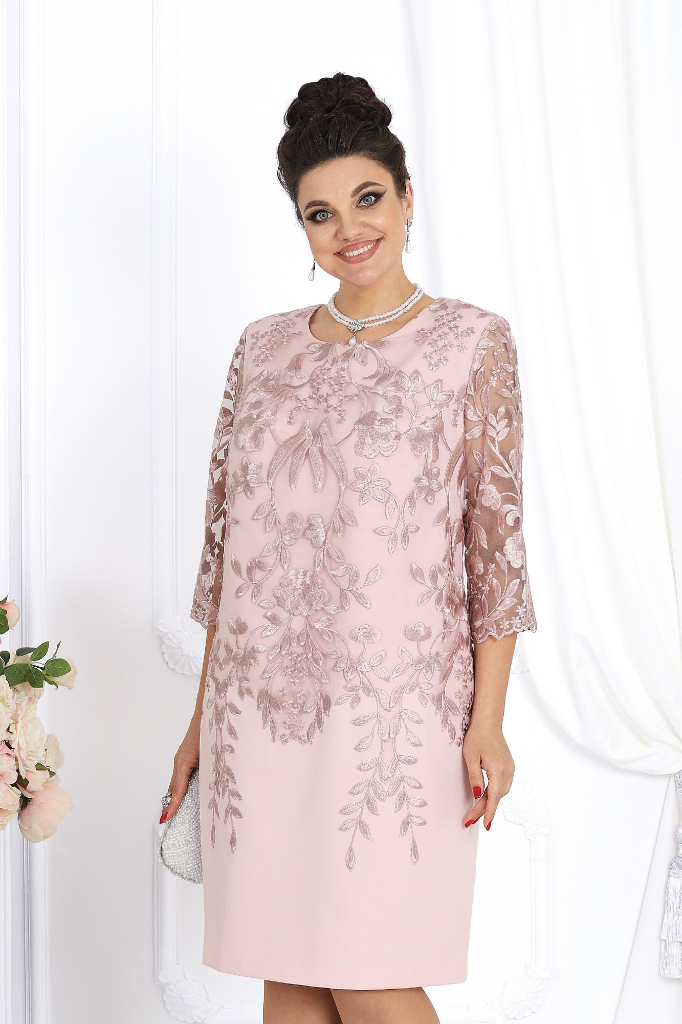 Представляем вашему вниманию изысканное и элегантное нарядное платье футляр длины миди. Это платье, состоящее из двух слоев, обладает неповторимой красотой и изысканностью. Первый слой платья выполнен из плательной ткани, что обеспечивает комфорт и приятное ощущение на теле. Сверху нежное кружево с цветочным узором придает платью изысканный шарм и элегантность. Такое сочетание текстур создает гармонию и добавляет в образ женственности и романтики. Платье женское полуприлегающего силуэта, зауженное к низу, из костюмно-плательной ткани в сочетании с гипюром. Длина по среднему шву спинки р 50-52 - 101,5 см, р 56-66 – 103,5 см. Перед и спинка двухслойные от плечевого шва до нижней линии бедер, с надстрочными декоративными веточками, направленными к низу изделия. Верхний слой выполнен из гипюра. Перед с нагрудными вытачками, идущими из пройм. Спинка, с таллиевыми вытачками в нижнем слое, со средним швом, в нижней части которого расположена шлица. В левом боковом шве обработана застёжка на потайную тесьму - молнию. Горловина переда и спинки округлая, по переду углубленная. Рукава втачные, одношовные, выполнены из гипюра. Низ рукавов оформлен фестонами. Длина рукава 44 см. Платье с плечевыми накладками.