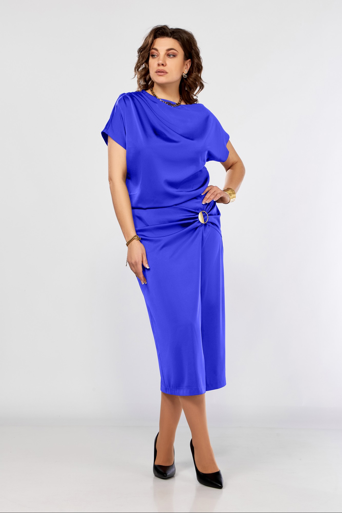 Шикарное нарядное платье, полуприлегающего силуэта из струящейся ткани с цельнокроеным рукавом, коротким, ассиметричного силуэта. Платье отрезное по талии, с молнией потайной в боковом шве. По плечевому шву по переду и спинке заложены складки. Нижняя часть с разрезом, декоративной не сьемной пряжкой. Талия присобна на резинку.