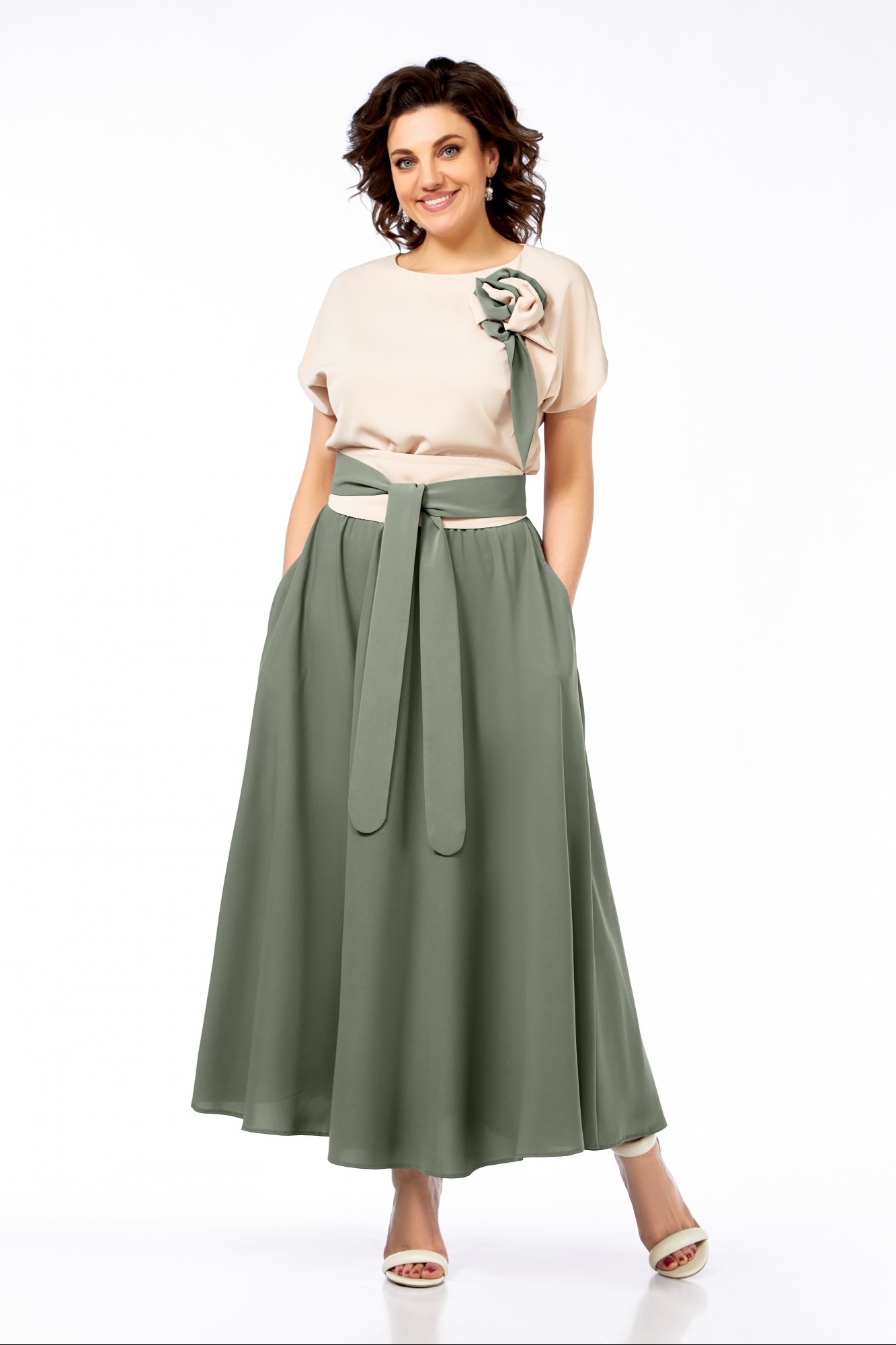 Нарядное платье длиной макси свободного силуэта, выполнено из двух оттенков. Отрезное по линии талии, резинка по спинке. Горловина овальной формы, спущенная линия плеча. Нижняя часть платья клеш-полусолнце, карманы в боковых швах. Пояс из основной ткани из двух цветов. Декоративный цветок-брошь ручной работы.