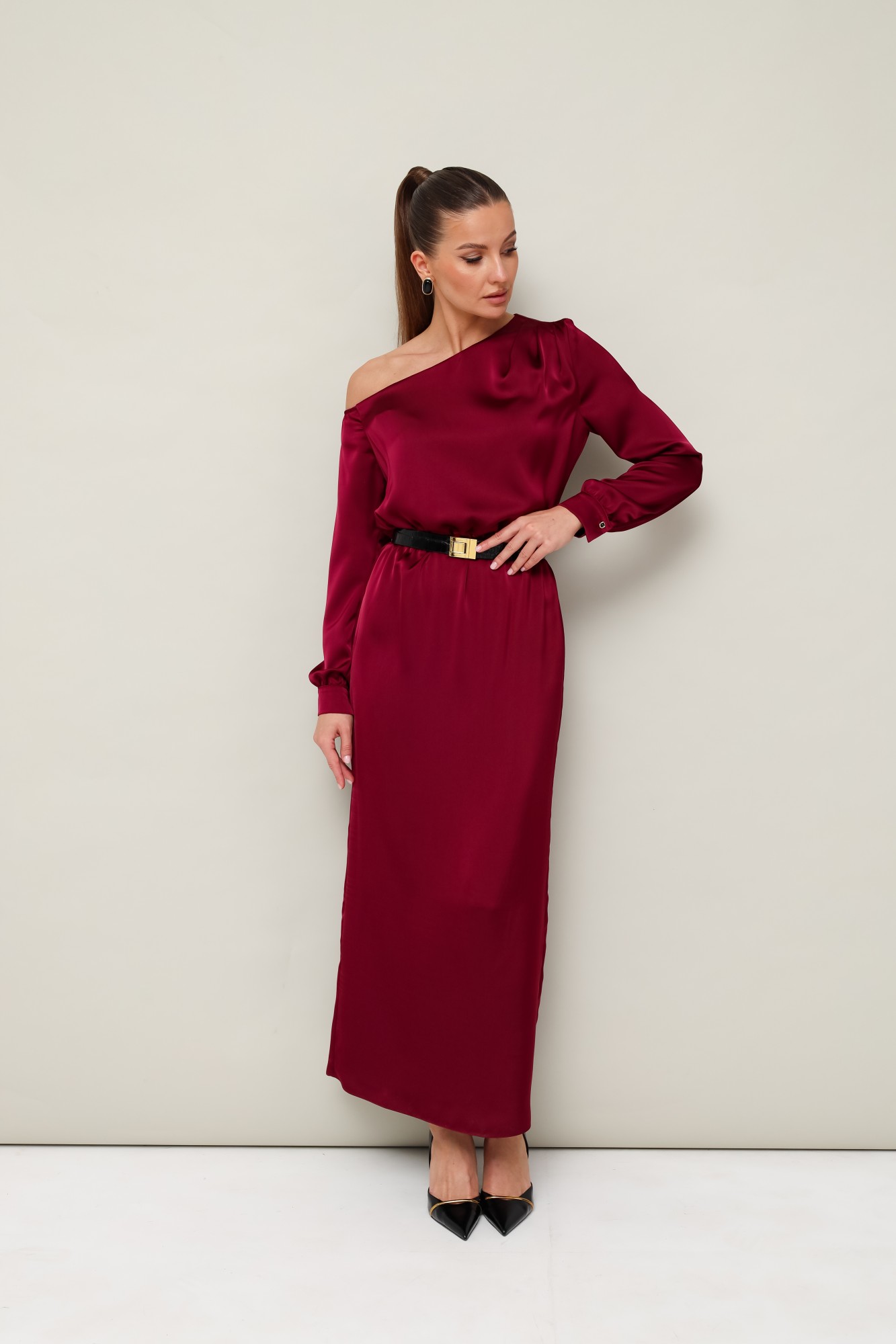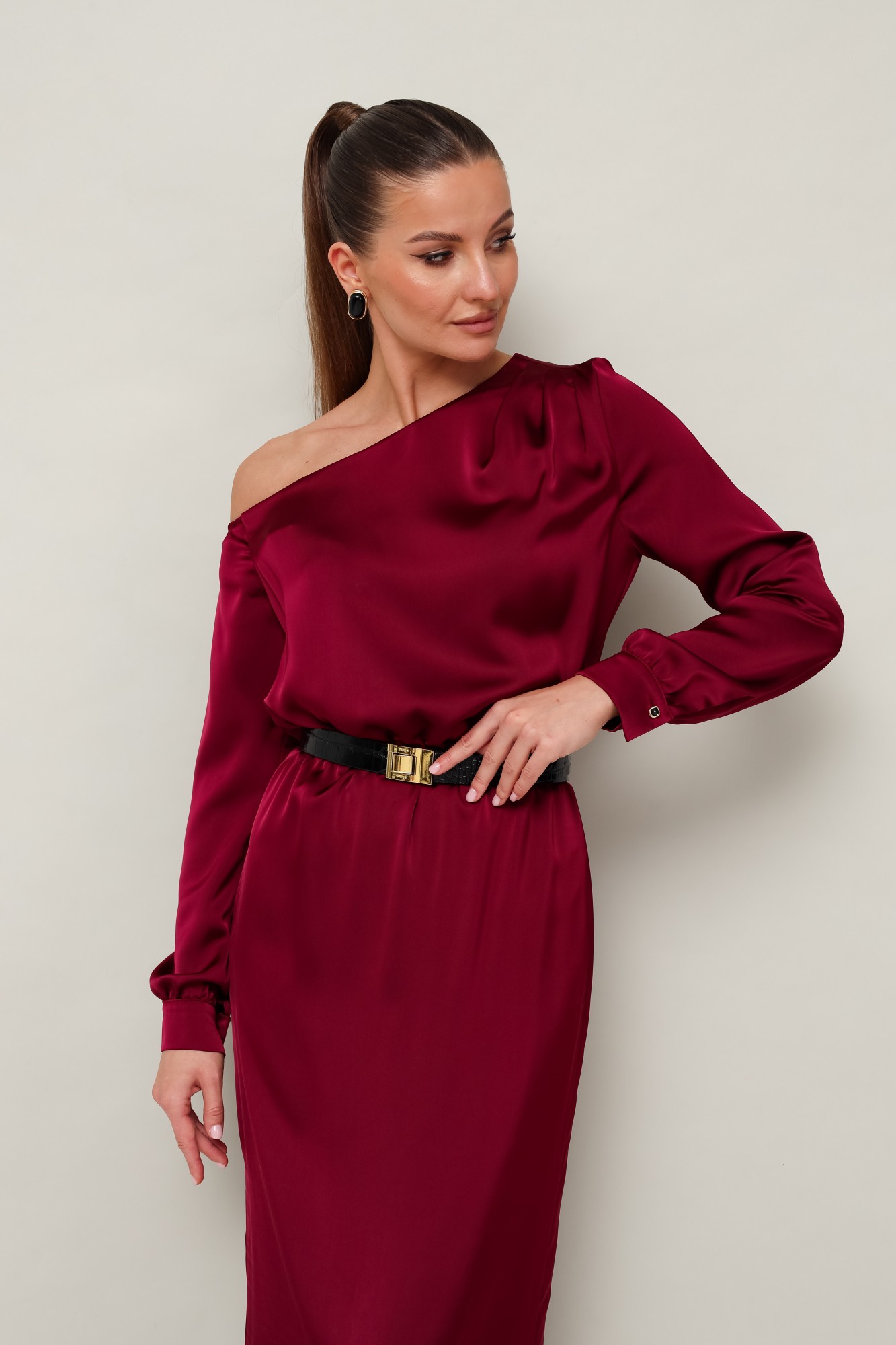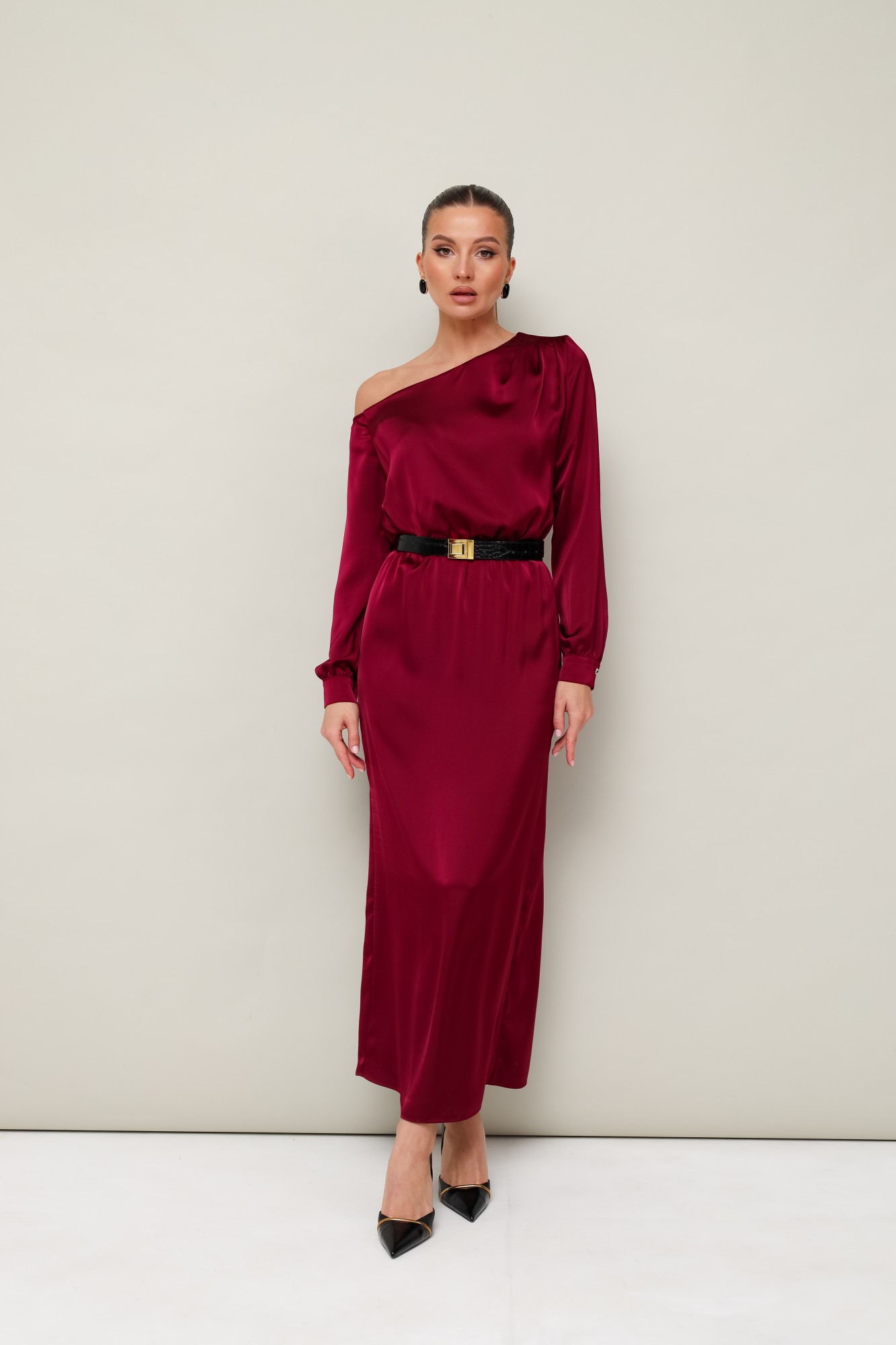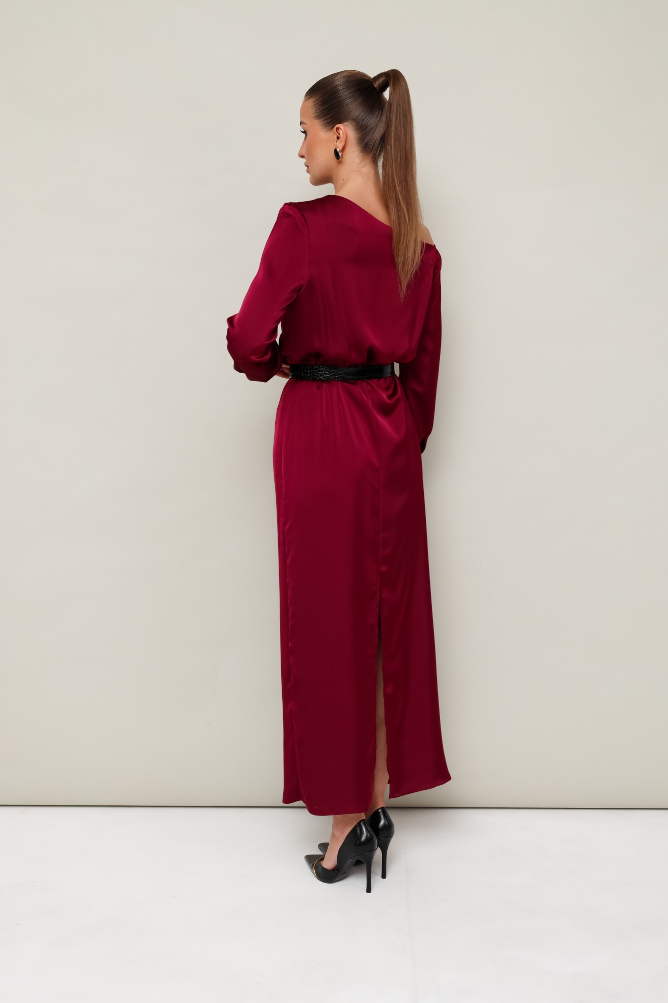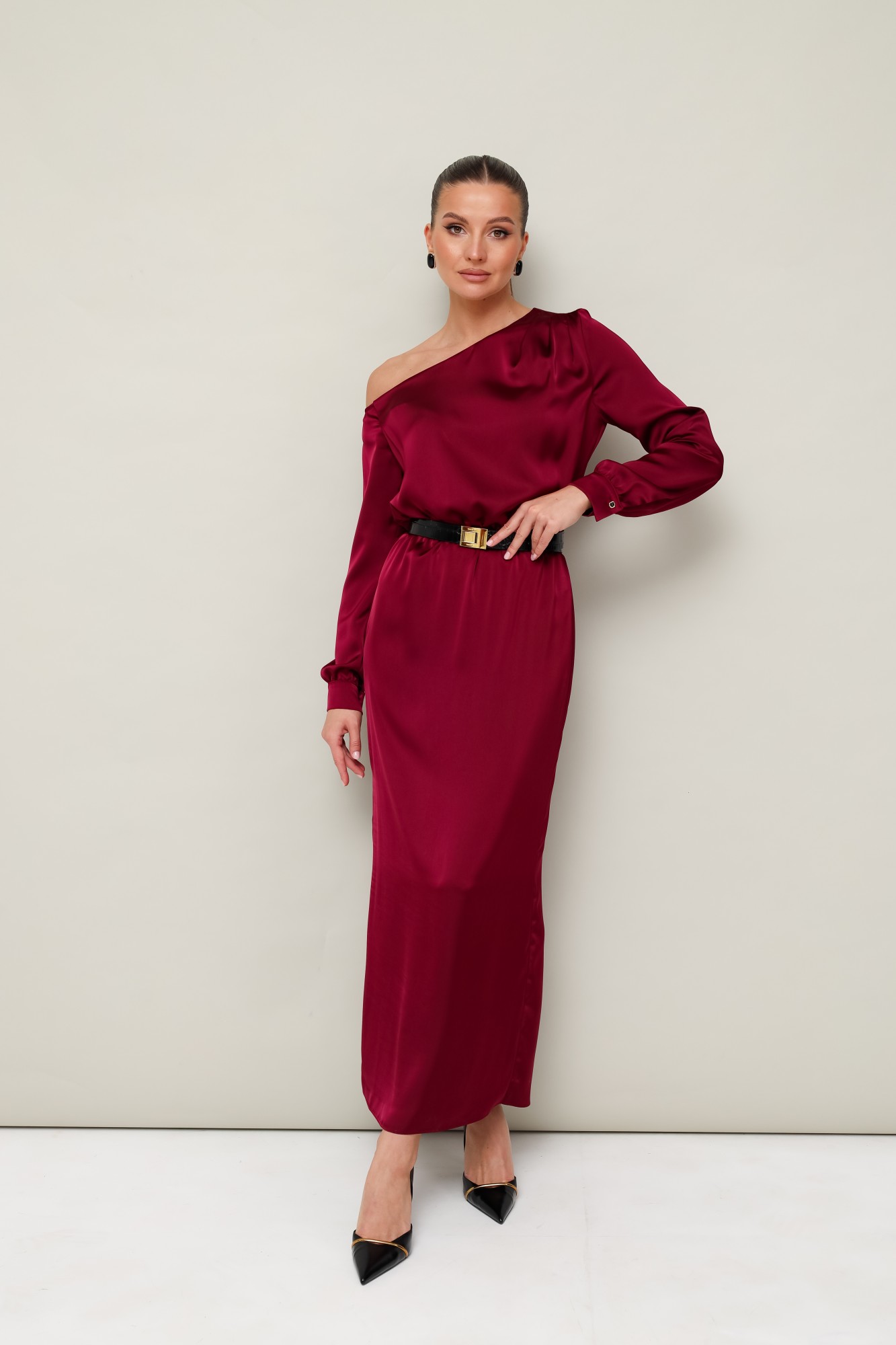 Вечернее платье полуприлегающего силуэта, выполнено из струящейся ткани с благородным матовым блеском. Ассиметричный вырез горловины с открытым плечом. Правый плечевой шов декорирован складками. Платье отрезное по линии талии на резинке. Рукава длинные с манжетами с застежкой на петли и пуговицы. По спинке в среднем шве юбки обработан разрез. В комплекте прилагается ремень с акцентной пряжкой.