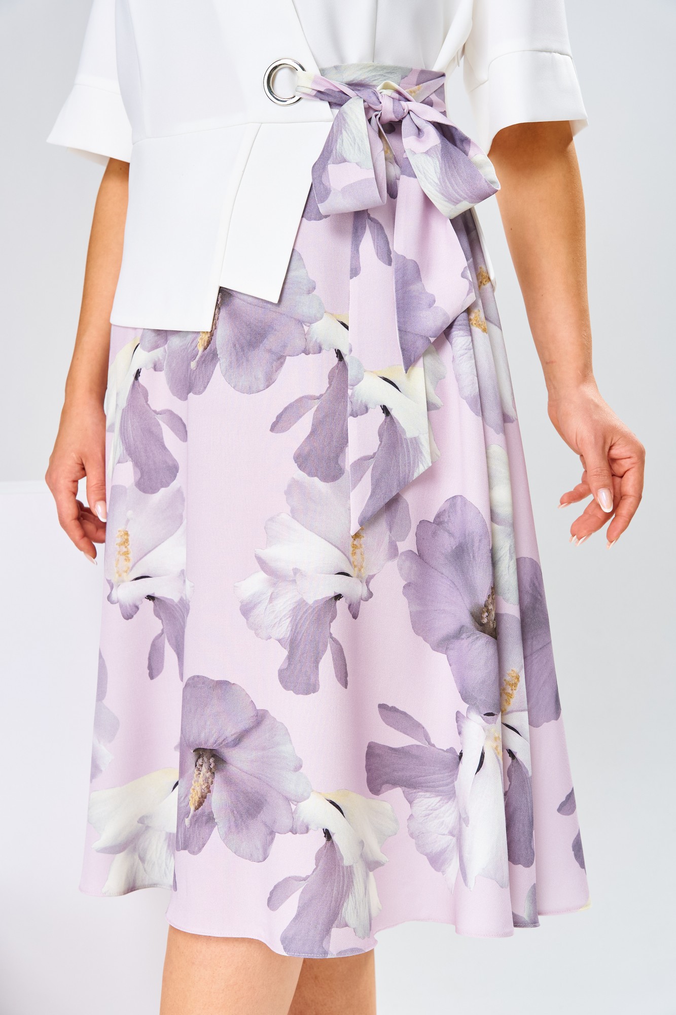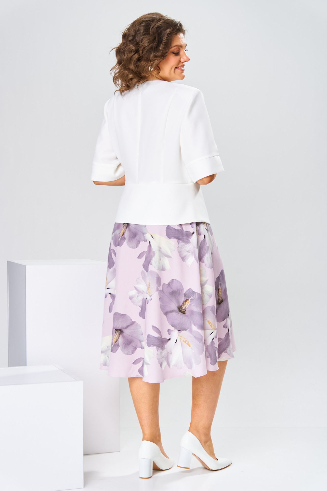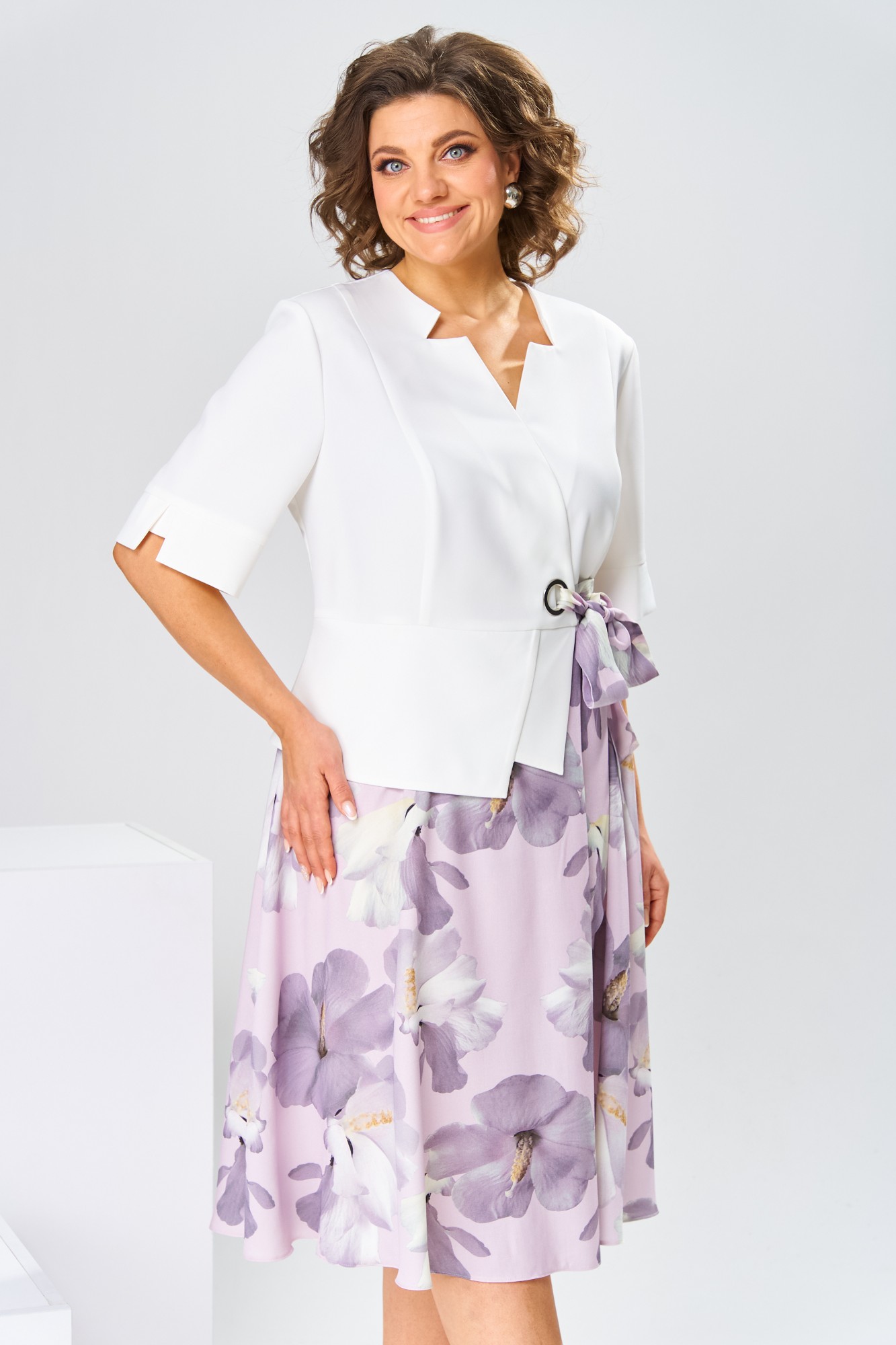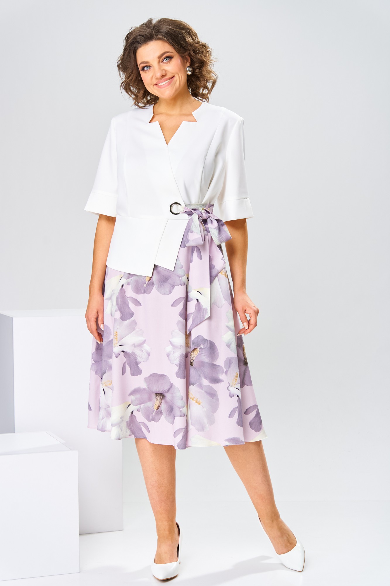 Платье женское относится к нарядной торжественной одежде, но может использовано и при повседневной носке. Платье женское, отрезное по линии талии, расширенное к низу, длиной за колено. Верхняя часть переда с отрезными рельефами, выходящими из плечевых швов, центральная часть с зафиксированным запахом. Верхняя часть спинки со средним швом и 2-мя рельефами, выходящими из плечевых швов. Горловина с V-образным вырезом, фигурная, обточная без воротника. Нижняя часть переда и нижняя часть спинки цельнокроеные, выполнены из отделочной ткани. Шов соединения верхней и нижней частей платья декорирован притачной фигурной отлетной баской. Платье с декоративным поясом из отделочной ткани, закреплённом на левом боковом шве и фиксирующимся в бант через металлическую пробивную блочку на центральной части переда. Рукав одно шовный втачной, длиной до локтя, с притачной фигурной манжетой. Платье с плечевыми накладками. Нижняя часть на подкладке.