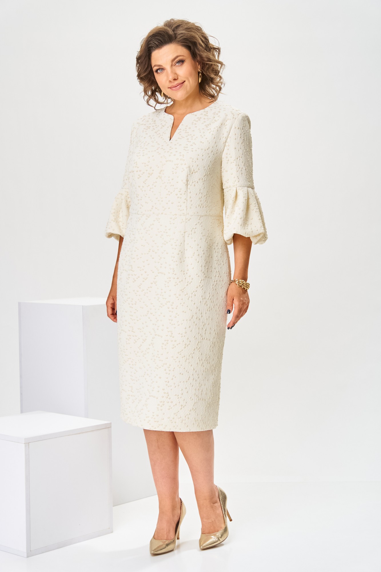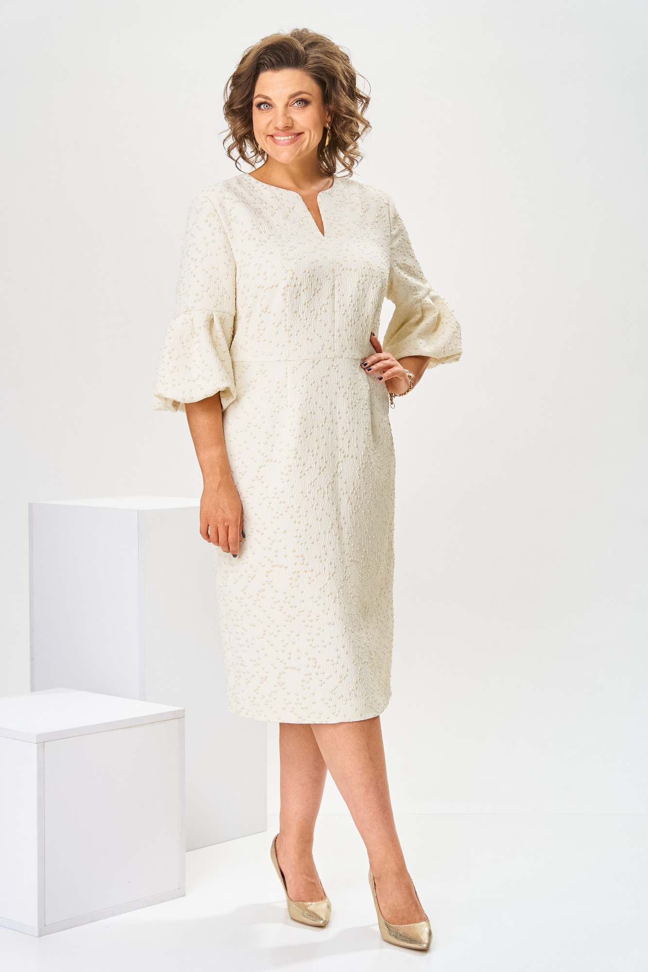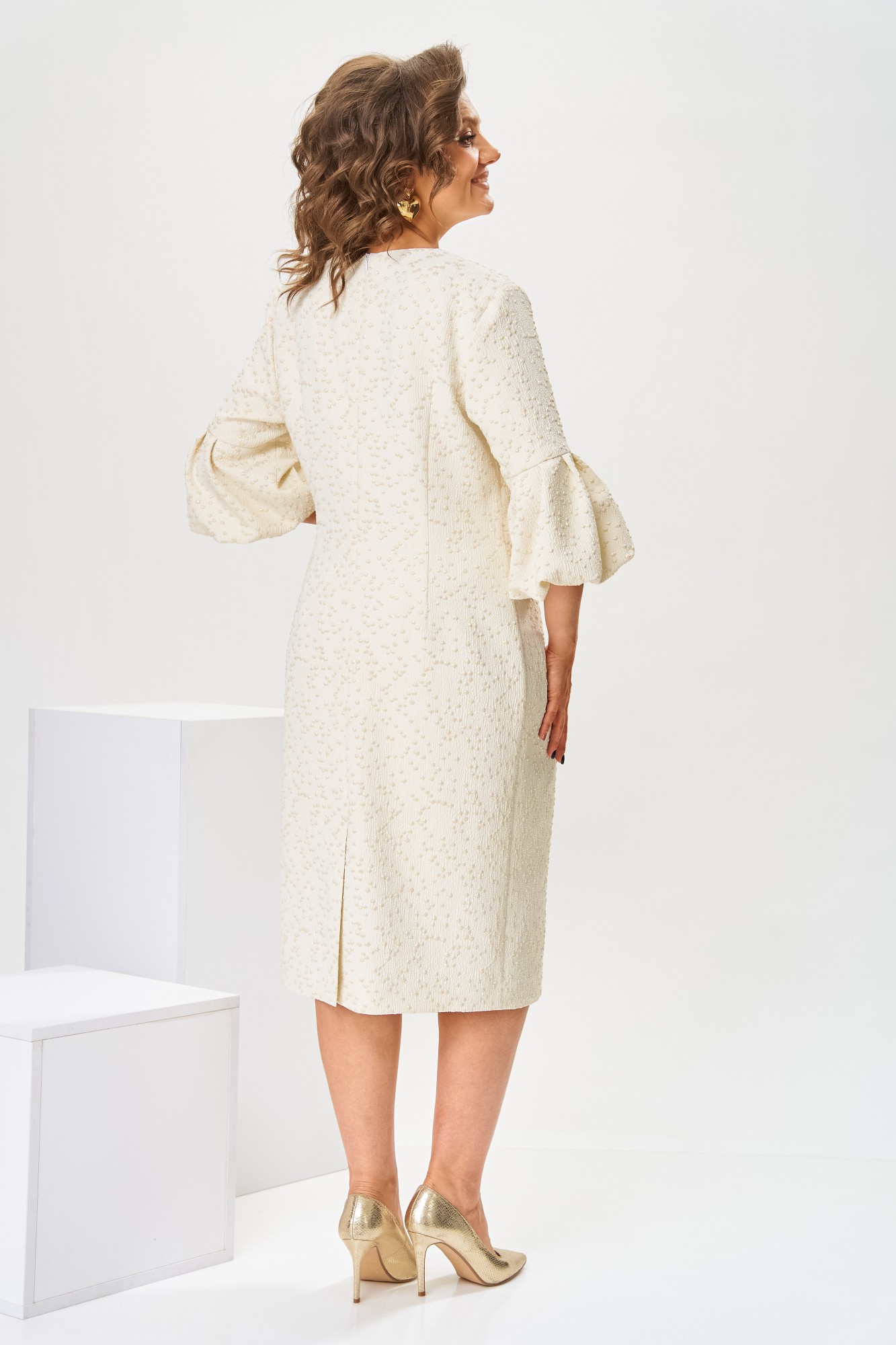 Платье женское, относится к торжественной нарядной одежде. Платье женское, полу прилегающего силуэта, длиной ниже колена. Перед отрезной по линии талии. Верхняя часть переда со средним швом и 2-мя таллиевыми вытачками, нижняя часть с 2-мя таллиевыми вытачками. Спинка с 2-мя таллиевыми вытачками и средним швом, заканчивающимся шлицей. Горловина фигурная, обточная, без воротника. Застёжка на потайную тесьму-молнию в среднем шве спинки. Рукав втачной, одно шовный, длиной 3/4, с горизонтальным разрезом, нижняя часть рукава с 5-ю односторонними складками, со сборкой по низу, низ обточной. Платье на подкладке с плечевыми накладками.