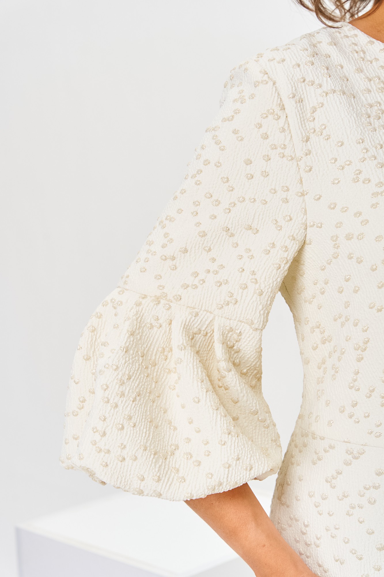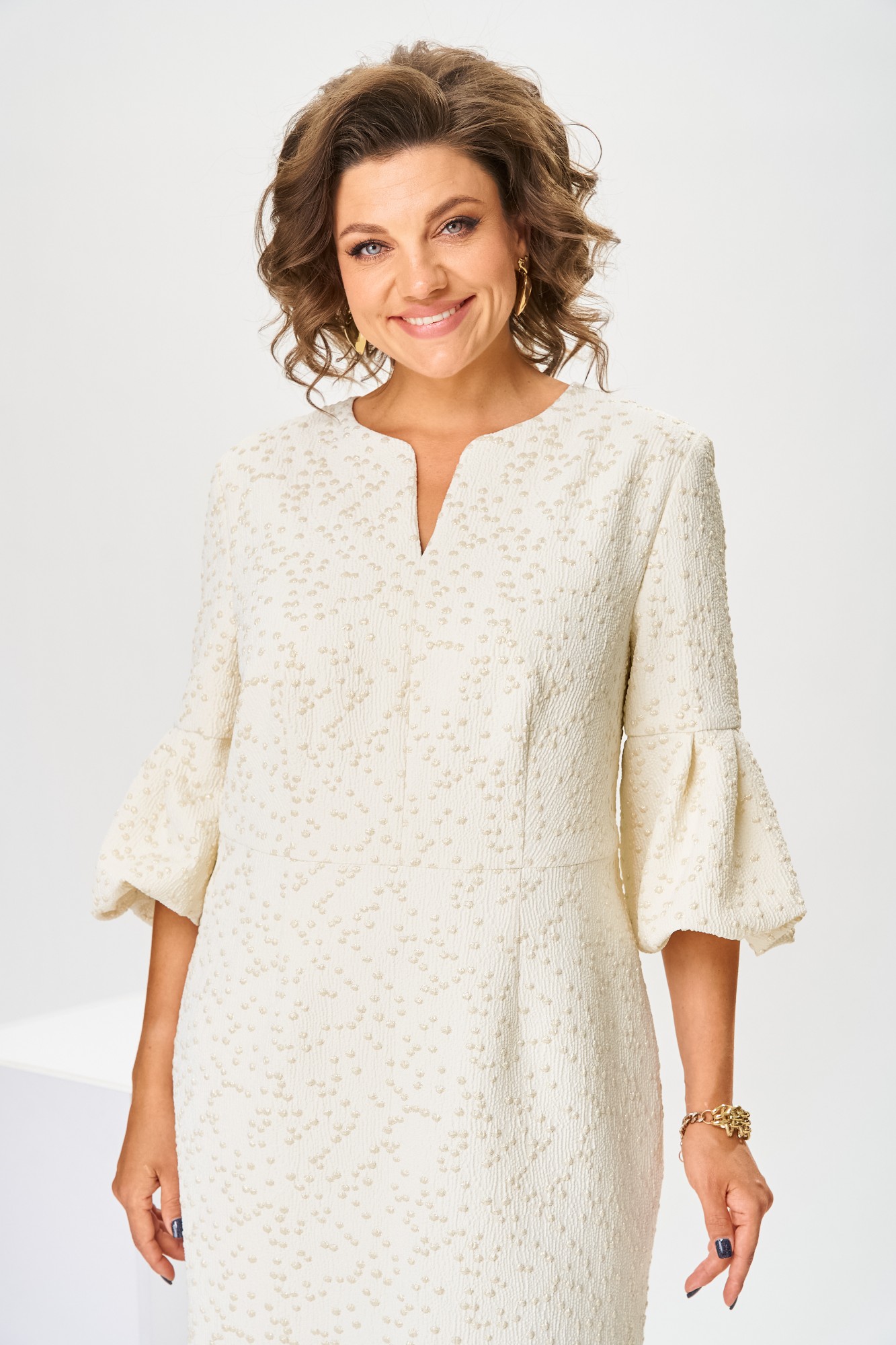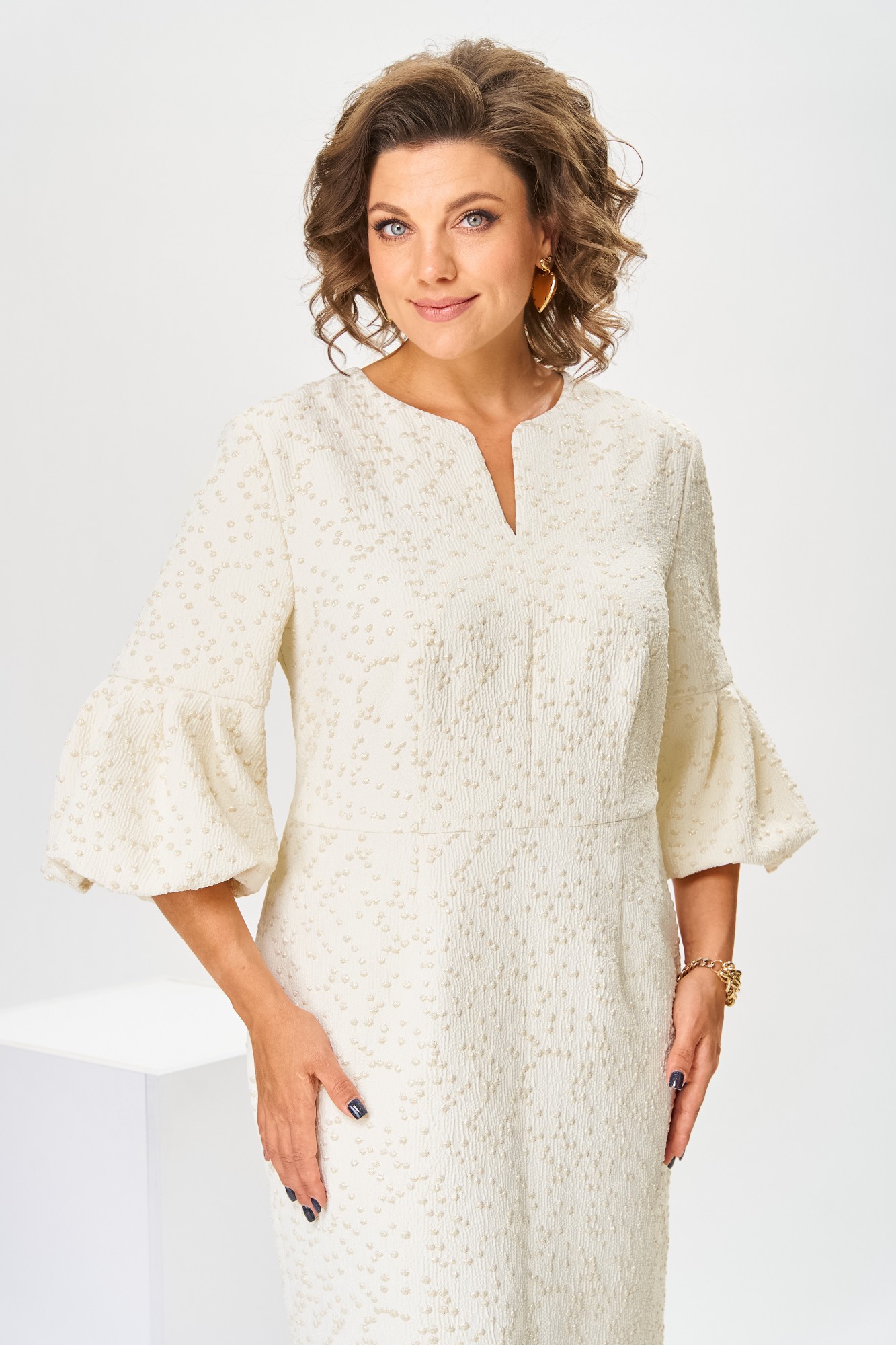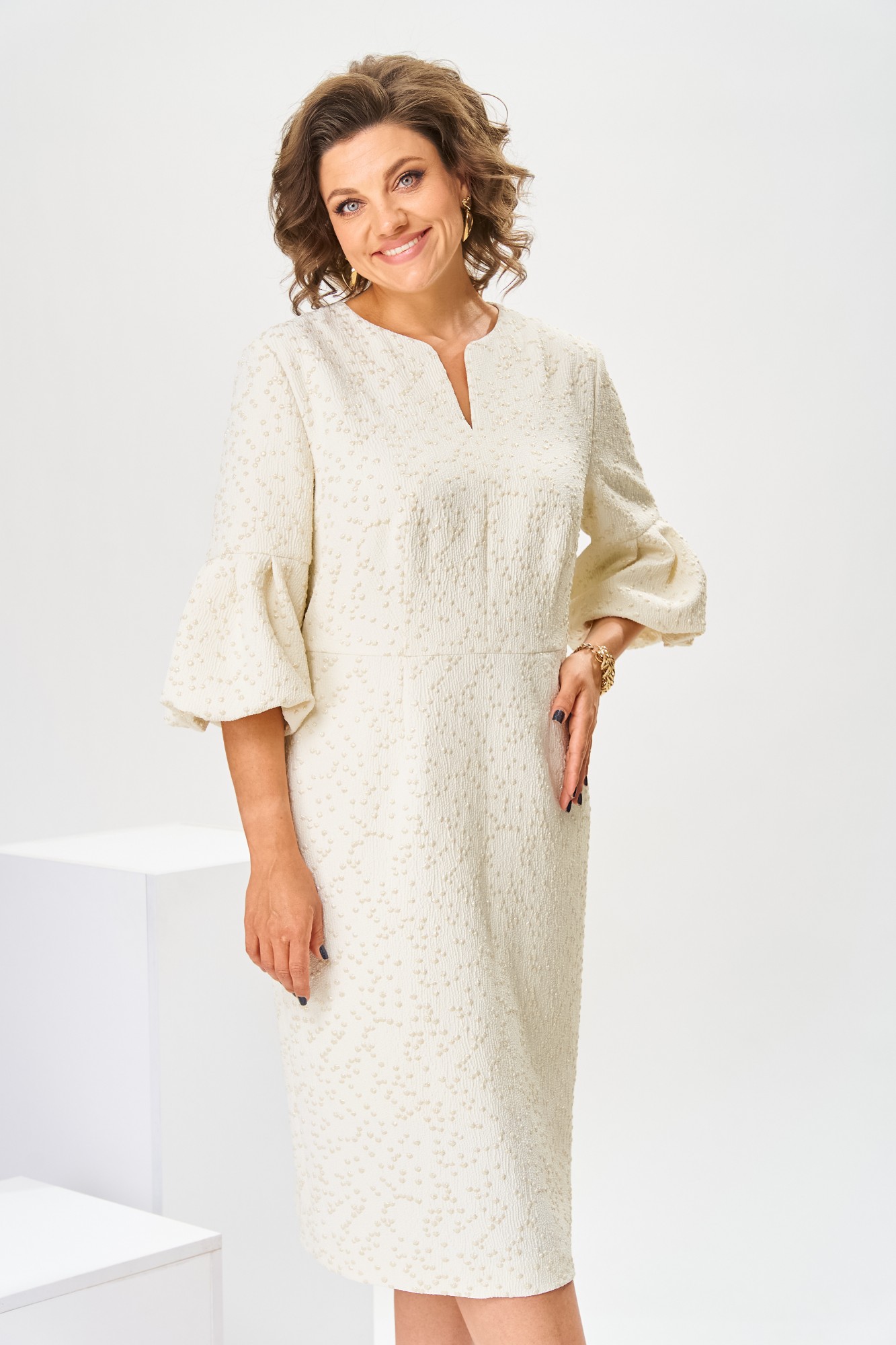 Платье женское, относится к торжественной нарядной одежде. Платье женское, полу прилегающего силуэта, длиной ниже колена. Перед отрезной по линии талии. Верхняя часть переда со средним швом и 2-мя таллиевыми вытачками, нижняя часть с 2-мя таллиевыми вытачками. Спинка с 2-мя таллиевыми вытачками и средним швом, заканчивающимся шлицей. Горловина фигурная, обточная, без воротника. Застёжка на потайную тесьму-молнию в среднем шве спинки. Рукав втачной, одно шовный, длиной 3/4, с горизонтальным разрезом, нижняя часть рукава с 5-ю односторонними складками, со сборкой по низу, низ обточной. Платье на подкладке с плечевыми накладками.
