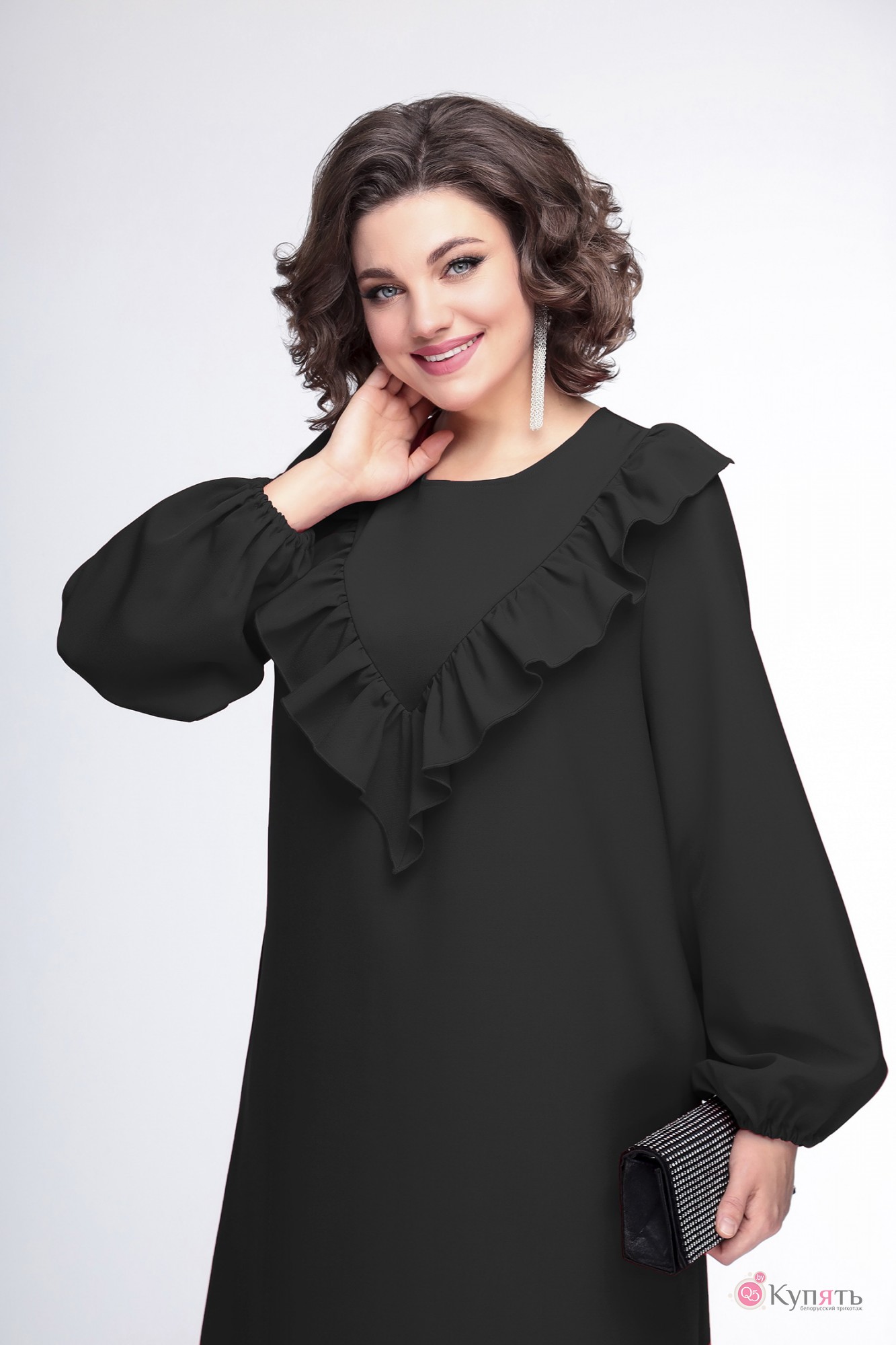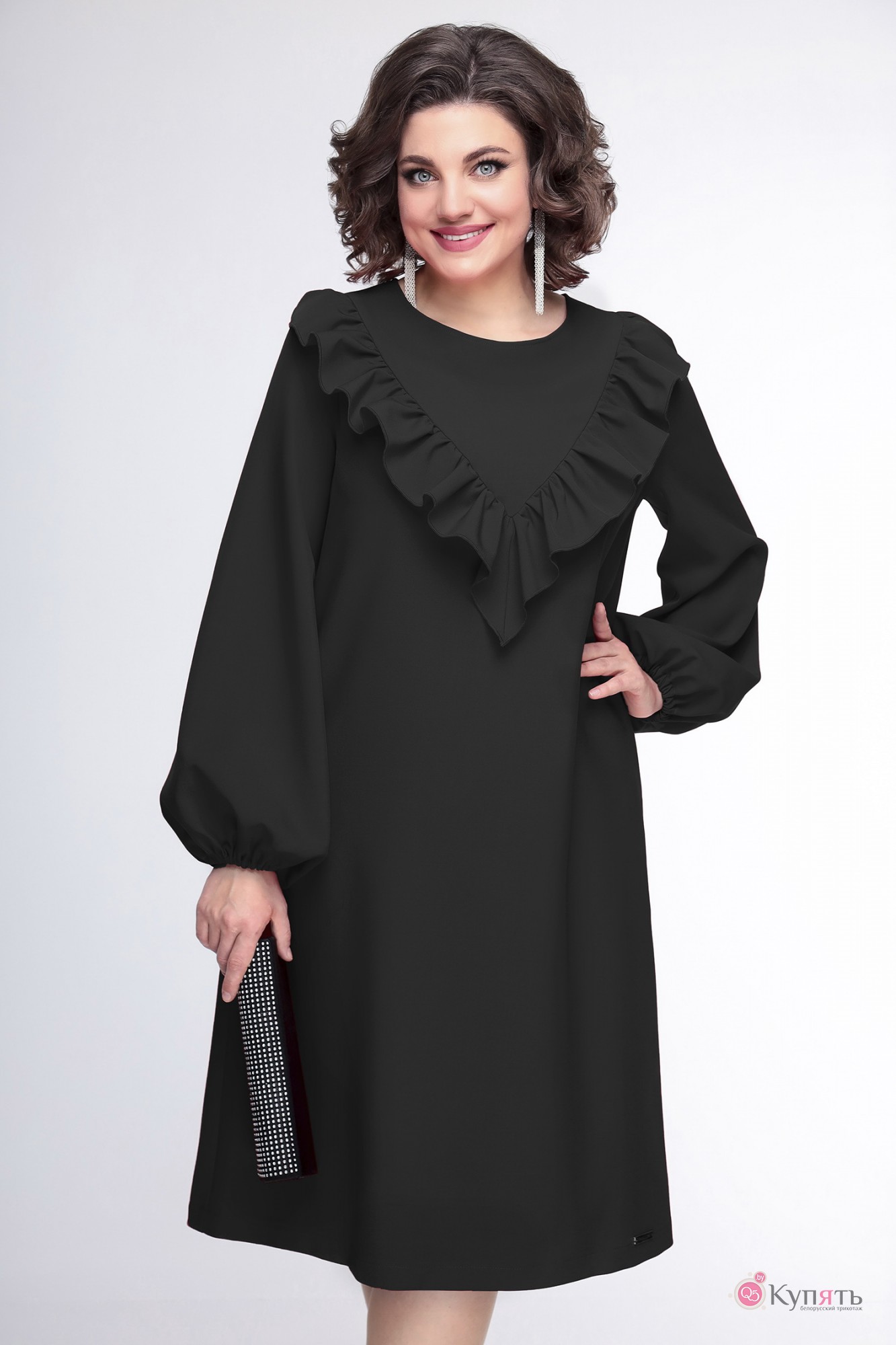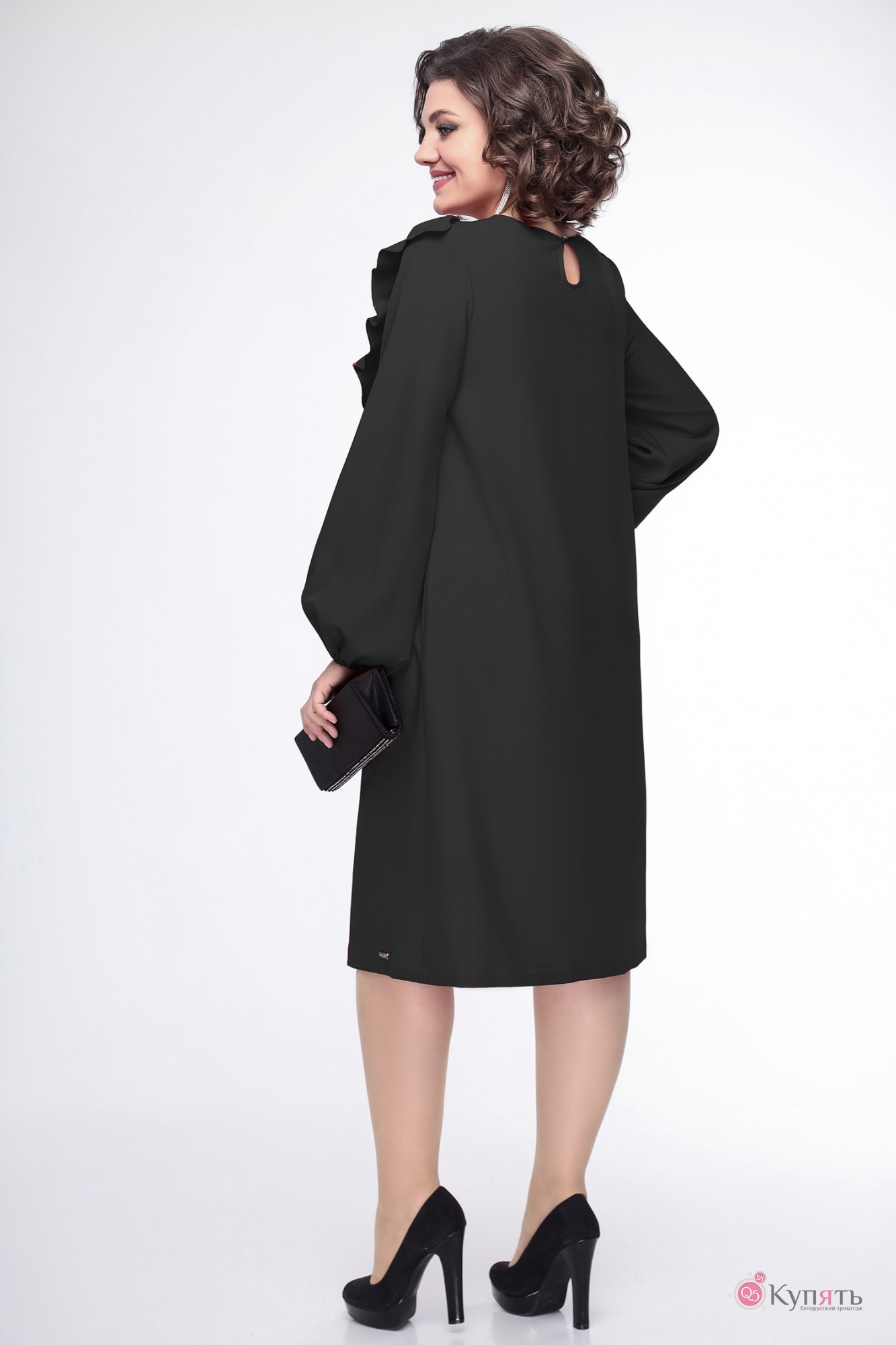 Платье женское прямого силуэта. Выполнено из плательной ткани. Платье с длинными объёмными рукавами, по низу которых, вставлена эластичная тесьма. От линии плеча до центральной части переда, расположена отрезная кокетка, в которую вставлен декоративный волан на сборке. В нижней части платья пришит фирменный логотип. Спинка платья цельнокроеная. В области горловины – капелька, застёгивающаяся на навесную петлю и декоративную пуговицу.