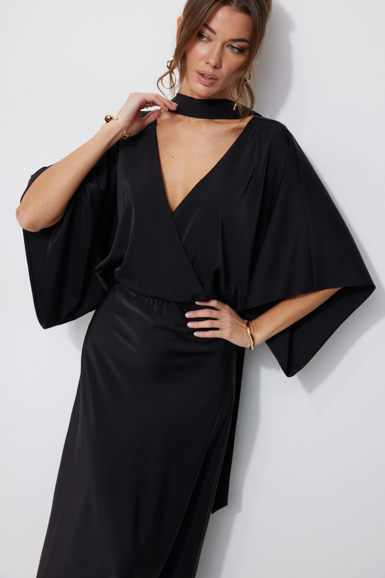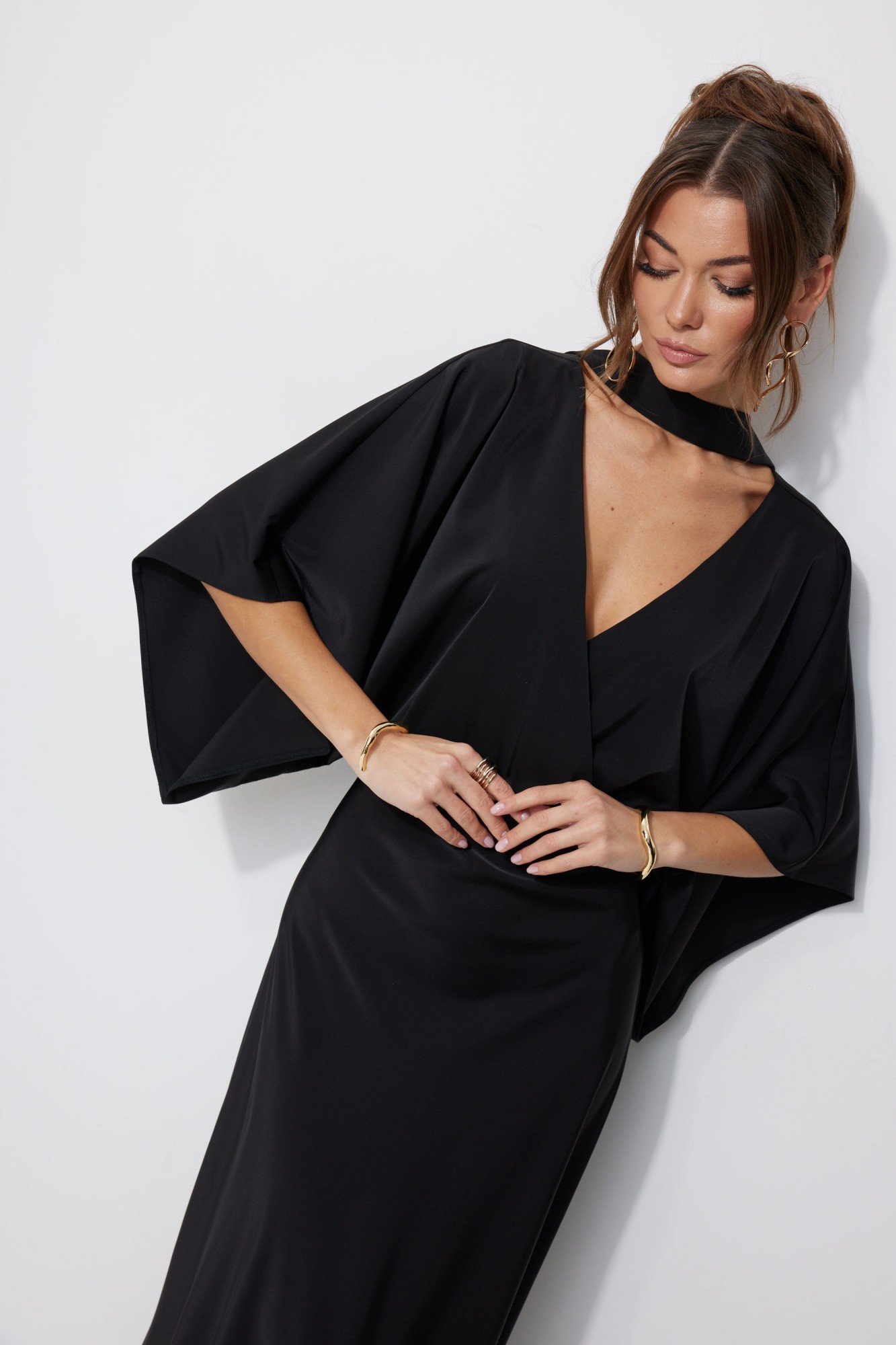 Нарядное платье из струящейся ткани, длина макси. Платье полуприлегающего силуэта. Отрезное по линии талии, с резинкой. По переду запах. По спинке глубокий V-образный вырез горловины. Рукав цельнокроеный, расширенный, длина немного ниже линии локтя. Юбка покроена по косой, силуэт расширяется к низу. Платье дополняется мягким поясом из основной ткани. Его можно использовать, как шаль, повязав на шею, либо, как пояс - на талию.