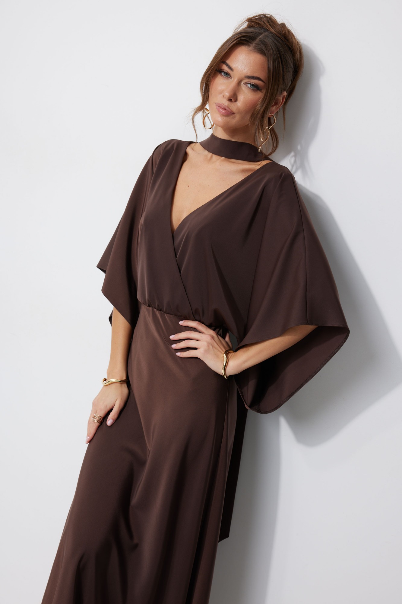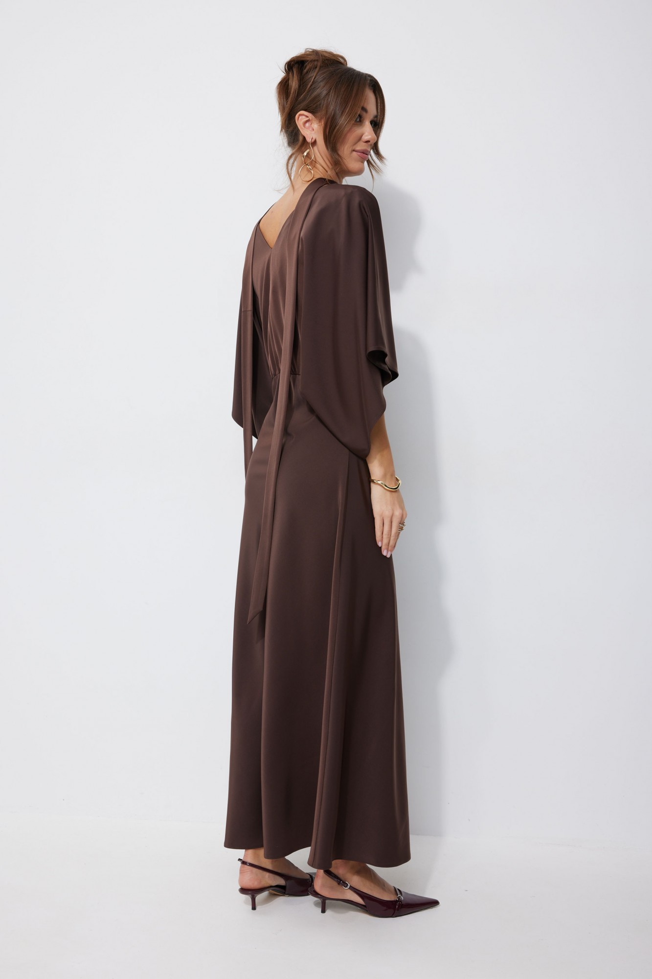 Нарядное платье из струящейся ткани, длина макси. Платье полуприлегающего силуэта. Отрезное по линии талии, с резинкой. По переду запах. По спинке глубокий V-образный вырез горловины. Рукав цельнокроеный, расширенный, длина немного ниже линии локтя. Юбка покроена по косой, силуэт расширяется к низу. Платье дополняется мягким поясом из основной ткани. Его можно использовать, как шаль, повязав на шею, либо, как пояс - на талию.