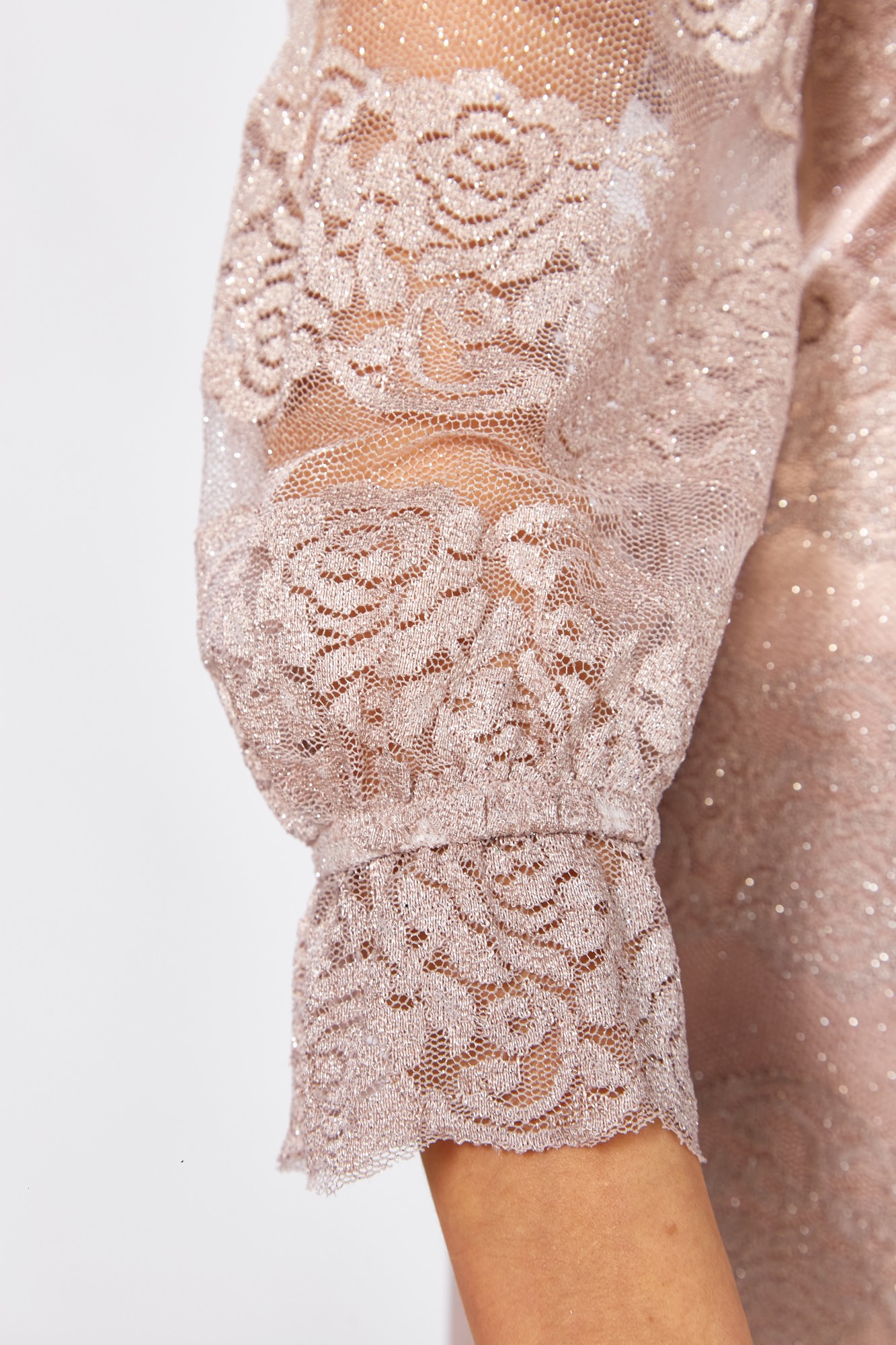 Нарядное женское платье полу-прилегающего силуэта, выполнено из гипюра с глитером и текстиля. Лиф платья отрезной по линии талии, с вытачками, на лифе обработана застежка на петли-пуговицы. Юбка платья прямого покроя, выполнена из гипюра с глитером. Спинка выполнена из однотона (текстиля), со средним швом и вытачками, в среднем шве по низу шлица. Рукав выполнен из гипюра с глитером, расклешенный к низу и присборен на манжет из гипюра. Элегантное платье отличный выбор для вашего образа на любое мероприятие!