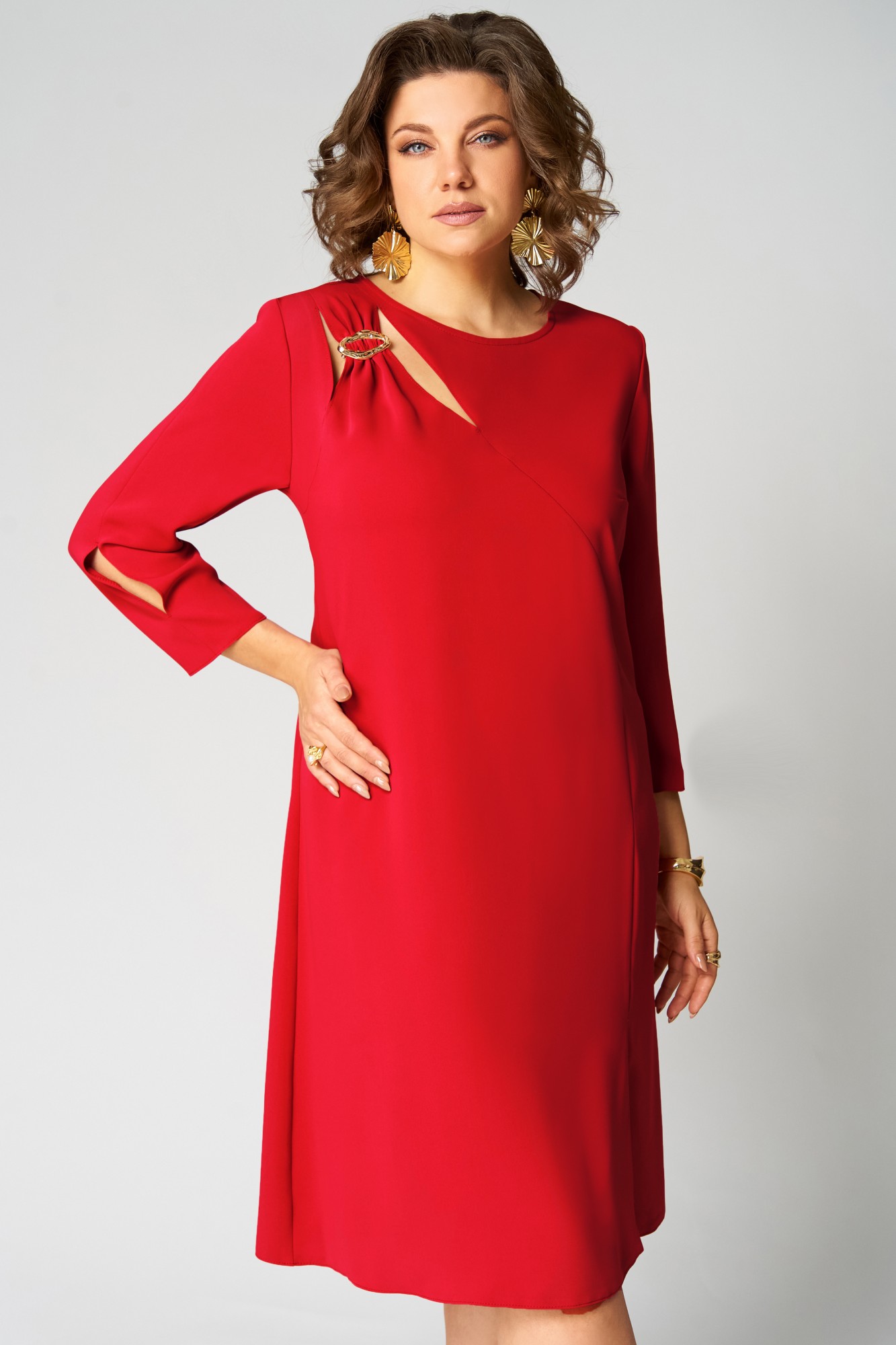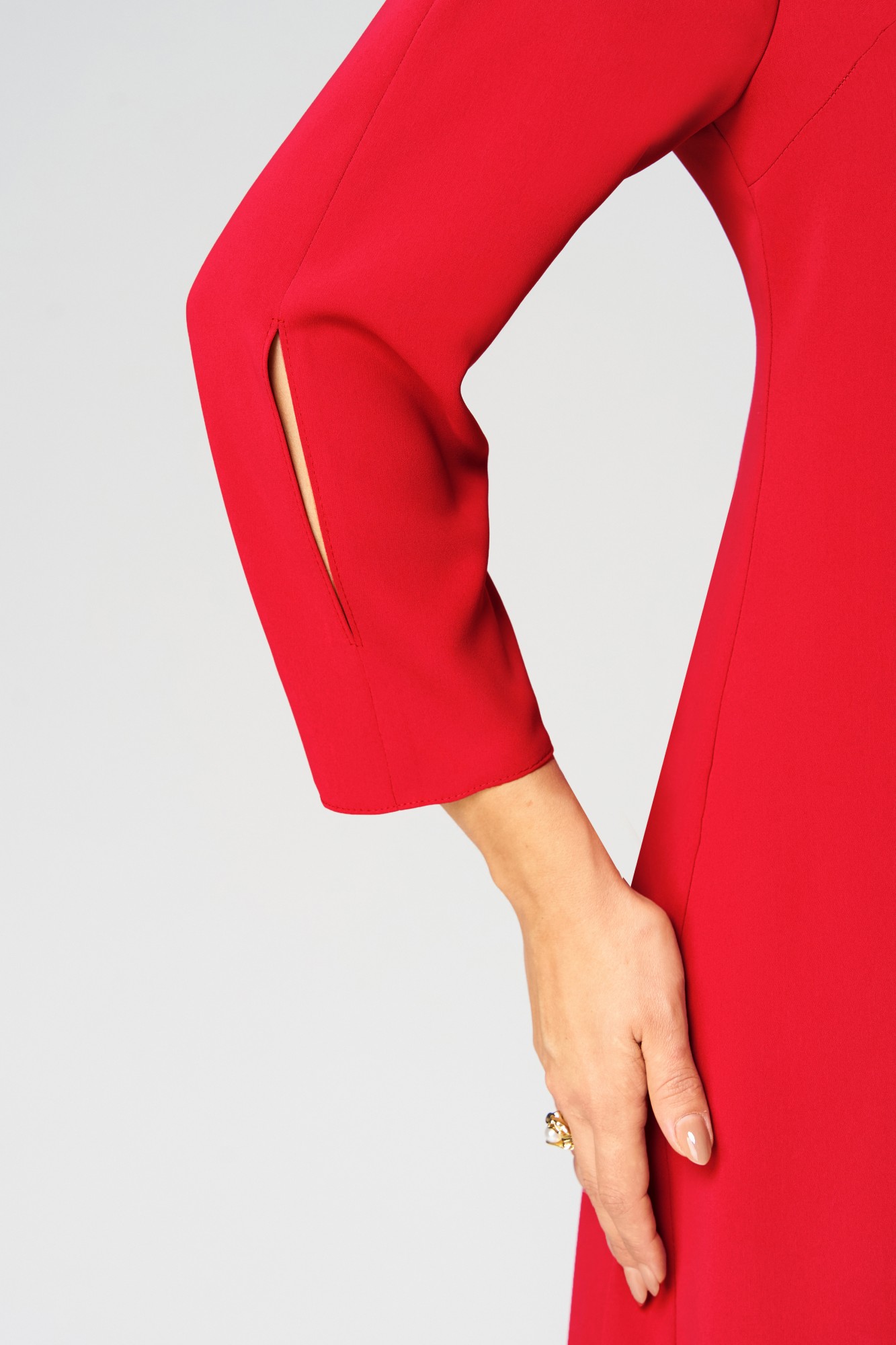 Нарядное платье А- силуэта, без подкладки.  Округлый вырез горловины обработан бейкой. Перед с фигурным подрезом и разрезом по низу. По правой стороне переда легкая драпировка с декоративной пряжкой и двумя вырезами.  Рукав втачной, двухшовный с вертикальным разрезом в локтевом шве. Спинка со средним швом и застежкой сзади на потайную тесьму-молнию.