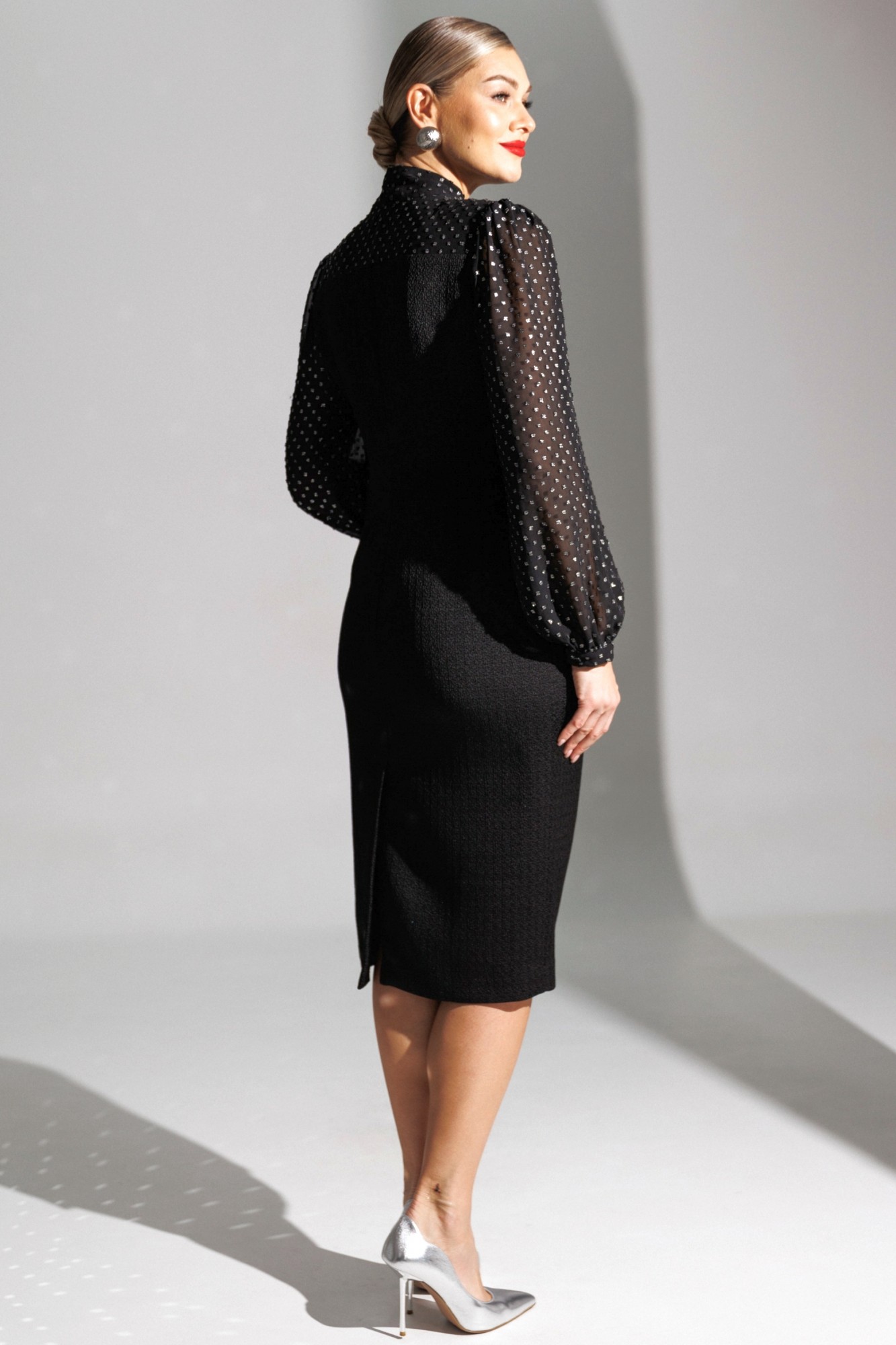 Платье прилегающего силуэта, с накладными декоративными клапанами по переду. Рукав одношовный, со сборкой по низу и на манжете, сборка по верхней части рукава. Рукав, кокетка переда и спинки, воротник-бант выполнены из ткани шифон в горошек. Воротник-бант декоративный , с длинными хвостами. По задней половинке с таллиевыми вытачками и шпицей.