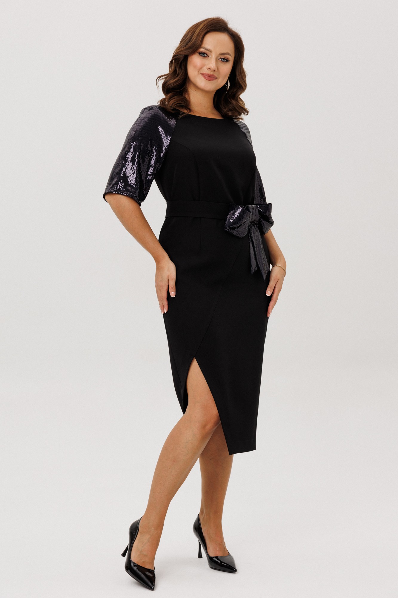 Нарядное женское платье, выполненное из двух видов ткани: плательно-костюмной (тянется ) и плательной с пайетками (тянется). Платье полуприлегающего силуэта, покроя «Реглан». По переду ассиметричный подрез, переходящий в рельеф. Рельеф переходит в таллиевую вытачку. По спинке средний шов, потайная застежка-молния и таллиевые вытачки. Низ переда и спинки фигурной формы с разрезом по переду. Горловина округлой формы. Рукава-реглан со швом по середине и на подкладке. Само платье без подкладки. В комплект входит съемный пояс, выполненный из основной ткани, декорированный пышным бантом из пайеток.